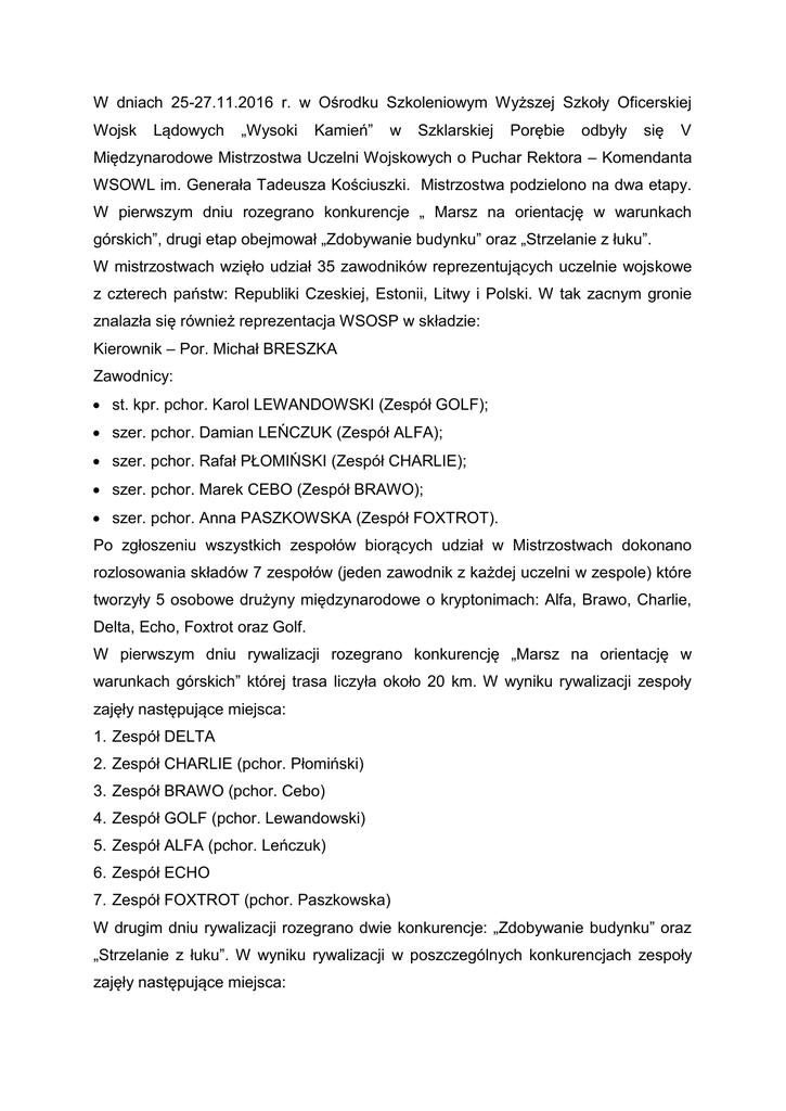 W dniach 25-27.11.2016 r. w Ośrodku Szkoleniowym Wyższej Szkoły Oficerskiej Wojsk Lądowych „Wysoki Kamień” w Szklarskiej Porębie odbyły się V Międzynarodowe Mistrzostwa Uczelni Wojskowych o Puchar Rektora – Komendanta WSOWL im. Generała Tadeusza Kościuszki. Mistrzostwa podzielono na dwa etapy. W pierwszym dniu rozegrano konkurencje „ Marsz na orientację w warunkach górskich”, drugi etap obejmował „Zdobywanie budynku” oraz „Strzelanie z łuku”. W mistrzostwach wzięło udział 35 zawodników reprezentujących uczelnie wojskowe z czterech państw: Republiki Czeskiej, Estonii, Litwy i Polski. W tak zacnym gronie znalazła się również reprezentacja WSOSP w składzie: Kierownik – Por. Michał BRESZKA Zawodnicy: st. kpr. pchor. Karol LEWANDOWSKI (Zespół GOLF); szer. pchor. Damian LEŃCZUK (Zespół ALFA); szer. pchor. Rafał PŁOMIŃSKI (Zespół CHARLIE); szer. pchor. Marek CEBO (Zespół BRAWO); szer. pchor. Anna PASZKOWSKA (Zespół FOXTROT). Po zgłoszeniu wszystkich zespołów biorących udział w Mistrzostwach dokonano rozlosowania składów 7 zespołów (jeden zawodnik z każdej uczelni w zespole) które tworzyły 5 osobowe drużyny międzynarodowe o kryptonimach: Alfa, Brawo, Charlie, Delta, Echo, Foxtrot oraz Golf. W pierwszym dniu rywalizacji rozegrano konkurencję „Marsz na orientację w warunkach górskich” której trasa liczyła około 20 km. W wyniku rywalizacji zespoły zajęły następujące miejsca: 1. Zespół DELTA 2. Zespół CHARLIE (pchor. Płomiński) 3. Zespół BRAWO (pchor. Cebo) 4. Zespół GOLF (pchor. Lewandowski) 5. Zespół ALFA (pchor. Leńczuk) 6. Zespół ECHO 7. Zespół FOXTROT (pchor. Paszkowska) W drugim dniu rywalizacji rozegrano dwie konkurencje: „Zdobywanie budynku” oraz „Strzelanie z łuku”. W wyniku rywalizacji w poszczególnych konkurencjach zespoły zajęły następujące miejsca: Konkurencja: „Zdobywanie budynku”: 1. Zespół BRAWO (pchor. CEBO) 2. Zespół ECHO 3. Zespół FOXTROT (pchor. PASZKOWSKA) 4. Zespół DELTA 5. Zespół CHARLIE (pchor. Płomiński) 6. Zespół ALFA (pchor. Leńczuk) 7. Zespół GOLF (pchor. Lewandowski) Konkurencja „Strzelanie z łuku”: 1. Zespół ECHO 2. Zespół ALFA (pchor. Leńczuk) 3. Zespół CHARLIE (pchor. Płomiński) 4. Zespół DELTA 5. Zespół GOLF (pchor. Lewandowski) 6. Zespół FOXTROT (pchor. Paszkowska) 7. Zespół BRAWO (pchor. CEBO). W klasyfikacji generalnej mistrzostw wygrała zespół DELTA, drugie miejsce zajął zespół ECHO oraz trzecie miejsce zajęła drużyna CHARLIE z pchor. Płomińskim w składzie. Dekoracji najlepszych zespołów dokonał prorektor ds. wojskowych WSOWL cz.p.o. pan ppłk dr Marek PYTEL.