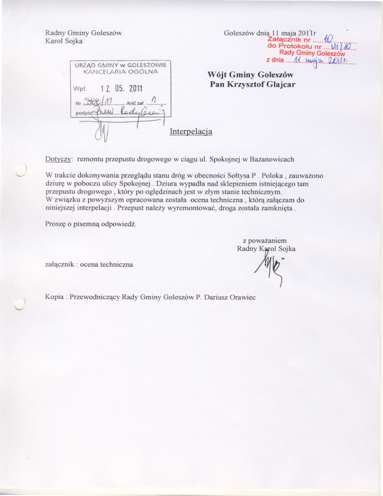 ']+]]ł $r..rr'l!L*Ź Radny Gminy GoleszÓw Karol Sojka URZĄD 6[M|NVw GOffisZOW|E KANCE|-ARłAoGÓLNA wójt Gminy Goleszów Pan Krrysztof Glajcar titrpt. 1?.,05, 2011 lnn A ',l' ilość za|.....'i].'..-.. !.l...!.,.'...... Interpelacja Dotyczy: remontuprzepustudrogowegow ciąguul. Spokojnejw Bazanowicach W trakciedokonywaniaprzegIądu stanudróg w obecności SoĘsa P . Poloka ,zalwilŻono dziuręw poboczuulicy Spokojnej. Dziura wypadłanad sklepieniemistniejącegotam przepustudrogowego, który po oględzinachjest w zĘm stanietechnicznym. W zwią.zkuzpovryŻszymopracowanazostał'a ocenatechniczna,którązałączamdo niniejszejinterpelacji.Przepustna|eżywyremontować'drogazostałazamknięta. Proszęo pisemnąodpowiedz. "^*,ry* zpowaz.aruem załącznLk: ocenatechniczna Kopia : PrzewodniczącyRady Gminy Goleszów P. Dariusz orawiec Ocena techniczna dziuraw poboczu W wyniku objazdustanudróg w sołectwieBazanowiezostałazau:ważzona drogi nad przepustemw ciąguul. Spokojnej. Po ustnymzgtoszeniufa|łaprzez SołtysaBazanowicP. Poloka udałemsię na miejsceaby osobiściezbadaćzagroŻetie. W wyniku oględzinstwierdzam: 1. przepustdrogowysklepiony(tukowy)wykonanyjestz ciosów,/ bloków kamiennych/ na zaprawiecementowejwybudowanyw 1886roku. 2. stan techniczny jest zĘ. Na skutekkorozji lzlnetrzałejlzaprawy,bloczki kamienne wypadająosłabiająckonstrukcjęprzepustuszczególniew miejscachna poboczachdrogi tworzączagrożetie.Sklepieniepodjezdnią orazruaczołachsąjeszczew miarędobrejednak wymagająkonserwacji.Na prawympoboczucałkowiciewypadładziura.Dziuręobecnie zabezpieczono krawęznikamidrogowyrni (załatanoją doraźnie). 3. Drogę zamkniętoprzez ustawienieznakudrogowegozakazruchu. 4. Z przyczółkówtez wypadłybloczki kamiennetworzącduzewnęki 5. Koryto cieku przepustujest wymytew związkuZ czym wodapodmywafundamenty Wnioski: Zły stantechnicznyprzepustuwymagaprzeprowadzenia remontu. Zakresprac jest nastęu]ący : 1..podszałowaó-zadekowaćod dołudziurawesklepienie/podpoboczamidrogil 2. odkrycie_ odkopanietych miejsc z góry celemdojścia do konstrukcjisklepienia, po czym zabetonowaói wypełnićubytki sklepieniamasąbetonowąZ wykonaniemzbrojeniafuku gotowąsiatkązbrojeniowągórąi dołem@ 14-16 3. wykonanienarzutukamiennegogrubego,jedno-frakcyjnego tłuczniana dnie koryta przepustud|a zabezpięczętiaprzedwypłukiwaniemi podmywaniemfundamentów 4. wypełniczaprawącementowąskorodowanespoiny. Wypadniętekamienie w przyczołkachuzupełniÓbloczkami betonowymi. Koszt remontuwstępnieszacujęsię na wartośó 10-15tysń. Bazanowie dnia 2 maia 20Ih. Karol Sojka- Radny Gminy Goleszów / uprawniony inżl.drogowo_ mostowy/ /vvl, kopie: Urząd Gminy Goleszów SołectwoBazanowice r [\