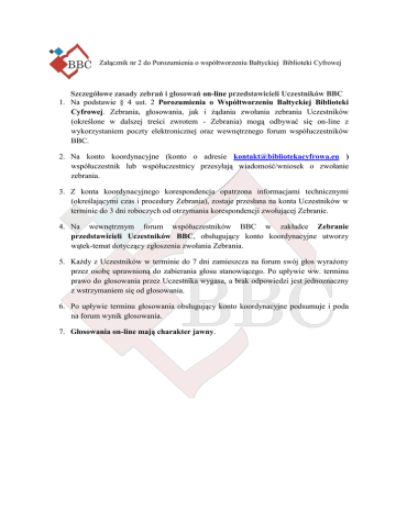 Załącznik nr 2 do Porozumienia o współtworzeniu Bałtyckiej Biblioteki Cyfrowej Szczegółowe zasady zebrań i głosowań on-line przedstawicieli Uczestników BBC 1. Na podstawie § 4 ust. 2 Porozumienia o Współtworzeniu Bałtyckiej Biblioteki Cyfrowej. Zebrania, głosowania, jak i żądania zwołania zebrania Uczestników (określone w dalszej treści zwrotem - Zebrania) mogą odbywać się on-line z wykorzystaniem poczty elektronicznej oraz wewnętrznego forum współuczestników BBC. 2. Na konto koordynacyjne (konto o adresie [email protected] ) współuczestnik lub współuczestnicy przesyłają wiadomość/wniosek o zwołanie zebrania. 3. Z konta koordynacyjnego korespondencja opatrzona informacjami technicznymi (określającymi czas i procedury Zebrania), zostaje przesłana na konta Uczestników w terminie do 3 dni roboczych od otrzymania korespondencji zwołującej Zebranie. 4. Na wewnętrznym forum współuczestników BBC w zakładce Zebranie przedstawicieli Uczestników BBC, obsługujący konto koordynacyjne utworzy wątek-temat dotyczący zgłoszenia zwołania Zebrania. 5. Każdy z Uczestników w terminie do 7 dni zamieszcza na forum swój głos wyrażony przez osobę uprawnioną do zabierania głosu stanowiącego. Po upływie ww. terminu prawo do głosowania przez Uczestnika wygasa, a brak odpowiedzi jest jednoznaczny z wstrzymaniem się od głosowania. 6. Po upływie terminu głosowania obsługujący konto koordynacyjne podsumuje i poda na forum wynik głosowania. 7. Głosowania on-line mają charakter jawny.