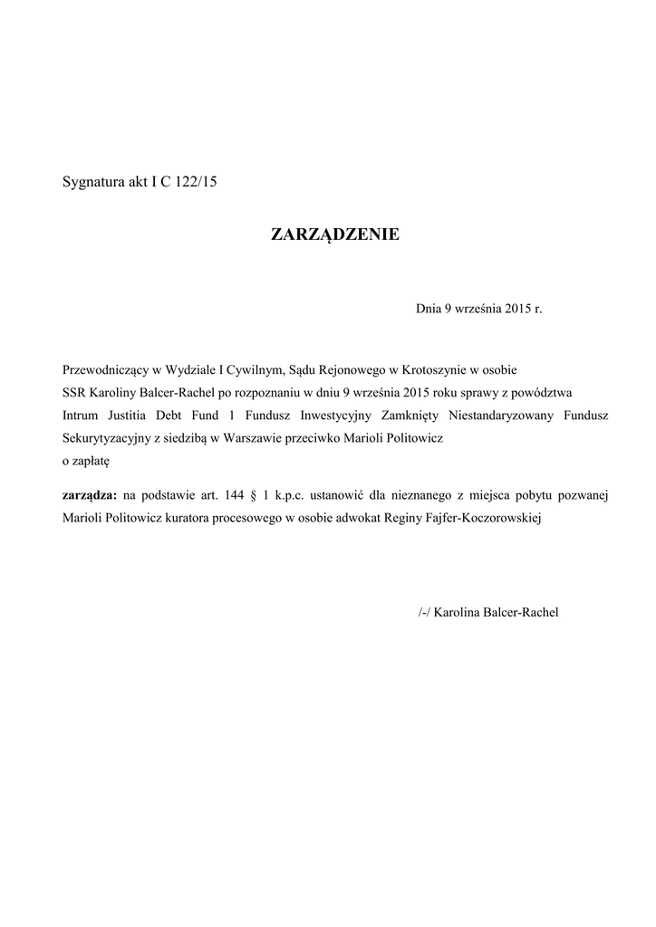 Sygnatura akt I C 122/15 ZARZĄDZENIE Dnia 9 września 2015 r. Przewodniczący w Wydziale I Cywilnym, Sądu Rejonowego w Krotoszynie w osobie SSR Karoliny Balcer-Rachel po rozpoznaniu w dniu 9 września 2015 roku sprawy z powództwa Intrum Justitia Debt Fund 1 Fundusz Inwestycyjny Zamknięty Niestandaryzowany Fundusz Sekurytyzacyjny z siedzibą w Warszawie przeciwko Marioli Politowicz o zapłatę zarządza: na podstawie art. 144 § 1 k.p.c. ustanowić dla nieznanego z miejsca pobytu pozwanej Marioli Politowicz kuratora procesowego w osobie adwokat Reginy Fajfer-Koczorowskiej /-/ Karolina Balcer-Rachel