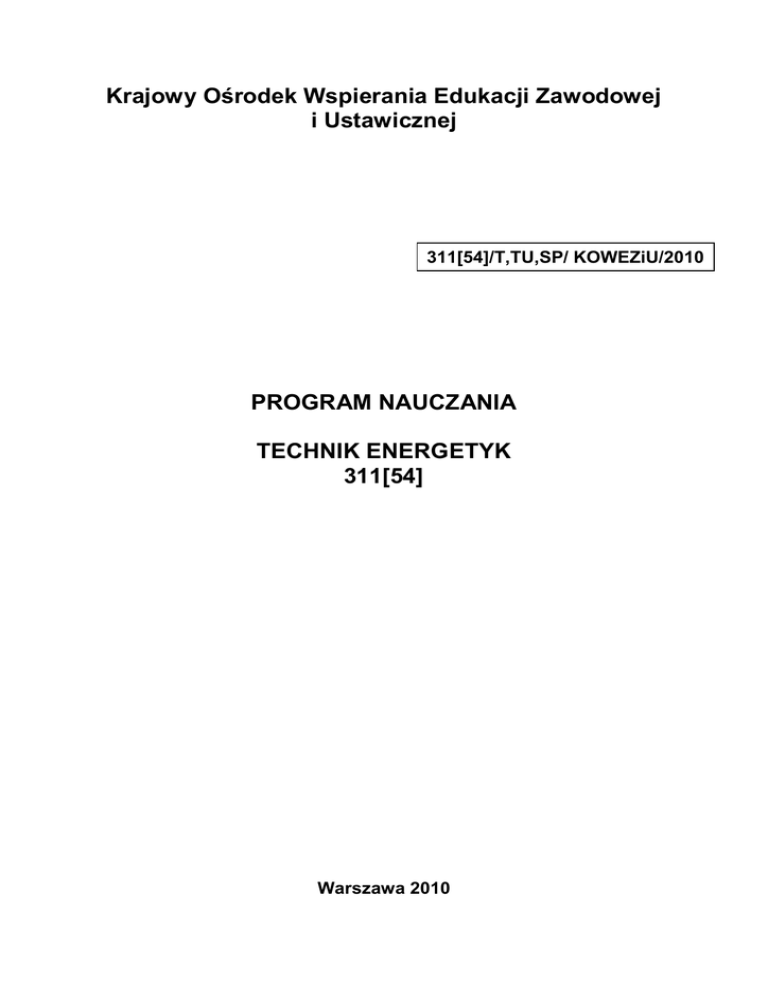 Krajowy Ośrodek Wspierania Edukacji Zawodowej i Ustawicznej 311[54]/T,TU,SP/ KOWEZiU/2010 PROGRAM NAUCZANIA TECHNIK ENERGETYK 311[54] Warszawa 2010 Autorzy: mgr inŜ. Tomasz Madej mgr inŜ. Janina Dretkiewicz-Więch mgr inŜ. Krystyna Więcławek dr inŜ. Marek Wiśniewski Recenzenci: mgr inŜ. Jan Bogdan prof. dr hab. inŜ. Jan Łach Opracowanie redakcyjne: mgr Kazimiera Tarłowska Opracowanie techniczne: mgr Rafał Auch-Szkoda 1 Spis treści I. Plany nauczania 3 II. Programy nauczania przedmiotów zawodowych 1. Podstawy konstrukcji maszyn 2. Technologia mechaniczna 3. Elektrotechnika i elektronika 4. Pracownia automatyki 5. Pracownia termodynamiki i mechaniki płynów 6. Technologie procesów energetycznych 7. Eksploatacja maszyn i urządzeń energetycznych 8. Zajęcia praktyczne 9. Język obcy zawodowy 10. Praktyka zawodowa 2 4 4 13 22 37 44 54 68 80 87 92 I. PLANY NAUCZANIA PLAN NAUCZANIA Technikum czteroletnie Zawód: technik energetyk 311[54] Podbudowa programowa: gimnazjum Lp. 1. 2. 3. 4. Przedmioty nauczania Podstawy konstrukcji maszyn Technologia mechaniczna Elektrotechnika i elektronika Pracownia automatyki Pracownia termodynamiki 5. i mechaniki płynów Technologie procesów 6. energetycznych Eksploatacja maszyn i 7. urządzeń energetycznych 8. Zajęcia praktyczne 9. Język obcy zawodowy 10. Specjalizacja* Razem Praktyka zawodowa: 4 tygodnie ∗ Dla młodzieŜy Dla dorosłych Liczba Liczba Liczba godzin godzin godzin tygodniowo tygodniowo w czteroletnim w czteroletnim w czteroletnim okresie okresie okresie nauczania nauczania nauczania Semestry I-VIII Klasy I-IV Forma Forma stacjonarna zaoczna 4 3 50 3 2 38 8 6 101 4 3 50 5 3 63 6 4 76 5 3 63 8 2 5 50 6 2 3 35 101 25 63 630 Program nauczania wybranej specjalizacji w zawodzie opracowany przez nauczyciela powinien uzyskać pozytywną opinię szkolnego zespołu przedmiotowego właściwego zawodu 3 II. PROGRAMY NAUCZANIA PRZEDMIOTÓW ZAWODOWYCH PODSTAWY KONSTRUKCJI MASZYN Szczegółowe cele kształcenia W wyniku procesu kształcenia uczeń (słuchacz) powinien umieć: − scharakteryzować rodzaje rysunków technicznych, − określić zastosowanie róŜnych rodzajów linii rysunkowych, − wykonać rysunki części maszyn w rzutach aksonometrycznych i prostokątnych, − zwymiarować rysunek, − zastosować oznaczenia stanu powierzchni, tolerancji kształtu i połoŜenia, − zastosować uproszczenia rysunkowe, − wykonać szkice typowych części maszyn, − odczytać informację z dokumentacji technicznej oraz zinterpretować zamieszczone w niej oznaczenia, − wykorzystać technikę komputerową do sporządzania rysunków technicznych, − zastosować zasady mechaniki technicznej, − wykonać podstawowe działania na wektorach, − określić warunki równowagi ciała sztywnego, − obliczyć prędkość obrotową, pracę mechaniczną, moc, energię, sprawność, – wyznaczyć siłę tarcia tocznego i ślizgowego, – scharakteryzować wywaŜanie statyczne i dynamiczne, – scharakteryzować statyczną próbę rozciągania, − rozróŜnić rodzaje odkształceń i napręŜeń oraz wyjaśnić pojęcie napręŜenia dopuszczalnego, − rozróŜnić rodzaje obciąŜeń elementów konstrukcyjnych, − obliczyć napręŜenie w elementach ściskanych i rozciąganych, − obliczyć napręŜenia gnące i skręcające w przypadku obciąŜenia wału, − rozróŜnić konstrukcje połączeń, − określić zasady konstruowania osi i wałów, − scharakteryzować warunki pracy łoŜysk oraz metody ich smarowania, − dobrać łoŜyska do określonych warunków pracy, − sklasyfikować hamulce, sprzęgła i przekładnie mechaniczne, − wyjaśnić budowę i zasadę działania hamulców, sprzęgieł i przekładni mechanicznych, 4 − wyjaśnić budowę i zasadę działania mechanizmów, − określić na podstawie dokumentacji technicznej elementy składowe maszyny lub urządzenia, − wykonać projekt części maszyny, − skorzystać z Polskich Norm, poradników i katalogów. Materiał nauczania 1. Rysunek techniczny Rodzaje rysunków. Normalizacja rysunku technicznego. Pismo techniczne. Linie rysunkowe i ich zastosowanie. Arkusz rysunkowy. Rzuty prostokątne. Rzuty aksonometryczne. Widoki i przekroje rysunkowe. Zasady wymiarowania rysunków. Uproszczenia rysunkowe. Oznaczenia na rysunkach: tolerancji, pasowań, chropowatości powierzchni i rodzaju obróbki. Rysunki wykonawcze i złoŜeniowe. Rysunek schematyczny. Programy do wspomagania projektowania typu CAD. Ćwiczenia: • Przygotowywanie arkusza rysunkowego. • Szkicowanie płaskich figur geometrycznych z uwzględnieniem poprawności kształtu, proporcji i wymiarów. • Wykonywanie szkicu bryły geometrycznej lub części maszyny w rzutach aksonometrycznych dimetrii ukośnej. • Szkicowanie i oznaczanie przekrojów niezbędnych do odwzorowania kształtów wewnętrznych części maszyny. • Wymiarowanie szkiców części maszyn z oznaczeniem tolerancji, pasowań, chropowatości powierzchni, rodzaju obróbki. • Rysowanie części maszyn w rzutach aksonometrycznych i prostokątnych. • Wymiarowanie elementów maszyn. • Odczytywanie uproszczeń rysunkowych. • Odczytywanie rysunków wykonawczych części maszyn. • Odczytywanie oraz wykonywanie rysunku złoŜeniowego. • Odczytywanie schematów kinematycznych maszyn. • Odczytywanie dokumentacji konstrukcyjnej i technologicznej. • Sporządzanie rysunku z wykorzystaniem komputerowego wspomagania projektowania. 5 2. Mechanika techniczna Siła i jej właściwości. Stopnie swobody, więzy i ich reakcje. Warunki równowagi płaskiego i przestrzennego układu sił zbieŜnych. Warunki równowagi dowolnego płaskiego i przestrzennego układu sił. Tarcie. Środek cięŜkości ciała. Kinematyka punktu materialnego. Kinematyka ciała sztywnego. Dynamika punktu materialnego. Drgania punktu materialnego. Tłumienie drgań. Praca, moc, sprawność. Energia kinetyczna i potencjalna. Dynamika ruchu obrotowego. Reakcje dynamiczn