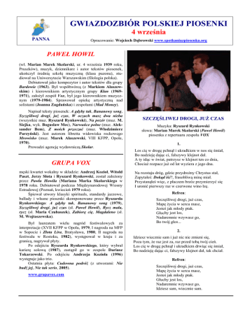 GWIAZDOZBIÓR POLSKIEJ PIOSENKI 4 września PANNA Opracowanie: Wojciech Dąbrowski www.spotkaniazpiosenka.org PAWEŁ HOWIL (wł. Marian Marek Skolarski, ur. 4 września 1939 roku, Pruszków), muzyk, dziennikarz i autor tekstów piosenek, ukończył średnią szkołę muzyczną (klasa puzonu), studiował na Uniwersytecie Warszawskim (filologia polska). Debiutował jako kompozytor i autor tekstów dla grupy Bardowie (1963). Był współtwórcą (z Markiem Ałaszewskim) i kierownikiem artystycznym grupy Klan (19691971), założył zespół Vox, był jego kierownikiem muzycznym (1979-1984). Sprawował opiekę artystyczną nad solistami (Joanna Zagdańska) i zespołami (Mad Money). Napisał teksty piosenek: A gdyby tak, Bananowy song, Szczęśliwej drogi, już czas, W oczach masz dwa nieba (wszystkie muz. Ryszard Rynkowski), Na pozór (muz. M. Siejka, wyk. Bogusław Mec), Narwańce polne (muz. Aleksander Bem), Z moich przeczuć (muz. Włodzimierz Parzyński). Jest autorem libretta widowiska rockowego Mrowisko (muz. Marek Ałaszewski, VIII KFPP, Opole, 1970). Prowadzi agencję wydawniczą Skolar. GRUPA VOX męski kwartet wokalny w składzie: Andrzej Kozioł, Witold Paszt, Jerzy Słota i Ryszard Rynkowski, został założony przez Pawła Howila (Mariana Marka Skolarskiego w 1978 roku. Debiutował podczas Międzynarodowej Wiosny Estradowej (Poznań, kwiecień 1979 roku). Śpiewał utwory klasyki spirituals, standardy jazzowe, ballady i własne piosenki skomponowane przez Ryszarda Rynkowskiego: A gdyby tak, Bananowy song (1979), Szczęśliwej drogi, już czas (sł. Paweł Howil), Rycz mała, rycz (sł. Maria Czubaszek), Zabiorę cię, Magdaleno (sł. M. Wojtaszewska). Był laureatem wielu nagród festiwalowych za interpretacje (XVII KFPP w Opolu, 1979, I nagroda na MFP w Sopocie i Złota Lira, Bratysława, 1980, II nagroda na festiwalu w Rostoku, 1982), występował w kraju i za granicą, nagrywał płyty. Po odejściu Ryszarda Rynkowskiego, który wybrał karierę solową (1987), zastąpił go w zespole Dariusz Tokarzewski. Po odejściu Andrzeja Kozioła (1996) występuje jako trio. Ostatnia płyta: Cudowna podróż (z utworami: Nie budź jej, Nie tak serio, 2005). www.grupavox.com SZCZĘŚLIWEJ DROGI, JUŻ CZAS Muzyka: Ryszard Rynkowski słowa: Marian Marek Skolarski (Paweł Howil) piosenka z repertuaru zespołu VOX 1. Los cię w drogę pchnął i ukradkiem w nos się śmiał, Bo nadzieję dając ci, fałszywy klejnot dał. A ty idąc w świat, patrzysz w klejnot ten co dnia, Chociaż rozpacz już od lat wyziera z jego dna. Na rozstaju dróg, gdzie przydrożny Chrystus stał, Zapytałeś: Dokąd iść?, frasobliwą minę miał. Przystanąłeś więc, z płaczem brzóz przymierzyć się I uronić pierwszy raz w czerwone wino łzę. Refren: Szczęśliwej drogi, już czas, Mapę życia w sercu masz, Jesteś jak młody ptak. Głuchy jest los, Nadaremnie wzywasz go, Bo twój głos... 2. Idziesz wiecznie sam i już nic nie zmieni się, Poza tym, że raz jest za, raz przed tobą twój cień. Los cię w drogę pchnął i ukradkiem drwiąc się śmiał, Bo nadzieję dając ci, fałszywy klejnot dał, tak chciał. Refren: Szczęśliwej drogi, już czas, Mapę życia w sercu masz, Jesteś jak młody ptak. Głuchy jest los, Nadaremnie wzywasz go, Idziesz sam, wiecznie sam.