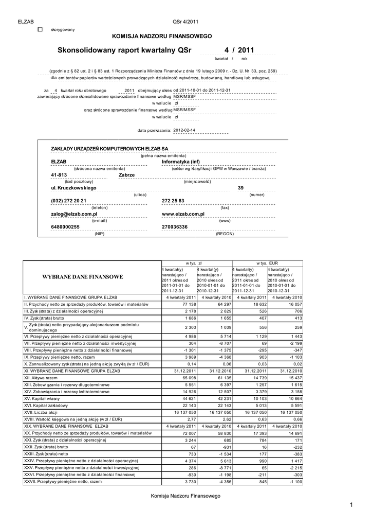 ELZAB QSr 4/2011 skorygowany KOMISJA NADZORU FINANSOWEGO Skonsolidowany raport kwartalny QSr 4 / 2011 kwartał / rok (zgodnie z § 82 ust. 2 i § 83 ust. 1 Rozporządzenia Ministra Finansów z dnia 19 lutego 2009 r. - Dz. U. Nr 33, poz. 259) dla emitentów papierów wartośc iowyc h prowadząc ych działalność wytwórczą, budowlaną, handlową lub usługową za 4 kwartał roku obrotowego 2011 obejmujący okres od 2011-10-01 do 2011-12-31 zawierając y skróc one skonsolidowane sprawozdanie finansowe według MSR/MSSF w walucie zł oraz skróc one sprawozdanie finansowe według MSR/MSSF w walucie zł data przekazania: 2012-02-14 ZAKŁADY URZĄDZEŃ KOMPUTEROWYCH ELZAB SA (pełna nazwa emitenta) ELZAB Informatyka (inf) (skróc ona nazwa emitenta) 41-813 (sektor wg klasyfikacji GPW w Warszawie / branża) Zabrze (kod poc ztowy) (miejscowość) ul. Kruczkowskiego 39 (ulica) (numer) (032) 272 20 21 272 25 83 (telefon) (fax) [email protected] www.elzab.com.pl (e-mail) (www) 6480000255 270036336 (NIP) (REGON) w tys. zł 4 kwartał(y) narastająco / 2011 okres od 2011-01-01 do 2011-12-31 WYBRANE DANE FINANSOWE I. WYBRANE DANE FINANSOWE GRUPA ELZAB w tys. EUR 4 kwartał(y) narastając o / 2010 okres od 2010-01-01 do 2010-12-31 4 kwartał(y) narastając o / 2011 okres od 2011-01-01 do 2011-12-31 4 kwartał(y) narastająco / 2010 okres od 2010-01-01 do 2010-12-31 4 kwartały 2011 4 kwartały 2010 4 kwartały 2011 4 kwartały 2010 77 138 64 297 18 632 16 057 III. Zysk (strata) z działalności operacyjnej 2 178 2 829 526 706 IV. Zysk (strata) brutto 1 686 1 655 407 413 Zysk (strata) netto przypadając y akc jonariuszom podmiotu V. dominującego 2 303 1 039 556 259 VI. Przepływy pieniężne netto z działalności operacyjnej 4 986 5 714 1 129 1 443 304 -8 707 69 -2 199 VIII. Przepływy pieniężne netto z działalnośc i finansowej -1 301 -1 375 -295 -347 IX. Przepływy pieniężne netto, razem 3 989 -4 368 903 -1 103 II. Przyc hody netto ze sprzedaży produktów, towarów i materiałów VII. Przepływy pieniężne netto z działalności inwestyc yjnej X. Zannualizowany zysk (strata) na jedną akc ję zwykłą (w zł / EUR) XI. WYBRANE DANE FINANSOWE GRUPA ELZAB XII. Aktywa razem 0,14 0,06 0,03 0,02 31.12.2011 31.12.2010 31.12.2011 31.12.2010 65 098 61 135 14 739 15 437 XIII. Zobowiązania i rezerwy długoterminowe 5 551 6 397 1 257 1 615 XIV. Zobowiązania i rezerwy krótkoterminowe 14 926 12 507 3 379 3 158 XV. Kapitał własny 44 621 42 231 10 103 10 664 XVI. Kapitał zakładowy XVII. Lic zba akc ji XVIII. Wartość księgowa na jedną akc ję (w zł / EUR) XIX. WYBRANE DANE FINANSOWE ELZAB XX. Przyc hody netto ze sprzedaży produktów, towarów i materiałów XXI. Zysk (strata) z działalnośc i operac yjnej XXII. Zysk (strata) brutto XXIII. Zysk (strata) netto 22 143 22 143 5 013 5 591 16 137 050 16 137 050 16 137 050 16 137 050 2,77 2,62 0,63 0,66 4 kwartały 2011 4 kwartały 2010 4 kwartały 2011 4 kwartały 2010 72 007 58 830 17 393 14 691 3 244 685 784 171 67 -931 16 -232 733 -1 534 177 -383 4 374 5 613 990 1 417 XXV. Przepływy pieniężne netto z działalnośc i inwestyc yjnej 286 -8 771 65 -2 215 XXVI. Przepływy pieniężne netto z działalności finansowej -930 -1 198 -211 -303 3 730 -4 356 845 -1 100 XXIV. Przepływy pieniężne netto z działalności operacyjnej XXVII. Przepływy pieniężne netto, razem Komisja Nadzoru Finansowego 1 ELZAB QSr 4/2011 w tys. zł 4 kwartał(y) narastająco / 2011 okres od 2011-01-01 do 2011-12-31 WYBRANE DANE FINANSOWE XXVIII. Zannualizowany zysk (strata) na jedną akcję zwykłą (w zł / EUR) XXIX. WYBRANE DANE FINANSOWE ELZAB w tys. EUR 4 kwartał(y) narastając o / 2010 okres od 2010-01-01 do 2010-12-31 4 kwartał(y) narastając o / 2011 okres od 2011-01-01 do 2011-12-31 4 kwartał(y) narastająco / 2010 okres od 2010-01-01 do 2010-12-31 0,05 -0,10 0,01 -0,02 31.12.2011 31.12.2010 31.12.2011 31.12.2010 XXX. Aktywa razem 62 545 60 372 14 161 15 244 XXXI. Zobowiązania i rezerwy długoterminowe 5 196 5 866 1 176 1 481 XXXII. Zobowiązania i rezerwy krótkoterminowe 12 680 10 599 2 871 2 676 XXXIII. Kapitał własny 44 669 43 907 10 113 11 087 XXXIV. Kapitał zakładowy XXXV. Liczba akcji 22 143 22 143 5 013 5 591 16 137 050 16 137 050 16 137 050 16 137 050 2,77 2,72 0,63 0,69 XXXVI. Wartość księgowa na jedną akcję (w zł / EUR) W przypadku prezentowania wybranyc h danyc h finansowyc h z kwartalnej informacji finansowej dane te należy odpowiednio opisać. Wybrane dane finansowe ze skonsolidowanego bilansu (skonsolidowanego sprawozdania z sytuac ji finansowej) lub odpowiednio z bilansu (sprawozdania z sytuac ji finansowej) prezentuje się na koniec bieżącego kwartału i koniec poprzedniego roku obrotowego, co należy odpowiednio opisać. Raport powinien zostać przekazany Komisji Nadzoru Finansowego, spółc e prowadząc ej rynek regulowany oraz do public znej wiadomośc i za pośrednic twem agenc ji informacyjnej zgodnie z przepisami prawa. ZAWARTOŚĆ RAPORTU Plik Opis GRUPA ELZAB c zęść finansowa SA Qr IV 2011.pdf skonsolidowane sprawozdanie finansowe Grupy ELZAB ELZAB część finansowa SA Q IV 2011.pdf sprawozdanie finansowe ELZAB SA GRUPA ELZAB informac ja SA Qr IV 2011.PDF informacja dodatkowa do QSr IV kwartał 2011 PODPISY OSÓB REPREZENTUJĄCYCH SPÓŁKĘ Data Imię i Nazwisko Stanowisko/Funkc ja 2012-02-14 Krzysztof Urbanowic z Prezes Zarządu 2012-02-14 Jerzy Popławski Członek Zarządu Podpis Komisja Nadzoru Finansowego 2 Kwartalne skonsolidowane sprawozdanie finansowe sporządzone według MSR/MSSF za IV kwartał 2011 r. SKONSOLIDOWANE SPRAWOZDANIE Z SYTUACJI FINANSOWEJ GRUPA ELZAB AKTYWA A. Aktywa trwałe (długoterminowe) 1. Rzeczowe aktywa trwałe 2. Wartość firmy 3. Wartości niematerialne 4. Długoterminowe aktywa finansowe 5. Aktywa z tytułu odroczonego podatku dochodowego 6. Długoterminowe należności i rozliczenia międzyokresowe B. Aktywa obrotowe (krótkoterminowe) 1. Zapasy 2. Krótkoterminowe należności i ro