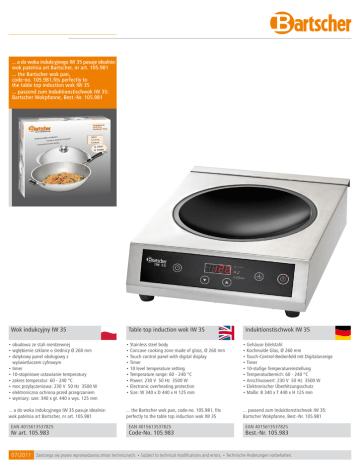 ... a do woka indukcyjnego IW 35 pasuje idealnie: wok patelnia art Bartscher, nr art. 105.981 ... the Bartscher wok pan, code-no. 105.981,fits perfectly to the table top induction wok IW 35 ... passend zum Induktionstischwok IW 35: Bartscher Wokpfanne, Best.-Nr. 105.981 Wok indukcyjny IW 35 Table top induction wok IW 35 Induktionstischwok IW 35 • obudowa ze stali nierdzewnej • wgłębienie szklane o średnicy Ø 260 mm • dotykowy panel obsługowy z wyświetlaczem cyfrowym • timer • 10-stopniowe ustawianie temperatury • zakres temperatur: 60 - 240 °C • moc przyłączeniowa: 230 V 50 Hz 3500 W • elektroniczna ochrona przed przegrzaniem • wymiary: szer. 340 x gł. 440 x wys. 125 mm • Stainless steel body • Concave cooking zone made of glass, Ø 260 mm • Touch control panel with digital display • Timer • 10 level temperature setting • Temperature range: 60 - 240 °C • Power: 230 V 50 Hz 3500 W • Electronic overheating protection • Size: W 340 x D 440 x H 125 mm • Gehäuse Edelstahl • Kochmulde Glas, Ø 260 mm • Touch-Control-Bedienfeld mit Digitalanzeige • Timer • 10-stufige Temperatureinstellung • Temperaturbereich: 60 - 240 °C • Anschlusswert: 230 V 50 Hz 3500 W • Elektronischer Überhitzungsschutz • Maße: B 340 x T 440 x H 125 mm ... a do woka indukcyjnego IW 35 pasuje idealnie: wok patelnia art Bartscher, nr art. 105.981 ... the Bartscher wok pan, code-no. 105.981, fits perfectly to the table top induction wok IW 35 ... passend zum Induktionstischwok IW 35: Bartscher Wokpfanne, Best.-Nr. 105.981 EAN 4015613537825 Nr art. 105.983 07/2011 EAN 4015613537825 Code-No. 105.983 EAN 4015613537825 Best.-Nr. 105.983 Zastrzega się prawo wprowadzania zmian technicznych. • Subject to technical modifications and errors. • Technische Änderungen vorbehalten.