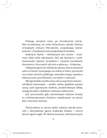 Piątego sierpnia rano, po kwadransie wściekłej strzelaniny, na ciche dotychczas uliczki Ochoty wtargnęły chmary Ukraińców, wypędzając mieszkańców z błyskawicznie podpalanych domów. Jedynym chyba – silniejszym niż strach – uczuciem ludzi było zdumienie. Szli jak lunatycy z podniesionymi rękami, krzykiem i ciosami karabinów kierowani z bocznych uliczek w główną – Grójecką. Oślepieni gęstymi obłokami dymu, który zmieniał ulice w łaźnie, następując na siebie w tłoku, posuwali się wolno wśród szybkiego, niewidocznego szpaleru obmacywań, przekleństw, strzałów i uderzeń. Miazga ludzka wytłoczona ulicą za granice miasta – uściślona konwojem – pełzła wolno gładkim pasem szosy, pod ogromnym niebem, przekreślonym lekką smugą drutów i dalekimi wieżami radiowymi. Już mroczniało, gdy zatrzaśnięto żelazne bramy za wielotysięcznym tłumem wpędzonym na pusty plac otoczony murem. Wystrzelona w nocne niebo rakieta chwilę świeciła i zbrużdżony gęstą arabeską blasku i czerni ekran zgasł nagle. W obmurowanym, kilometrowym 8 hering_opowiadania.indd 8 2011-08-04 14:35:30 chyba prostokącie szarzeje splątany kilkudziesięciotysięczny płaski tłum leżących ludzi. Brzegami wędrują światełka latarek, migocą po kilkanaście i pojedynczo. Czujkami blasku macają mrok, wślizgują się w głąb, nieruchomieją, gasną. Rozlana masa, nakłuwana światłem, marszczy się pełzliwie ku środkowi. Co chwila zwierzęcy, pożądliwy pomruk wyszarpuje z ziemi przerażony, błagalny głos kobiecy. Szczelnie przylega do murów stalowe niebo – rudawe brzegiem, przezroczyste od strony palonego miasta. Częste, iskrzące się, suche wystrzały wach osaczających mury ścierają świadomość. Zsiniały o świcie plac – dawniej targowisko jarzynowych hurtowników: wielki czworobok gołej ziemi, porosłej gdzieniegdzie zdeptaną świńską trawą – zaroił się od poruszonych głodem ludzi. Rodzice uspokajają płaczące dzieci, że wrócą wkrótce do domów, do swoich piwnic – trzeba poczekać tylko, aż się domy wypalą i ostygną. Sami w to wierzą. Większość nie wyniosła nic – poza dotkliwym urokiem nieba nad tymi swoimi domami, nasyconymi nadzieją ostatnich tygodni. Dla kilkudziesięciu tysięcy ludzi jest tylko jedna studnia – za bramą. Puszczają do niej pod konwojem po kilka osób. (Na drugi czy trzeci dzień założono dodatkowy hydrant na terenie). Jest również brama 9 hering_opowiadania.indd 9 2011-08-04 14:35:30 prowadząca na jarzynowe działki. Otwierają ją nie wiadomo kiedy i na krótko. Puszczają także od czasu do czasu do przyległych z zewnątrz budynków, już spalonych, skąd można przywlec rozbite szafy, stoły, drzwi i krzesła. Zdarzają się jeszcze inne okazje – jednorazowe i niepowtarzalne: zabity koń lub krowa. Poza tym nie ma nic. Żeby zdobyć coś z nielicznych darów Zieleniaka, trzeba mieć węch psa, celność strzelca i szybkość pocisku. No i bary, i łokcie, i pięści. Powietrze szumi jak liście rozkołysanych drzew, sypiąc obficie twarde i cuchnące owoce – słowa – zawsze te same, wystarczające dla określenia różnych zjawisk i uczuć. Każda upływająca godzina coraz wyraźniej dzieli ludzi na zaradnych i niezaradnych i decyduje o dalszym podziale na sytych i padających z pragnienia i głodu. Szanse przetrwania przeważały na stronę szarego proletariatu, przemieszanego ze świetniejszą i świetną ludnością nowoczesnych bloków i ogrodowych domków tej dzielnicy. Ludzie pogrążeni w jednej sytuacji nie przestawali być ludźmi różnych sfer. Te różnice stwarzały dystans, utrudniały współżycie. Jedyne, co tu ma sens – to siła fizyczna, wytrzymałość i celowy wysiłek ciała. Wszystko inne – wrodzona i robiona wytworność, wrażliwość, nawyki, zwyczaje i polor uprzywilejowanych – działa jak demon10 hering_opowiadania.indd 10 2011-08-04 14:35:30 stracja. Razi i śmieszy, wreszcie staje się pospolitą słabością i wyczerpaniem. Elegantki z przedmieścia od pierwszej chwili zrezygnowały z wytworności, splunęły energicznie na manikiury i nie ustępowały w zaradności swoim mężczyznom. Odwieczne tradycje jednoizbowców pozwoliły – im właśnie – łatwiej znosić warunki Zieleniaka. Ci, co na szmuglerskich szlakach przywykli do sytuacji bez wyjścia, z których jednak wychodzili żywi, którzy sto razy tracili i sto razy zaczynali – i tu zaczynali „od nowa”. Krytycznie patrzącym zdawało się, że „ci ludzie” są tu w swoim żywiole. Przykucnięci w niemym oczekiwaniu – jak na stacji kolejowej – patrzyli ze zdumieniem, jak „tamci” urządzali swoje biwaki, jakby tu mieli zostać na wieczność. Odgrodzone deskami kojce zabezpieczały ich „przestrzeń życiową”; przywleczone szafy i biurka wzrastały jak stragany stosami jarzyn, przybywało garnków, konwi z wodą i misek. Gdzieniegdzie sterczał – jak w poczekalni – rosochaty wieszak. Te wieszaki służyły poza tym jako punkty orientacyjne. Gdy piątego dnia liczni przezorni „posiadacze” odchodzili na niewiadomy los z workami na plecach, kubłami w rękach i z krzesłami na głowie – głodne rzesze rzuciły się na ziemię po nich, pożerając przed drogą obfite reszty niezabranych kartofli i buraków. 11 hering_opowiadania.indd 11 2011-08-04 14:35:30 Gazeciarze i papierosiarze odrośli na osaczonych łapankami ulicach – dzieci Warszawy – od dawna posiedli mądrość życia na przekór. To oni w ostatnich przedpowstańczych miesiącach wprowadzili nowy brawurowy styl wyskakiwania – „urywania się” – z tramwaju: w najszybszym pędzie ciskali się ze stopnia odchyleni przeciw jeździe, równoważąc rzutem ciała w tył siłę rozpędu, i stawali na jezdni prościutko – bez żadnego zbytecznego kroku – okrzykując „Nowy Bajer Warszawski”. I tu przeciskali się niezmordowanie, obładowani butelkami z wodą, usłużnie proponując 