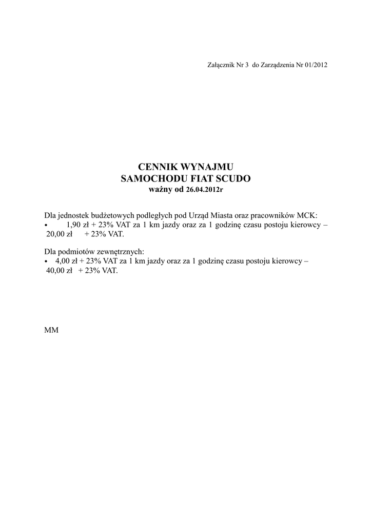 Załącznik Nr 3 do Zarządzenia Nr 01/2012 CENNIK WYNAJMU SAMOCHODU FIAT SCUDO ważny od 26.04.2012r Dla jednostek budżetowych podległych pod Urząd Miasta oraz pracowników MCK: • 1,90 zł + 23% VAT za 1 km jazdy oraz za 1 godzinę czasu postoju kierowcy – 20,00 zł + 23% VAT. Dla podmiotów zewnętrznych: • 4,00 zł + 23% VAT za 1 km jazdy oraz za 1 godzinę czasu postoju kierowcy – 40,00 zł + 23% VAT. MM