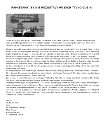PAMIĘTAMY, BY NIE POZOSTAŁY PO NICH TYLKO GUZIKI! "Pozostaną po nas tylko guziki" – powie jeden z bohaterów filmu "Katyń" Andrzeja Wajdy! Katyński guzik wojskowy, jeden spośród tysięcy odnalezionych w grobach, jest dziś symbolem zbrodni i nadziei jednocześnie. Że Katyń już w żadnej formie się nigdy nie powtórzy (frag. "Zapisków z Krakowa Zbigniewa Ringera"). Zbrodnia katyńska, to zbrodnia komunistyczna, której ofiarami stało się co najmniej 22 tys. obywateli Polski – w tym ponad 10 tys. oficerów Wojska Polskiego, funkcjonariuszy Policji Państwowej, Straży Granicznej, a także ówczesnej Straży Więziennej. Decyzja o niej zapadła na najwyższym szczeblu władz Związku Socjalistycznych Republik Radzieckich i zawarta została w tajnej uchwale Biura Politycznego KC WKP(b) Nr P13/144, z dnia 5 marca 1940 roku. W murach tarnogórskiego aresztu znajduje się tablica upamiętniająca funkcjonariuszy Straży Więziennej ówczesnego więzienia w Tarnowskich Górach: starszego strażnika Straży Więziennej Józefa Bacika s. Bernarda oraz starszego strażnika Straży Więziennej Józefa Urbańczyka s. Pawła, zamordowanych przez NKWD w Twerze, w 1940 roku. W dniu wczorajszym, z okazji 75. rocznicy podpisania tzw. decyzji katyńskiej przed tablicą odbyły się uroczystości upamiętniające jej ofiary. W uroczystościach tych uczestniczyli członkowie tarnogórskiej "Rodziny Katyńskiej"; Burmistrz Miasta Tarnowskie Góry; Starosta Tarnogórski; przedstawiciele administracji i szkolnictwa Tarnowskich Gór. Była to także swoista, żywa lekcja historii dla uczniów szkół z"Miasta Gwarków". Jak co roku, w uroczystościach upamiętniających Zbrodnię Katyńską nie mogło zabraknąć reprezentantów Służby Więziennej – kontynuującej chlubne tradycje więziennictwa z okresu II Rzeczpospolitej. "Naszą powinnością jest stale przypominać – o jednej z największych zbrodni XX wieku!"(frag. tekstu odczytanego w trakcie uroczystości przez Panią Krystynę Zatoń – prezesa tarnogórskiego oddziału "Rodziny Katyńskiej"; córki jednego ze strażników Straży Więziennej Aresztu Śledczego w Tarnowskich Górach, zamordowanego w Twerze). Tak więc, aby nie "pozostały po nich tylko guziki" funkcjonariusze i pracownicy Aresztu Śledczego w Tarnowskich Górach przy każdej "uroczystej" okazji, ale i na co dzień dają świadectwo pamięci o swoich zamordowanych kolegach, składając pod tablicą kwiaty i znicze. zdjęcia: kpt. Marek SIWY. tekst: por. Roman MALCHRZYK Oficer Prasowy Aresztu Śledczego w Tarnowskich Górach.