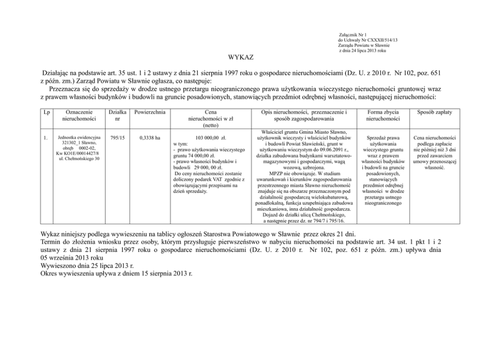 Załącznik Nr 1 do Uchwały Nr CXXXII/514/13 Zarządu Powiatu w Sławnie z dnia 24 lipca 2013 roku WYKAZ Działając na podstawie art. 35 ust. 1 i 2 ustawy z dnia 21 sierpnia 1997 roku o gospodarce nieruchomościami (Dz. U. z 2010 r. Nr 102, poz. 651 z późn. zm.) Zarząd Powiatu w Sławnie ogłasza, co następuje: Przeznacza się do sprzedaży w drodze ustnego przetargu nieograniczonego prawa użytkowania wieczystego nieruchomości gruntowej wraz z prawem własności budynków i budowli na gruncie posadowionych, stanowiących przedmiot odrębnej własności, następującej nieruchomości: Lp Oznaczenie nieruchomości Działka nr Powierzchnia Cena nieruchomości w zł (netto) 1. Jednostka ewidencyjna 321302_1 Sławno, obręb 0002-02, Kw KO1E/00014427/8 ul. Chełmońskiego 30 795/15 0,3338 ha 103 000,00 zł. w tym: - prawo użytkowania wieczystego gruntu 74 000,00 zł. - prawo własności budynków i budowli 29 000, 00 zł. Do ceny nieruchomości zostanie doliczony podarek VAT zgodnie z obowiązującymi przepisami na dzień sprzedaży. Opis nieruchomości, przeznaczenie i sposób zagospodarowania Właściciel gruntu Gmina Miasto Sławno, użytkownik wieczysty i właściciel budynków i budowli Powiat Sławieński, grunt w użytkowaniu wieczystym do 09.06.2091 r., działka zabudowana budynkami warsztatowomagazynowymi i gospodarczymi, wagą wozową, uzbrojona. MPZP nie obowiązuje. W studium uwarunkowań i kierunków zagospodarowania przestrzennego miasta Sławno nieruchomość znajduje się na obszarze przeznaczonym pod działalność gospodarczą wielokubaturową, ponadlokalną, funkcja uzupełniająca zabudowa mieszkaniowa, inna działalność gospodarcza. Dojazd do działki ulicą Chełmońskiego, a następnie przez dz. nr 794/7 i 795/16. Forma zbycia nieruchomości Sposób zapłaty Sprzedaż prawa użytkowania wieczystego gruntu wraz z prawem własności budynków i budowli na gruncie posadowionych, stanowiących przedmiot odrębnej własności w drodze przetargu ustnego nieograniczonego Cena nieruchomości podlega zapłacie nie później niż 3 dni przed zawarciem umowy przenoszącej własność. Wykaz niniejszy podlega wywieszeniu na tablicy ogłoszeń Starostwa Powiatowego w Sławnie przez okres 21 dni. Termin do złożenia wniosku przez osoby, którym przysługuje pierwszeństwo w nabyciu nieruchomości na podstawie art. 34 ust. 1 pkt 1 i 2 ustawy z dnia 21 sierpnia 1997 roku o gospodarce nieruchomościami (Dz. U. z 2010 r. Nr 102, poz. 651 z późn. zm.) upływa dnia 05 września 2013 roku Wywieszono dnia 25 lipca 2013 r. Okres wywieszenia upływa z dniem 15 sierpnia 2013 r.
