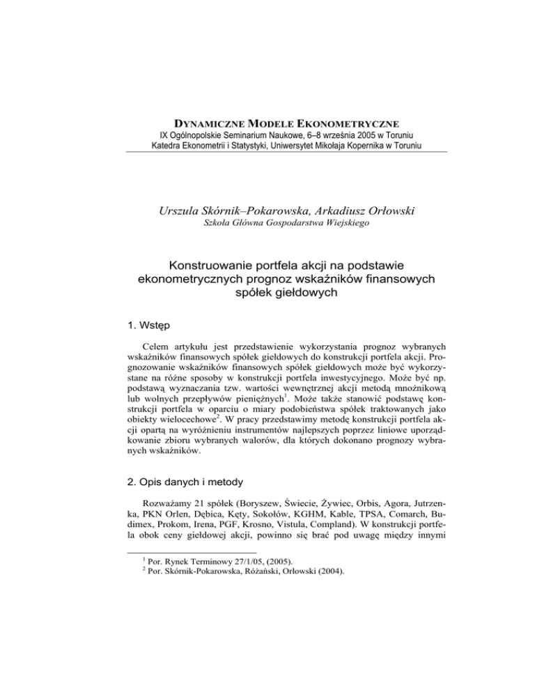DYNAMICZNE MODELE EKONOMETRYCZNE IX Ogólnopolskie Seminarium Naukowe, 6–8 września 2005 w Toruniu Katedra Ekonometrii i Statystyki, Uniwersytet Mikołaja Kopernika w Toruniu Urszula Skórnik–Pokarowska, Arkadiusz Orłowski Szkoła Główna Gospodarstwa Wiejskiego Konstruowanie portfela akcji na podstawie ekonometrycznych prognoz wskaźników finansowych spółek giełdowych 1. Wstęp Celem artykułu jest przedstawienie wykorzystania prognoz wybranych wskaźników finansowych spółek giełdowych do konstrukcji portfela akcji. Prognozowanie wskaźników finansowych spółek giełdowych może być wykorzystane na różne sposoby w konstrukcji portfela inwestycyjnego. Może być np. podstawą wyznaczania tzw. wartości wewnętrznej akcji metodą mnożnikową lub wolnych przepływów pieniężnych1. Może także stanowić podstawę konstrukcji portfela w oparciu o miary podobieństwa spółek traktowanych jako obiekty wielocechowe2. W pracy przedstawimy metodę konstrukcji portfela akcji opartą na wyróżnieniu instrumentów najlepszych poprzez liniowe uporządkowanie zbioru wybranych walorów, dla których dokonano prognozy wybranych wskaźników. 2. Opis danych i metody Rozważamy 21 spółek (Boryszew, Świecie, Żywiec, Orbis, Agora, Jutrzenka, PKN Orlen, Dębica, Kęty, Sokołów, KGHM, Kable, TPSA, Comarch, Budimex, Prokom, Irena, PGF, Krosno, Vistula, Compland). W konstrukcji portfela obok ceny giełdowej akcji, powinno się brać pod uwagę między innymi 1 2 Por. Rynek Terminowy 27/1/05, (2005). Por. Skórnik-Pokarowska, Różański, Orłowski (2004). 54 Urszula Skórnik-Pokarowska i Arkadiusz Orłowski ogólną kondycję ekonomiczno-finansową spółki giełdowej, czyli analizę fundamentalną3. Spółkę giełdową opisujemy wybranymi wskaźnikami, z których najistotniejsze to: stopa zwrotu z kapitału własnego, stopa zwrotu z aktywów, rotacja należności, rotacja zapasów, rotacja zobowiązań, rotacja aktywów i stopa zadłużenia4. Cenę akcji uwzględniamy obliczając wskaźniki dochodowości akcji, czyli średnią stóp zwrotu w badanym okresie. Przeprowadzona wcześniej analiza wykazała, że stopa zadłużenia ma słabą moc dyskryminacyjną5, wobec czego nie uwzględnimy tego wskaźnika w dalszych obliczeniach. Wskaźniki dotyczące spółek publikowane są w raportach finansowych, kwartalnych i rocznych, np. przez serwis Notoria. Niestety, dane dostępne są ze znacznym opóźnieniem (około 2 miesięcy), co w konstrukcji portfela inwestycyjnego może mieć duże znaczenie. Opierając się na danych historycznych, najczęściej z lat 2000-2003, prognozujemy wskaźniki finansowe spółek na następny okres i wykorzystujemy tak otrzymane wartości w konstrukcji portfela akcji. Takie podejście umożliwia dokonanie inwestycji giełdowej przed opublikowaniem raportów finansowych za kolejny okres, na których bazuje większość potencjalnych inwestorów. Otrzymane prognozy wskaźników tworzą macierz, która jest podstawą do dalszych obliczeń. Po znormalizowaniu wartości wskaźników skonstruujemy zmienną syntetyczną6, dzięki której uporządkujemy liniowo spółki i tym samym wyłonimy walory najlepsze. Zmienną syntetyczną otrzymamy wykorzystując dwa podejścia: bazujące na wskaźnikach zmienności i metodzie głównych składowych. 3. Wyniki W pracy do prognozy większości wskaźników wykorzystujemy model wyrównania wykładniczego7: yˆ1 = y1 yˆ t = αy t + (1 − α ) yˆ t −1 (1) gdzie: ŷt jest oceną wartości trendu w okresie t , α jest stałą wygładzania, którą w obliczeniach przyjęto na poziomie 0.7 oraz 0.5. Wykorzystano kwartalne wartości wskaźników najczęściej z okresu od I kwartału 2000 do IV kwartału 2003. Prognoza dotyczyła I kwartału 2004. W 3 Por. Tarczyński, W. Łuniewska M. (2004). Por. Tarczyński, W. Łuniewska M. (2004). 5 Por. Skórnik-Pokarowska U. (2005). 6 Por. Zeliaś, A. (2000). 7 Por. Zeliaś, A., Pawełek, B., Wanat, St. (2003), s.143. 4 Konstruowanie portfela akcji na podstawie ekonometrycznych prognoz wskaźników…. 55 dalszej analizie wykorzystano wartości, dla których względny błąd ex post prognozy był mniejszy. W sytuacji, gdy względne błędy prognozy ex post były duże, zostały wykonane obliczenia prognoz wskaźników przy użyciu klasycznych modeli trendu. Najczęściej pojawiał się trend hiperboliczny: 1 yˆ t = a0 + a1 ⋅ ξ t . t (2) Jednakże prognozowanie współczynników przy wykorzystaniu funkcji trendu dało rezultaty odbiegające znacznie od rzeczywistych wartości już dla prognoz wygasłych i znacznie różniące się od wartości zaprognozowanych metodą wygładzania. Dla notowań dziennych akcji obliczono kwartalne wartości wskaźników dochodowości. Wskaźnik dochodowości wyraża się wzorem: n ∑ R (t ) i Ri = t =1 n , (3) gdzie t oznacza kolejne dni pracy WGPW w latach 2002 i 2003, n oznacza liczbę dni w kwartale, zaś Ri (t ) oznacza stopę zwrotu z inwestycji „i” w chwili t. W dalszej analizie wykorzystano średnie wartości kwartalnych wskaźników dochodowości a nie wartości zaprognozowane. W tabeli 1 przedstawiono prognozy wskaźników dla spółki Świecie. Prognozy wskaźników dla wszystkich spółek przedstawiono w tabeli 2. Tabela 1. Wartości prognoz wskaźników dla spółki Świecie Wskaźnik Stała wygładzania Błąd ex post Średni poziom wskaźnika Względny błąd w % Rotacja aktywów ROA w % ROE w % Rotacja zobowiązań Rotacja należności Rotacja zapasów 0.7 0.5 0.7 0.5 0.7 0.5 0.7 0.5 0.7 0.5 0.7 0.5 11.96 15.9 0.02 0.02 0.03 0.03 22.7 21.7 1.98 2.2 1.2 1.45 379.6 379.6 0.14 0.14 0.23 0.23 91.9 91.9 76.5 76.5 24 24.1 11.8 13.7 11.4 11.1 24.7 23.6 2.6 2.9 5 6.0 11.3 12.4 19.3 21.1 97.9 95.9 77.6 77.9 22 21.5 3.1 4.2 Prognoza na I 331.5 379.7 kw. 04 Źródło: opracowanie własne. 56 Urszula Skórnik-Pokarowska i Arkadiusz Orłowski Tabela 2. Wartości prognoz wskaźników dla wybranych spółek Stopa zwrotu z kapitału własnego St