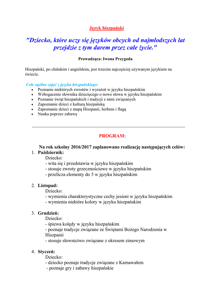 Język hiszpański "Dziecko, które uczy się języków obcych od najmłodszych lat przejdzie z tym darem przez całe życie." Prowadząca: Iwona Przygoda Hiszpański, po chińskim i angielskim, jest trzecim najczęściej używanym językiem na świecie. Cele ogólne zajęć z języka hiszpańskiego: Poznanie niektórych zwrotów i wyrażeń w języku hiszpańskim Wzbogacenie słownika dziecięcego o nowe słowa w języku hiszpańskim Poznanie świąt hiszpańskich i tradycji z nimi związanych Zapoznanie dzieci z kulturą hiszpańską Zapoznanie dzieci z mapą Hiszpanii, herbem i flagą Nauka poprzez zabawę ________________________________________________________________ PROGRAM: Na rok szkolny 2016/2017 zaplanowano realizację następujących celów: 1. Październik: Dziecko: - wita się i przedstawia w języku hiszpańskim - stosuje zwroty grzecznościowe w języku hiszpańskim - przelicza elementy do 5 w języku hiszpańskim 2. Listopad: Dziecko: - wymienia charakterystyczne cechy jesieni w języku hiszpańskim - wymienia niektóre kolory w języku hiszpańskim 3. Grudzień: Dziecko: - śpiewa kolędy w języku hiszpańskim - poznaje tradycje związane ze Świętami Bożego Narodzenia w Hiszpanii - stosuje słownictwo związane z okresem zimowym 4. Styczeń: Dziecko: - dziecko poznaje tradycje związane z Karnawałem - poznaje gry i zabawy hiszpańskie - przelicza elementy do 10 5. Luty: Dziecko: - nazywa członków rodziny w języku hiszpańskim - nazywa części ciała w języku hiszpańskim 6. Marzec: Dziecko: - nazywa elementy stroju - przelicza elementy do 15 - opisuje wygląd kolegi/ koleżanki 7. Kwiecień: Dziecko: - wymienia cechy charakteryzujące wiosnę w języku hiszpańskim - poznaje hiszpańskie tradycje związane z Wielkanocą - poznaje przymiotniki służące do opisu sylwetki człowieka 8. Maj: Dziecko: - nazywa zwierzęta w języku hiszpańskim - przelicza elementy do 20 - poznaje kolejne hiszpańskie tradycje 9. Czerwiec: Dziecko: - wymienia cechy charakterystyczne dla lata - przygotowuje przystawki popularne w Hiszpanii - powtarza dotychczas zdobyte wiadomości w formie zabawowej Opracowała: mgr Iwona Przygoda