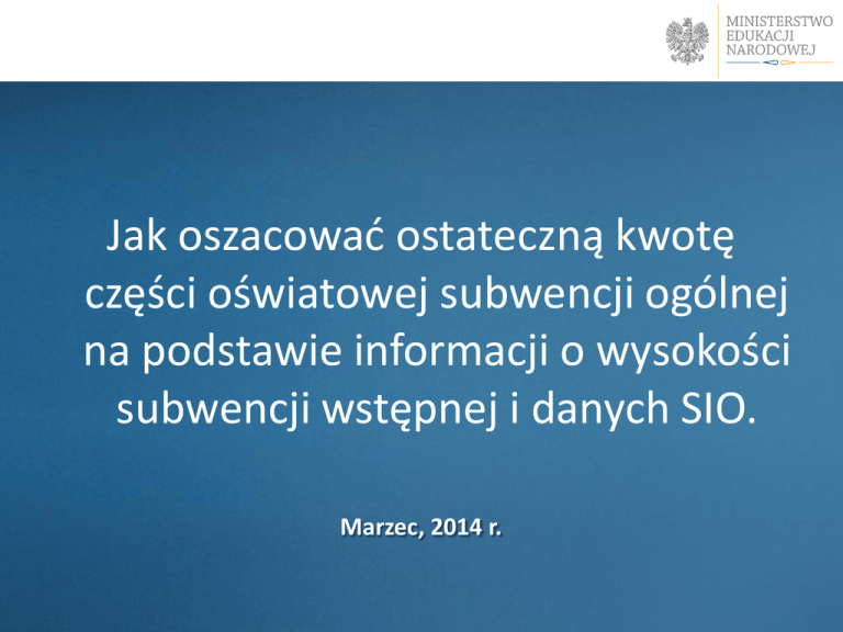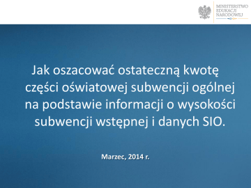 Jak oszacować ostateczną kwotę części oświatowej subwencji ogólnej na podstawie informacji o wysokości subwencji wstępnej i danych SIO. Marzec, 2014 r. Subwencja oświatowa wstępna Zgodnie z art. 33 ust. 1 ustawy z dnia 13 listopada 2003 r. o dochodach jednostek samorządu terytorialnego (Dz. U. z 2010 r., poz. 526 z późn. zm.), minister właściwy do spraw finansów publicznych informuje jednostki samorządu terytorialnego w terminie do dnia 15 października roku bazowego – o rocznych planowanych kwotach części oświatowej subwencji ogólnej przyjętych w projekcie ustawy budżetowej na kolejny rok budżetowy (subwencja oświatowa wstępna). Subwencja oświatowa wstępna Planowane (wstępne) kwoty części oświatowej subwencji ogólnej na dany rok budżetowy (np. 2014 r.) określane są dla poszczególnych jednostek samorządu terytorialnego na podstawie: projektu rozporządzenia Ministra Edukacji Narodowej w sprawie sposobu podziału części oświatowej subwencji ogólnej dla jednostek samorządu terytorialnego w danym roku (2014 r.), danych statystycznych dotyczących liczby etatów nauczycieli poszczególnych stopni awansu zawodowego, wykazanych w systemie informacji oświatowej (według stanu na dzień 30 września i dzień 10 października roku poprzedniego – 2012 r.) zweryfikowanych przez organy prowadzące (dotujące) szkoły i placówki, Subwencja oświatowa wstępna danych statystycznych dotyczących liczby uczniów w bieżącym roku szkolnym (2013/2014) wykazanych w systemie informacji oświatowej (według stanu na dzień 10 września roku poprzedniego – 2013 r.) w zakresie ogólnej liczby uczniów oraz odpowiednich wag algorytmu w odniesieniu do kwoty SOA i SOB, z uwzględnieniem zwiększenia o x % liczby uczniów szkół podstawowych dla dzieci i młodzieży oraz liczby uczniów ogólnokształcących szkół muzycznych I stopnia, danych statystycznych dotyczących liczby uczniów (wychowanków) w poprzednim roku szkolnym wykazanych w systemie informacji oświatowej (według stanu na dzień 30 września i dzień 10 października roku poprzedniego – 2012 r.) zweryfikowanych przez organy prowadzące (dotujące) szkoły i placówki oświatowe - w zakresie odpowiednich wag algorytmu w odniesieniu do kwot SOB i SOC Subwencja oświatowa ostateczna Zgodnie z art. 33 ust. 1 ustawy z dnia 13 listopada 2003 r. o dochodach jednostek samorządu terytorialnego (Dz. U. z 2010 r., poz. 526 z późn. zm.), minister właściwy do spraw finansów publicznych informuje jednostki samorządu terytorialnego w terminie 14 dni od dnia ogłoszenia ustawy budżetowej – o rocznych kwotach części oświatowej subwencji ogólnej wynikających z ustawy budżetowej (subwencja oświatowa ostateczna). Subwencja oświatowa ostateczna Ostateczne kwoty części oświatowej subwencji ogólnej dla poszczególnych jednostek samorządu terytorialnego na dany rok (np. 2014 r.) określane są na podstawie: rozporządzenia Ministra Edukacji Narodowej w sprawie sposobu podziału części oświatowej subwencji ogólnej dla jednostek samorządu terytorialnego w danym roku (2014 r.), danych statystycznych dotyczących liczby etatów nauczycieli poszczególnych stopni awansu zawodowego, wykazanych w systemie informacji oświatowej (według stanu na dzień 30 września i dzień 10 października roku poprzedniego – 2013 r.) zweryfikowanych i potwierdzonych przez organy prowadzące (dotujące) szkoły i placówki oświatowe Subwencja oświatowa ostateczna danych statystycznych dotyczących liczby uczniów w bieżącym roku szkolnym, wykazanych w systemie informacji oświatowej (według stanu na dzień 30 września i dzień 10 października roku poprzedniego – 2013 r.), zweryfikowanych przez organy prowadzące (dotujące) szkoły i placówki, z uwzględnieniem zwiększenia o x % liczby uczniów szkół podstawowych dla dzieci i młodzieży oraz liczby uczniów ogólnokształcących szkół muzycznych I stopnia. Subwencja oświatowa dla jst W wyliczeniach ostatecznych kwot części oświatowej subwencji ogólnej na dany rok uwzględniane są zmiany zakresu zadań oświatowych realizowanych przez poszczególne samorządy terytorialne, które nastąpiły od 1 stycznia danego roku w wyniku porozumień zawartych przez jednostki samorządu terytorialnego oraz zmian w podziale terytorialnym kraju, wprowadzonych na podstawie rozporządzeń Rady Ministrów. Jak oszacować ostateczną kwotę części oświatowej subwencji ogólnej na podstawie informacji o kwocie subwencji wstępnej 1. W zależności od zmiany liczby uczniów przeliczeniowych i struktury awansu zawodowego nauczycieli w danej jednostce samorządu terytorialnego, subwencja ostateczna może być większa, mniejsza bądź w skrajnym przypadku może być równa kwocie subwencji wstępnej. 2. Weryfikacja w oparciu o zaktualizowane dane statystyczne o liczbie uczniów, szczególnie pod kątem zmniejszenia/zwiększenia liczby uczniów m.in. z orzeczeniem o potrzebie kształcenia specjalnego oraz liczby uczniów w klasach sportowych, mniejszości narodowych. 3. Zmiana finansowego standardu A w stosunku do wstępnie przyjętego. Jak oszacować ostateczną kwotę części oświatowej subwencji ogólnej na rok 2014 na podstawie informacji o kwocie subwencji wstępnej Źródła danych do subwencji wstępnej na rok 2014 Dane SIO, spis na dzień 10 września roku poprzedniego • Uczniowie statyst. szkół publicznych i niepublicznych - młodzież Dane SIO, spis na dzień 30 września (subwencja ostateczna z poprzedniego roku) • P10, P12, P13, P14, P15, P16, P17, • Uczniowie statyst. szkół publicznych - P18, P19, P20, P21,P22, P24, P25, dorośli P26, P27, P29, P30, P31, P32, P33, • Uczniowie statyst. szkół P34, P35, P36, P37, P38, P39, P40, niepublicznych - dorośli • Wagi: P1, P7, P8 (minus klasy medyczne) , P23, P28, P43, P44, P45 Wagi: P2, P3, P4, P5, P6, P8, P9, P11, P41, P42 • Etaty nauczycieli Jak oszacować ostateczną kwotę częśc