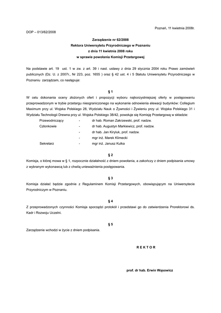 Poznań, 11 kwietnia 2008r. DOP – 013/62/2008 Zarządzenie nr 62/2008 Rektora Uniwersytetu Przyrodniczego w Poznaniu z dnia 11 kwietnia 2008 roku w sprawie powołania Komisji Przetargowej Na podstawie art. 19 ust. 1 w zw. z art. 39 i nast. ustawy z dnia 29 stycznia 2004 roku Prawo zamówień publicznych (Dz. U. z 2007r., Nr 223, poz. 1655 ) oraz § 42 ust. 4 i 5 Statutu Uniwersytetu Przyrodniczego w Poznaniu zarządzam, co następuje: §1 W celu dokonania oceny złoŜonych ofert i propozycji wyboru najkorzystniejszej oferty w postępowaniu przeprowadzonym w trybie przetargu nieograniczonego na wykonanie odnowienia elewacji budynków: Collegium Maximum przy ul. Wojska Polskiego 28, Wydziału Nauk o śywności i śywieniu przy ul. Wojska Polskiego 31 i Wydziału Technologii Drewna przy ul. Wojska Polskiego 38/42, powołuje się Komisję Przetargową w składzie: Przewodniczący - dr hab. Roman Zakrzewski, prof. nadzw. Członkowie - dr hab. Augustyn Markiewicz, prof. nadzw. - dr hab. Jan Kiryluk, prof. nadzw. - mgr inŜ. Marek Klimecki - mgr inŜ. Janusz Kulka Sekretarz §2 Komisja, o której mowa w § 1, rozpocznie działalność z dniem powołania, a zakończy z dniem podpisania umowy z wybranym wykonawcą lub z chwilą uniewaŜnienia postępowania. §3 Komisja działać będzie zgodnie z Regulaminem Komisji Przetargowych, obowiązującym na Uniwersytecie Przyrodniczym w Poznaniu. §4 Z przeprowadzonych czynności Komisja sporządzi protokół i przedstawi go do zatwierdzenia Prorektorowi ds. Kadr i Rozwoju Uczelni. §5 Zarządzenie wchodzi w Ŝycie z dniem podpisania. REKTOR prof. dr hab. Erwin Wąsowicz