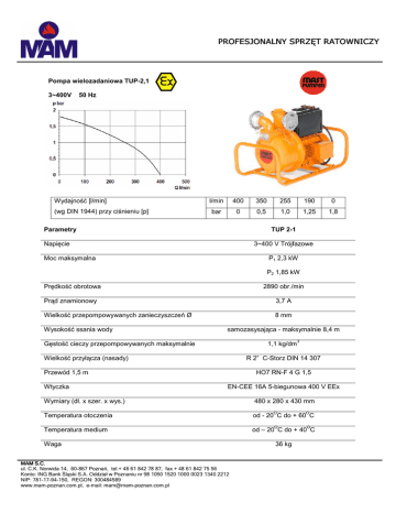 PROFESJONALNY SPRZĘT RATOWNICZY Pompa wielozadaniowa TUP-2,1 3~400V 50 Hz Wydajność [l/min] (wg DIN 1944) przy ciśnieniu [p] l/min 400 350 255 190 0 bar 0 0,5 1,0 1,25 1,8 Parametry TUP 2-1 Napięcie 3~400 V Trójfazowe Moc maksymalna P1 2,3 kW P2 1,85 kW Prędkość obrotowa 2890 obr./min Prąd znamionowy 3,7 A Wielkość przepompowywanych zanieczyszczeń Ø 8 mm Wysokość ssania wody samozasysająca - maksymalnie 8,4 m Gęstość cieczy przepompowywanych maksymalnie 1,1 kg/dm Wielkość przyłącza (nasady) R 2” C-Storz DIN 14 307 Przewód 1,5 m Wtyczka 3 HO7 RN-F 4 G 1,5 EN-CEE 16A 5-biegunowa 400 V EEx Wymiary (dł. x szer. x wys.) 480 x 280 x 430 mm Temperatura otoczenia od - 20 C do + 60 C Temperatura medium od – 20 C do + 40 C Waga MAM S.C. ul. C.K. Norwida 14, 60-867 Poznań, tel.+ 48 61 842 78 87, fax + 48 61 842 75 56 Konto: ING Bank Śląski S.A. Oddział w Poznaniu nr 98 1050 1520 1000 0023 1340 2212 NIP: 781-17-94-150, REGON: 300484589 www.mam-poznan.com.pl, e-mail: [email protected] O O O O 36 kg PROFESJONALNY SPRZĘT RATOWNICZY MAST TUP 2-1 POMPA WIRNIKOWA zabezpieczona p-wybuchowo Ex Przenośna samozasysająca pompa MAST TUP 2-1 w wykonaniu przeciwwybuchowym ( EEx II 2G c IIB T 3 ). Jest odpowiednia do przepompowywania produktów olejów mineralnych oraz nie agresywnych cieczy o lepkości < 1,5 cm2/s. Jest to jednostopniowa pompa wirnikowa z półotwartym wirnikiem i pierścieniem ślizgowym uszczelniającym. Pompa wyposaŜona jest w zawór do zapobiegania cofnięcia się strugi na dopływie. Silnik elektryczny asynchroniczny z wirnikiem krótkozwartym dla pracy ciągłej jest zabezpieczony za pomocą włącznika bezpieczeństwa z termicznymi i elektromagnetycznymi wyzwalaczami nastawionymi na prąd nominalny. Silnik o mocy 1,85 kW, napięcie 400 V Ex eG – IP 44 z wyłącznikiem wykonanym w Ex. UmoŜliwia pracę pompy w strefie zagroŜenia wybuchem Z1 i Z2 do przepompowywania cieczy palnych grupy wybuchowości IIA i IIB i klasy temperaturowej T1 do T3. Osłona pompy jest łatwo rozbieralna co umoŜliwia usuwanie resztek i zanieczyszczeń z wnętrza pompy po zakończonej pracy. Pompa wyposaŜona jest w przyłącza 52 Storz z mosiądzu. Pompę przed uruchomieniem naleŜy zalać cieczą roboczą poprzez wlew w górnej części korpusu. Pompy nie wolno stosować w strefie 0 ! WYKAZ cieczy palnych przetłaczanych przez pompy aceton. ocetan etylu. alkohol etylowy. glikol etylowy. i – octan pentylu. benzyna. benzol. n – alkohol butylowy. cykloheksan. 1,2 – dwuchloroetan olej napędowy paliwo do silników odrzutowych kwas octowy bezwodnik kwasu octowego olej opałowy n – heksan metanol naftalen MAM S.C. ul. C.K. Norwida 14, 60-867 Poznań, tel.+ 48 61 842 78 87, fax + 48 61 842 75 56 Konto: ING Bank Śląski S.A. Oddział w Poznaniu nr 98 1050 1520 1000 0023 1340 2212 NIP: 781-17-94-150, REGON: 300484589 www.mam-poznan.com.pl, e-mail: [email protected] kwas oleinowy fenol n – alkohol propylowy tetralina touol substancje chemiczne o niskiej agresywności