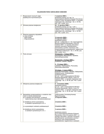 KALENDARZ ROKU SZKOLNEGO 2008/2009 1 Rozpoczęcie rocznych zajęć dydaktyczno-wychowawczych 2 Zimowa przerwa świąteczna 3 Pisemne egzaminy dojrzałości w sesji zimowej: - język polski - drugi przedmiot 4 Ferie zimowe: 1 września 2008 r. (podstawa prawna: § 2 ust. 1a rozporządzenia Ministra Edukacji Narodowej i Sportu z dnia 18 kwietnia 2002 r. w sprawie organizacji roku szkolnego - Dz. U. Nr 46, poz. 432, z późn. zm.) 22 - 31 grudnia 2008 r. (podstawa prawna: § 3 ust. 1 pkt 1 rozporządzenia Ministra Edukacji Narodowej i Sportu z dnia 18 kwietnia 2002 r. w sprawie organizacji roku szkolnego - Dz. U. Nr 46, poz. 432, z późn. zm.) 12 stycznia 2009 r. 13 stycznia 2009 r. (podstawa prawna: § 8 ust. 1 załącznika nr 1 do rozporządzenia Ministra Edukacji Narodowej z dnia 30 kwietnia 2007 r. w sprawie warunków i sposobu oceniania, klasyfikowania i promowania uczniów i słuchaczy oraz przeprowadzania sprawdzianów i egzaminów w szkołach publicznych - Dz. U. Nr 83, poz. 562, z późn. zm.) 19 stycznia - 1 lutego 2009 r.: Dolnośląskie, Mazowieckie, Opolskie, Zachodniopomorskie 26 stycznia - 8 lutego 2009 r.: Podlaskie, Łódzkie, Śląskie 2 - 15 lutego 2009 r.: Lubelskie, Podkarpackie, Pomorskie, Warmińsko-Mazurskie 16 lutego - 1 marca 2009 r.: Kujawsko-Pomorskie, Lubuskie, Małopolskie, Świętokrzyskie, Wielkopolskie (podstawa prawna: § 3 ust. 1 pkt 2 rozporządzenia Ministra Edukacji Narodowej i Sportu z dnia 18 kwietnia 2002 r. w sprawie organizacji roku szkolnego - Dz. U. Nr 46, poz. 432, z późn. zm.) 9 - 14 kwietnia 2009r. (podstawa prawna: § 3 ust. 1 pkt 3 rozporządzenia Ministra Edukacji Narodowej i Sportu z dnia 18 kwietnia 2002 r. w sprawie organizacji roku szkolnego - Dz. U. Nr 46, poz. 432, z późn. zm.) 5 Wiosenna przerwa świąteczna 6 Sprawdzian przeprowadzany w ostatnim roku nauki w szkole podstawowej: a) w szkołach dla dorosłych, w których nauka kończy się w semestrze jesiennym ustalił dyrektor Centralnej Komisji Egzaminacyjnej 12 stycznia 2009 r. b) dodatkowy termin sprawdzianu w szkołach wymienionych w lit. a 2 kwietnia 2009 r. c) w pozostałych szkołach podstawowych 2 kwietnia 2009 r. d) dodatkowy termin sprawdzianu w szkołach wymienionych w lit. c 3 czerwca 2009 r. (podstawa prawna: § 33 rozporządzenia Ministra Edukacji Narodowej z dnia 30 kwietnia 2007 r. w sprawie warunków i sposobu oceniania, klasyfikowania i promowania uczniów i słuchaczy oraz przeprowadzania sprawdzianów i egzaminów w szkołach publicznych - Dz. U. Nr 83, poz. 562, z późn. zm.) 7 8 Egzamin przeprowadzany w ostatnim roku nauki w gimnazjum: a) w gimnazjach dla dorosłych, w których nauka kończy się w semestrze jesiennym: - część humanistyczna - część matematyczno-przyrodnicza - część z języka obcego nowożytnego b) dodatkowy termin w gimnazjach wymienionych w lit. a: - część humanistyczna - część matematyczno-przyrodnicza - część z języka obcego nowożytnego c) w pozostałych gimnazjach: - część humanistyczna - część matematyczno-przyrodnicza - część z języka obcego nowożytnego d) dodatkowe terminy w gimnazjach wymienionych w lit. c: - część humanistyczna - część matematyczno-przyrodnicza - część z języka obcego nowożytnego Zakończenie zajęć w klasach (semestrach) programowo najwyższych: - w szkołach ponadpodstawowych: - w szkołach ponadgimnazjalnych (z wyjątkiem szkół wymienionych w pkt 9): 9 Zakończenie zajęć w klasach (semestrach) programowo najwyższych zasadniczych szkół zawodowych i szkół policealnych 10 Pisemne egzaminy dojrzałości w sesji wiosennej - język polski - drugi przedmiot - język ojczysty - w szkołach lub oddziałach z ojczystym językiem nauczania mniejszości narodowej 11 Egzamin maturalny: - część ustna - część pisemna ustalił dyrektor Centralnej Komisji Egzaminacyjnej 13 stycznia 2009 r. 14 stycznia 2009 r. 15 stycznia 2009 r. 22 kwietnia 2009 r. 23 kwietnia 2009 r. 24 kwietnia 2009 r. 22 kwietnia 2009 r. 23 kwietnia 2009 r. 24 kwietnia 2009 r. 2 czerwca 2009 r. 3 czerwca 2009 r. 4 czerwca 2009 r. (podstawa prawna: § 33 rozporządzenia Ministra Edukacji Narodowej z dnia 30 kwietnia 2007 r. w sprawie warunków i sposobu oceniania, klasyfikowania i promowania uczniów i słuchaczy oraz przeprowadzania sprawdzianów i egzaminów w szkołach publicznych - Dz. U. Nr 83, poz. 562, z późn. zm.) 2 stycznia 2009 r. (sesja zimowa) 24 kwietnia 2009 r. (sesja wiosenna) 2 stycznia 2009 r. (sesja zimowa) 24 kwietnia 2009 r. (sesja wiosenna) (podstawa prawna: § 2 ust. 4 rozporządzenia Ministra Edukacji Narodowej i Sportu z dnia 18 kwietnia 2002 r. w sprawie organizacji roku szkolnego - Dz. U. Nr 46, poz. 432, z późn. zm.) 9 stycznia 2009 r. lub 10 czerwca 2009 r. (podstawa prawna: § 2 ust. 3 rozporządzenia Ministra Edukacji Narodowej i Sportu z dnia 18 kwietnia 2002 r. w sprawie organizacji roku szkolnego - Dz. U. Nr 46, poz. 432, z późn. zm.) 5 maja 2009 r., 6 maja 2009 r., 7 maja 2009 r. (podstawa prawna: § 8 ust. 1 załącznika nr 1 do rozporządzenia Ministra Edukacji Narodowej z dnia 30 kwietnia 2007 r. w sprawie warunków i sposobu oceniania, klasyfikowania i promowania uczniów i słuchaczy oraz przeprowadzania sprawdzianów i egzaminów w szkołach publicznych - Dz. U. Nr 83, poz. 562, z późn. zm.) ustalił dyrektor Centralnej Komisji Egzaminacyjnej 4 - 29 maja 2009 r. początek 4 maja 2009 r. (podstawa prawna: § 61 rozporządzenia Ministra Edukacji Narodowej z dnia 30 kwietnia 2007 r. w sprawie warunków i sposobu oceniania, klasyfikowania i promowania uczniów i słuchaczy oraz przeprowadzania sprawdzianów i egzaminów w szkołach publicznych - Dz. U. Nr 83, poz. 562, z późn. zm.) 12 Egzaminy z nauki zawodu i z przygotowania zawodowego 13 Egzamin potwierdzający kwalifikacje zawodowe a) sesja zimowa - etap pisemny - etap praktyczny b) sesja letnia - etap pisemny - etap praktyczny 14 Dni wolne od zajęć dydaktyczno-wychowawczych: a) w szkołach podstawowy