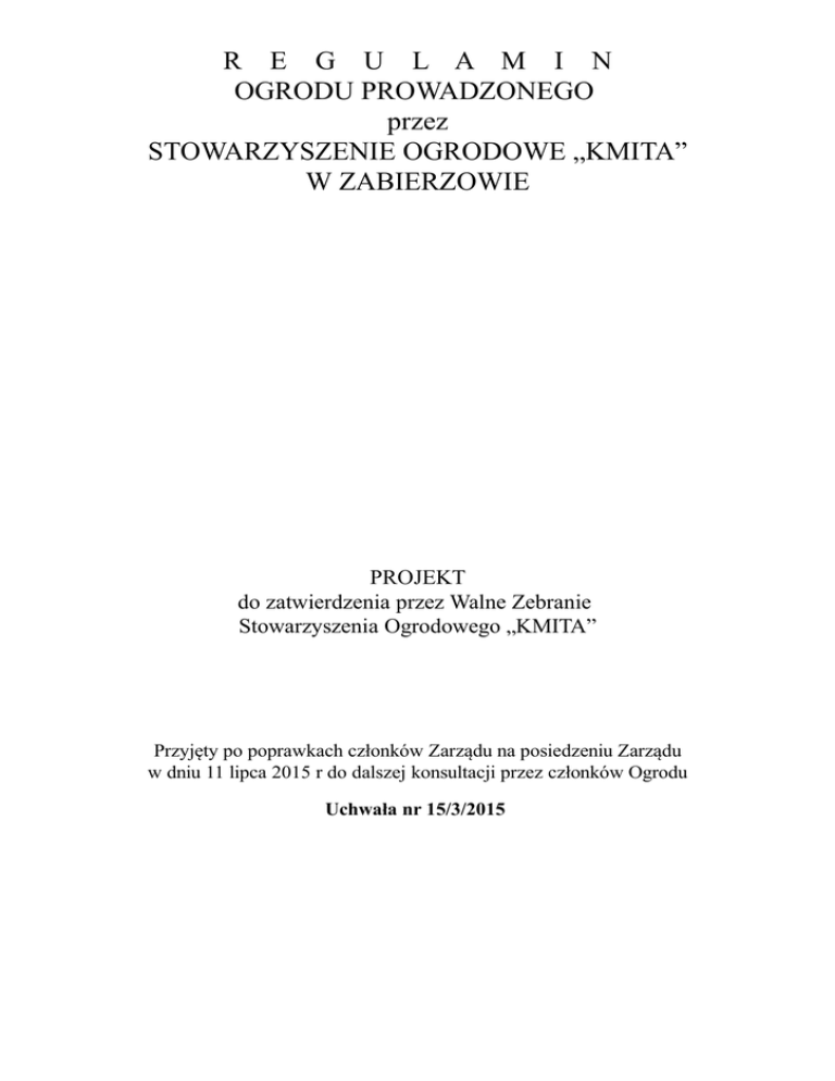 R E G U L A M I N OGRODU PROWADZONEGO przez STOWARZYSZENIE OGRODOWE „KMITA” W ZABIERZOWIE PROJEKT do zatwierdzenia przez Walne Zebranie Stowarzyszenia Ogrodowego „KMITA” Przyjęty po poprawkach członków Zarządu na posiedzeniu Zarządu w dniu 11 lipca 2015 r do dalszej konsultacji przez członków Ogrodu Uchwała nr 15/3/2015 ROZDZIAŁ I Przepisy wstępne §1 1. Regulamin ogrodu działkowego zwany dalej „regulaminem”, określa szczegółowe zasady zagospodarowania i korzystania z działki oraz funkcjonowania i zagospodarowania Ogrodu prowadzonego przez Stowarzyszenie Ogrodowe „KMITA” w Zabierzowie, a także zasady korzystania z terenu ogólnego i infrastruktury ogrodowej. 2. W rozumieniu regulaminu, działka to wydzielona część Ogrodu prowadzonego przez Stowarzyszenie Ogrodowe „KMITA” w Zabierzowie na podstawie Ustawy o Rodzinnych Ogrodach Działkowych z dnia 13 grudnia 2013 r zwanej dalej Ustawą. 3. Regulamin obowiązuje wszystkich użytkowników Działek oraz osób przebywających na terenie Ogrodu. §2 1. Ogród stanowi wydzielony obszar gruntu, składający się z działek i terenu ogólnego, służący do wspólnego korzystania przez działkowców, wyposażony w infrastrukturę ogrodową niezbędną do jego prawidłowego funkcjonowania. §3 1. Ogród jako obiekt użyteczności publicznej, spełnia pozytywną rolę w ekosystemie gminy, służy zaspokajaniu wypoczynkowych i rekreacyjnych potrzeb. §4 1. Działka jest podstawową jednostką przestrzenną Ogrodu, której powierzchnia nie może przekraczać 500 m2, służącą zaspokajaniu potrzeb działkowca i jego rodziny w zakresie prowadzenia upraw ogrodniczych, wypoczynku i rekreacji. 2. Powierzchnia i granice działki muszą być zgodne z planem zagospodarowania Ogrodu. 3. Działka przekraczająca powierzchnię, o której mowa w ustępie 1 może podlegać podziałowi. §5 1. Działka w Ogrodzie nie może być wykorzystywana do innych celów, niż określone w § 4 ust.1, a w szczególności obowiązuje całkowity zakaz prowadzenia na działce działalności gospodarczej lub innej działalności zarobkowej oraz wynajmowania części lub całej działki. 2. Zakaz, określony w ust. 1, stosuje się odpowiednio do altany. §6 1. Działka nie może być wykorzystywana do zamieszkiwania. 2. Przez zamieszkiwanie rozumie się długotrwałe przebywanie z zamiarem skupienia i realizacji swoich spraw życiowych. 3. Altana na terenie działki w Ogrodzie nie jest obiektem mieszkalnym; przebywanie w niej nie może stanowić podstawy do urzędowego potwierdzenia czasowego lub stałego pobytu. §7 1. Działkowcem jest pełnoletnia osoba fizyczna uprawniona do korzystania z działki w Ogrodzie na podstawie prawa do działki nabytego zgodnie z ustawą z dnia 13 grudnia 2013 roku o rodzinnych ogrodach działkowych, zwanej dalej „ustawą". §8 1. W Ogrodzie prawo do działki ustanawia Zarząd Stowarzyszenia Ogrodowego. §9 1. Działkowiec jest w szczególności uprawniony do: - zagospodarowania działki i wyposażenia jej w odpowiednie obiekty i urządzenia zgodnie z ustawą i niniejszym regulaminem, - udziału w szkoleniach organizowanych przez zarząd Stowarzyszenia Ogrodowego, - występowania do Zarządu Stowarzyszenia w sprawach dotyczących zagospodarowania i użytkowania działki, - zgłaszania wniosków dotyczących funkcjonowania i zarządzania Ogrodem, - korzystania z urządzeń wspólnych Ogrodu, uczestniczenia w imprezach i uroczystościach organizowanych przez zarząd Stowarzyszenia. 2. Działkowiec ma w szczególności obowiązek: - przestrzegać ustawę, - przestrzegać regulaminu i statutu Stowarzyszenia Ogrodowego KMITA, - użytkować działkę zgodnie z ustawą, statutem i regulaminem, - działać w interesie Ogrodu, - uiszczać opłaty ogrodowe uchwalone przez uprawnione statutem organy Stowarzyszenia (Walne Zebranie) w terminie przez nie ustalonym, a w przypadku zwłoki w zapłacie - wraz z obowiązującymi odsetkami ustawowymi, - aktualizować dane osobowe i adres do korespondencji, - otaczać opieką mienie Ogrodu. - racjonalnie i oszczędnie gospodarować wodą jak też energią elektryczną § 10 1. Infrastruktura ogrodowa w rozumieniu ustawy stanowi własność Stowarzyszenia Ogrodowego „KMITA”. 2. Nasadzenia, urządzenia i obiekty znajdujące się na działce, wykonane lub nabyte ze środków finansowych działkowca, stanowią jego własność. ROZDZIAŁ II Zasady organizacyjne Ogrodu § 11 1. Organami Ogrodu są: - Walne Zebranie Stowarzyszenia Ogrodowego, - Zarząd Stowarzyszenia Ogrodowego, - Komisja Rewizyjna Stowarzyszenia Ogrodowego - Komisja Rozjemcza Stowarzyszenia Ogrodowego. 2. Członkami organów Stowarzyszenia Ogrodowego „KMITA” mogą być – na zasadach określonych w statucie - wyłącznie członkowie zwyczajni Stowarzyszenia. 3. Zasady funkcjonowania organów Stowarzyszenia określa statut Stowarzyszenia Ogrodowego „KMITA” § 12 1. Najwyższym organem Stowarzyszenia Ogrodowego „KMITA” jest Walne Zebranie członków Stowarzyszenia. Prawo uczestniczenia z możliwością głosowania i prawem wyboru na Walnym Zebraniu przysługuje wyłącznie członkowi Stowarzyszenia. Działkowcy nie będący członkami Stowarzyszenia mogą uczestniczyć w zebraniu w roli obserwatorów. 2. Walne zebrania Stowarzyszenia zwoływane są zgodnie z § 33 Statutu Stowarzyszenia Ogrodowego „KMITA” § 13 1. W Stowarzyszeniu Ogrodowym „KMITA” mogą odbywać się zebrania działkowców o charakterze porządkowym i informacyjnym w sprawach nie zastrzeżonych dla walnych zebrań. § 14 1. Zarząd Stowarzyszenia prowadzi sprawy Ogrodu i reprezentuje go na zewnątrz według zasad określonych w Statucie. § 15 1. Zarząd Ogrodu może ustanowić gospodarza (gospodarzy) Ogrodu. Gospodarzem nie może być członek komisji rewizyjnej Stowarzyszenia, ani członek zarządu ROD pełniący funkcję prezesa, wiceprezesa, sekretarza oraz skarbnika. 2. Sprawy gospodarcze zapewniające funkcjonowanie Ogro