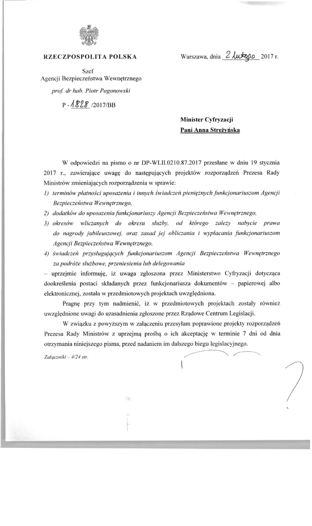 RZECZPOSPOLITA POLSKA Szef Agencji Bezpieczeństwa Wewnętrznego prof, dr hab. Piotr Pogonowski P-/i$£tf /2017/BB Minister Cyfryzacji Pani Anna Streżyńska W odpowiedzi na pismo o nr DP-WLII.0210.87.2017 przesłane w dniu 19 stycznia 2017 r., zawierające uwagę do następujących projektów rozporządzeń Prezesa Rady Ministrów zmieniających rozporządzenia w sprawie: 1) terminów płatności uposażenia i innych świadczeń pieniężnych funkcjonariuszom Agencji Bezpieczeństwa Wewnętrznego, 2) dodatków do uposażenia funkcjonariuszy Agencji Bezpieczeństwa 3) okresów wliczanych do okresu służby, od którego Wewnętrznego, zależy do nagrody jubileuszowej, oraz zasad jej obliczania i wypłacania Agencji Bezpieczeństwa 4) świadczeń nabycie prawa funkcjonariuszom Wewnętrznego, przysługujących funkcjonariuszom Agencji Bezpieczeństwa Wewnętrznego za podróże służbowe, przeniesienia łub delegowania - uprzejmie informuję, iż uwaga zgłoszona przez Ministerstwo Cyfryzacji dotycząca dookreślenia postaci składanych przez funkcjonariusza dokumentów - papierowej albo elektronicznej, została w przedmiotowych projektach uwzględniona. Pragnę przy tym nadmienić, iż w przedmiotowych projektach zostały również uwzględnione uwagi do uzasadnienia zgłoszone przez Rządowe Centrum Legislacji. W związku z powyższym w załączeniu przesyłam poprawione projekty rozporządzeń Prezesa Rady Ministrów z uprzejmą prośbą o ich akceptację w terminie 7 dni od dnia otrzymania niniejszego pisma, przed nadaniem im dalszego biegu legislacyjnego. Załączniki - 4/24 str.