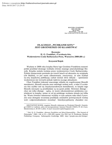 Pobrane z czasopisma http://kulturaiwartosci.journals.umcs.pl Data: 06/03/2017 23:29:10 KULTURA I WARTOŚCI ISSN 2299-7806 NR 16/2015 RECENZJE, s. 103–109 http://dx.doi.org/10.17951/kw.2015.16.103 DLACZEGO „WCISKANIE KITU” JEST GROŹNIEJSZE OD KŁAMSTWA? Recenzja: H. G. Frankfurt, O wciskaniu kitu, Wydawnictwo Czuły Barbarzyńca Press, Warszawa 2008 (80 s.) Krzysztof Rojek Wydana w 2008 roku książka Harry’ego Gordona Frankfurta stanowi polski przekład słynnego wykładu równie znanego amerykańskiego filozofa. Książka została wydana przez wydawnictwo Czuły Barbarzyńska. Polskie tłumaczenie powstało po trzech latach od ukazania się oryginału (On Bullshit), co jest warte odnotowania, zważywszy, że sam wykład na swą książkową publikację czekał niemal dwie dekady – opóźnienie wydawnicze nie wywarło jednak wpływu na jego aktualność. Choć Frankfurt dokonał znacznego wkładu do współczesnej filozofii moralności, filozofii umysłu oraz ontologii wolnej woli, a tekst O wciskaniu kitu szybko stał się międzynarodowym bestsellerem, to książki tego filozofa nieczęsto są przekładane są na język polski. Również dlatego – choć nie tylko dlatego – sądzę, że warto rekomendować polskiemu czytelnikowi tę książkę, mimo że od jej polskiego wydania minęło już kilka lat. Warto również odnotować wydany w tym samym roku tekst O prawdzie oraz dostępne wcześniej przekłady artykułów poświęconych wolnej woli i odpowiedzialności moralnej1. Interdyscyplinarny charakter rozKRZYSZTOF ROJEK, magister filozofii, doktorant na Wydziale Filozofii i Socjologii UMCS w Lublinie; adres do korespondencji: Instytut Filozofii UMCS, Pl. M. CurieSkłodowskiej 4, 20–031 Lublin. E-mail: [email protected] Zob. H. G. Frankfurt, Alternate Possibilities and Moral Responsibility, „The Journal of Philosophy” 1969, t. 66, nr 23, s. 829–839, reprint: Free Will, red. D. Pereboom, Hackett Publishing Company, Indianapolis–Cambridge 2009, http://people.nnu.edu/ktimpe/ 1 Pobrane z czasopisma http://kulturaiwartosci.journals.umcs.pl Data: 06/03/2017 23:29:10 104 Krzysztof Rojek, Dlaczego „wciskanie kitu” jest groźniejsze od kłamstwa? ważań spopularyzował filozofię Frankfurta na arenie międzynarodowej, zaś słynny przykład kontrfaktycznego interwenta Blacka, wysunięty w obronie kompatybilizmu, do dziś chętnie jest cytowany, tłumaczony oraz interpretowany w różnych dyskusjach nad istnieniem i znaczeniem wolnej woli, zwłaszcza w kontekście moralnej odpowiedzialności za czyn oraz zasady alternatywnych możliwości2. Wykład dotyczący „wciskania kitu” mógłby się wydawać żartobliwą odpowiedzią autora w obliczu zjawiska polegającego na tym, że ktoś kogoś przekonuje do nieprawdy – ale nic bardziej mylnego. Ponieważ autor koncentruje się na przekazie werbalnym, stąd w tytule występuje określenie kolokwialne, na trwałe zakorzenione w codziennej tradycji mówionego języka angielskiego. Hanna Pustuła, tłumacząc ów tekst, umknęła jednak kontrowersjom, jakie mógłby wywołać dosłowny przekład terminu bullshit. Skoncentrowała się za to na przekazie spostrzeżeń autora, oscylujących wokół opisywanych w książce codziennych przykładów, nie zaś na ich wulgarnym wydźwięku. Ponadto sam Frankfurt krótko i celnie tłumaczy językowo-kulturowe rozbieżności, które skłoniły go do posłużenia się w tytule takim terminem. Ponieważ wykład prezentuje nader spójną kompilację przykładów i przemyśleń autora, całość nie została podzielona na części. Wydaje się to posunięciem trafnym, również ze względu na objętość tekstu, który w przystępnej do odczytu formie zamyka się na osiemdziesięciu stronach. We wstępie autor formułuje wspomniane już (i niewątpliwie wymagane dla zachowania „powagi” tekstu) wyjaśnienie odnośnie wybranego tytułu wykładu. Opisuje zarazem, dlaczego termin „kit” jest w swej dosadności bardziej celny niż np. określenie „blaga”. Swoje rozważania rozpoczyna frazą: „Jedną z najbardziej uderzających cech naszej kultury jest ogromna ilość wciskanego kitu (sic!). Wszyscy o tym wiemy. Każdy z nas dorzuca swój kamyczek. Jednak przyjmujemy tę sytuację za oczywistą. Większość z nas wierzy, że potrafi rozpoznać kit i nie da się wyresearch/China/Frankfurt1.pdf [dostęp: 3.02.2015], s. 156–166; zob. tenże, Alternatywne możliwości i odpowiedzialność moralna, tłum. J. Nowotniak, [w:] Filozofia moralności. Postanowienie i odpowiedzialność moralna, red. J. Hołówka, Wydawnictwo SPACJA, Warszawa 1997, s. 163–174; zob. tenże, Freedom of the Will and the Concept of a Person, „The Journal of Philosophy” 1971, t. 68, nr 1, http://www.jstor.org/stable/2024717 [dostęp: 3.02.2015], s. 5–20; zob. tenże, Wolność woli i pojęcie osoby, tłum. J. Nowotniak, [w:] Filozofia moralności. Postanowienie i odpowiedzialność moralna, dz. cyt., s. 21–39. 2 Liczne interpretacje przykładów Frankfurta (Frankfurt Cases) oraz przykłady ich kontynuacji i modyfikacji czytelnik może znaleźć w całości cytowanej wyżej książce Jacka Hołówki. Zob. też: K. Rojek, Kontrfaktyczna interwencja jako teoretyczne i praktyczne zagrożenie dla wolności. Krytyczna analiza Frankfurt Cases, „Kultura i Wartości” 2015, nr 16, s. 23–48, http://journals.umcs.pl/kw, doi: http://dx.doi.org/10.17951/kw.2015.16.23 Pobrane z czasopisma http://kulturaiwartosci.journals.umcs.pl Data: 06/03/2017 23:29:10 105 Krzysztof Rojek, Dlaczego „wciskanie kitu” jest groźniejsze od kłamstwa? strychnąć na dudka. Przeto fenomen wciskania kitu nie wzbudził dotąd żywszego zainteresowania i nie stał się przedmiotem wnikliwych dociekań. W rezultacie nie wypracowaliśmy precyzyjnego poglądu na temat specyfiki, przyczyn powszechnego występowania oraz funkcji wciskania kitu”3. Filozoficzna analiza wskazywanej przez autora teoretycznej luki prowadzona jest 