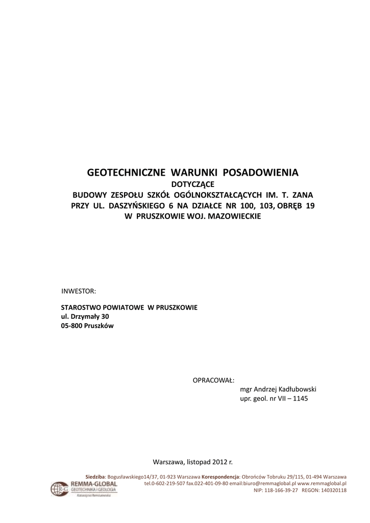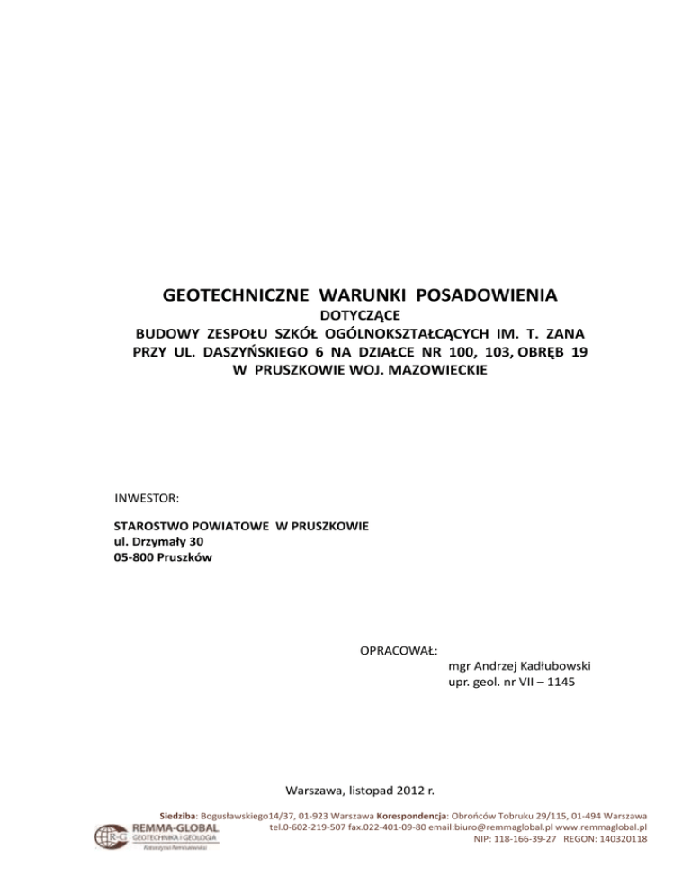 GEOTECHNICZNE WARUNKI POSADOWIENIA DOTYCZĄCE BUDOWY ZESPOŁU SZKÓŁ OGÓLNOKSZTAŁCĄCYCH IM. T. ZANA PRZY UL. DASZYŃSKIEGO 6 NA DZIAŁCE NR 100, 103, OBRĘB 19 W PRUSZKOWIE WOJ. MAZOWIECKIE INWESTOR: STAROSTWO POWIATOWE W PRUSZKOWIE ul. Drzymały 30 05-800 Pruszków OPRACOWAŁ: mgr Andrzej Kadłubowski upr. geol. nr VII – 1145 Warszawa, listopad 2012 r. Siedziba: Bogusławskiego14/37, 01-923 Warszawa Korespondencja: Obrońców Tobruku 29/115, 01-494 Warszawa tel.0-602-219-507 fax.022-401-09-80 email:[email protected] www.remmaglobal.pl NIP: 118-166-39-27 REGON: 140320118 DOT. BUDOWA ZSO – UL. DASZYŃSKIEGO 6 – PRUSZKÓW 2 SPIS TREŚCI A. CZĘŚĆ TEKSTOWA. I. OPINIA GEOTECHNICZNA 1.1 DANE OGÓLNE 1.1.1 PODSTAWA OPRACOWANIA 1.1.2 TECHNICZNE PODSTAWY OPRACOWANIA 1.1.3 CEL I ZAKRES OPRACOWANIA 1.1.4. KRÓTKI OPIS PROJEKTOWANEJ INWESTYCJI. 1.2 LOKALIZACJA I OPIS TERENU 1.3. OPIS BADAŃ 1.4 WARUNKI GRUNTOWE 1.5 WARUNKI WODNE 1.6 WNIOSKI I ZALECENIA II. DOKUMENTACJA BADAŃ PODŁOŻA GRUNTOWEGO 2.1 2.2 2.3 2.4 OPIS BADAŃ WARUNKI GEOTECHNICZNE BADANIA POLOWE PARAMETRY GEOTECHNICZNE GRUNTÓW III. PROJEKT GEOTECHNICZNY 3.1 3.2 3.3 3.4 3.5 3.6 3.7 3.8 3.9 3.10 PROGNOZA ZMIAN WŁAŚCIWOŚCI GRUNTÓW W CZASIE OKREŚLENIE OBLICZENIOWYCH PARAMETRÓW GEOTECHNICZNYCH OKREŚLENIE CZĘŚCIOWYCH WSPÓLCZYNNIKÓW BEZPIECZEŃSTWA DLA OBLICZEŃ OKREŚLENIE ODDZIAŁYWAŃ OD GRUNTU PRZYJĘCIE MODELU OBLICZENIOWEGO PODŁOŻA GRUNTOWEGO OKREŚLENIA NOŚNOŚCI I OSIADANIA PODŁOŻA GRUNTOWEGO USTALENIE DANYCH DO ZAPROJEKTOWANIA FUNDAMENTÓW WYKONASTWO ROBÓT ZIEMNYCH ODDZIAŁYWANIE WODY GRUNTOWEJ NA OBIEKT MONITORING PROJEKTOWANEGO OBIEKTU Siedziba: Bogusławskiego14/37, 01-923 Warszawa Korespondencja: Obrońców Tobruku 29/115, 01-494 Warszawa tel.0-602-219-507 fax.022-401-09-80 email:[email protected] www.remmaglobal.pl NIP: 118-166-39-27 REGON: 140320118 DOT. BUDOWA ZSO – UL. DASZYŃSKIEGO 6 – PRUSZKÓW 3 B. CZĘŚĆ GRAFICZNA. 1. MAPA DOKUMENTACYJNA W SKALI 1: 500. — ZAŁ. NR 1 2. PRZEKROJE GEOTECHNICZNE I — VII. — ZAŁ. NR 2.1 – 2.7 3. OBJAŚNIENIA ZNAKÓW I SYMBOLI UŻYTYCH NA PRZEKROJACH. — ZAŁ. NR 3 4. LEGENDA DO PRZEKROJÓW. — ZAŁ. NR 4 5. KARTY DOKUMENTACYJNE OTWORU GEOTECHNICZNEGO. — ZAŁ. NR 5.1 – 5.10 6. SCHEMATY ODKRYWEK FUNDAMENTÓW A — B — C. — ZAŁ. NR 6.1 – 6.3 7. ANALIZA CHEMICZNA WODY GRUNTOWEJ. — ZAŁ. NR 7 Siedziba: Bogusławskiego14/37, 01-923 Warszawa Korespondencja: Obrońców Tobruku 29/115, 01-494 Warszawa tel.0-602-219-507 fax.022-401-09-80 email:[email protected] www.remmaglobal.pl NIP: 118-166-39-27 REGON: 140320118 DOT. BUDOWA ZSO – UL. DASZYŃSKIEGO 6 – PRUSZKÓW 4 I. OPINIA GEOTECHNICZNA 1.1 DANE OGÓLNE 1.1.1 PODSTAWA OPRACOWANIA Niniejsze opracowanie powstało na podstawie zlecenia Autorskiej Pracowni Architektonicznej ,,ARPA’’ Jerzy Gurawski, ul. Maciejewskiego 7, 61-606 Poznań. 1.1.2 TECHNICZNE PODSTAWY OPRACOWANIA − Rozporządzenia Ministra Transportu, Budownictwa i Gospodarki Morskiej z dn. 25 kwietnia 2012 r. w sprawie ustalania geotechnicznych warunków posadowienia obiektów budowlanych (Dz.U. Nr 81, poz. 463); − Mapa sytuacyjno – wysokościowa działki w skali 1:500; − Wizja lokalna, pomiary oraz polowe badania podłoża gruntowego wykonane do niniejszego opracowania; − Norma PN-EN 1997-1 − Pozostałe Polskie Normy Budowlane i literatura techniczna. 1.1.3 CEL I ZAKRES OPRACOWANIA Celem niniejszego opracowania jest określenie warunków geotechnicznych, występujących w podłożu badanego terenu w oparciu, o analizę udokumentowanych badań warunków gruntowo - wodnych wykonanych dla niniejszego opracowania. W zakres opracowania wchodzą następujące czynności: − wizja lokalna, wykonanie badań podłoża gruntowego, wykonanie odkrywek fundamentów oraz pomiar poziomów wody gruntowej, − określenie wstępnych warunków gruntowych 1.1.4 KRÓTKI OPIS PROJEKTOWANEJ INWESTYCJI Na badanym terenie planuje się rozbudowę Zespołu Szkół Ogólnokształcących im. T. Zana. Planuje się rozebrać istniejący budynek szkoły. W budynku przylegającym mieszkalnym, projektuje się pogłębić i wzmocnić fundamenty budynku oraz wykonać wzmocnienie jego ściany szczytowej. Siedziba: Bogusławskiego14/37, 01-923 Warszawa Korespondencja: Obrońców Tobruku 29/115, 01-494 Warszawa tel.0-602-219-507 fax.022-401-09-80 email:[email protected] www.remmaglobal.pl NIP: 118-166-39-27 REGON: 140320118 DOT. BUDOWA ZSO – UL. DASZYŃSKIEGO 6 – PRUSZKÓW 5 Projektowany Budynek Szkoły zaprojektowano w technologii żelbetowej monolitycznej przy zastosowaniu typowych urządzeń formujących. Budynek projektuje się w układzie szkieletowym, słupowo ryglowym, częściowo ze ścianami żelbetowymi połączonymi ze stropami monolitycznymi. Budynek posiadać będzie trzy, a lokalnie cztery kondygnacje nadziemne. Pod częścią budynku projektuje się piwnicę przeznaczone na parking, szatnie, pomieszczenia techniczne. Pomiędzy częścią dydaktyczną a częścią sportową (hala gimnastyczna), projektuje się wykonanie dylatacji powstałej poprzez podwojenie układów nośnych. Planuje się bezpośrednie posadowienie budynku na ławach i stopach fundamentowych. W przypadku wystąpienia niekorzystnych zjawisk gruntowych (słabe grunty, woda gruntowa) budynek posadowiony zostanie na płycie fundamentowej grubości 50 cm z lokalnymi pogrubieniami pod słupami na głębokości ca 4,0 m p.p.t. Fundamenty Hali Gimnastycznej planuje się posadowić na głębokości ca 1,2 – 1,5 m p.p.t. 1.2 LOKALIZACJA I OPIS TERENU Badane podłoże, znajduje się w Pruszkowie przy ul. Daszyńskiego 6 na działce nr ewid. 100 i nr 103, obręb 19, woj. Mazowieckie. Rzędne terenu kształtują się w granicach 97,18 – 97,77 m n.p.m. Obecnie na w/w terenie, stoi budynek starej szkoły, boiska sportowe oraz parking samochodowy. Teren działki jest uzbrojony i jest to sieć ciepłownicza oraz kanalizacja deszczowa. Pod względem geomorfologicznym badany 