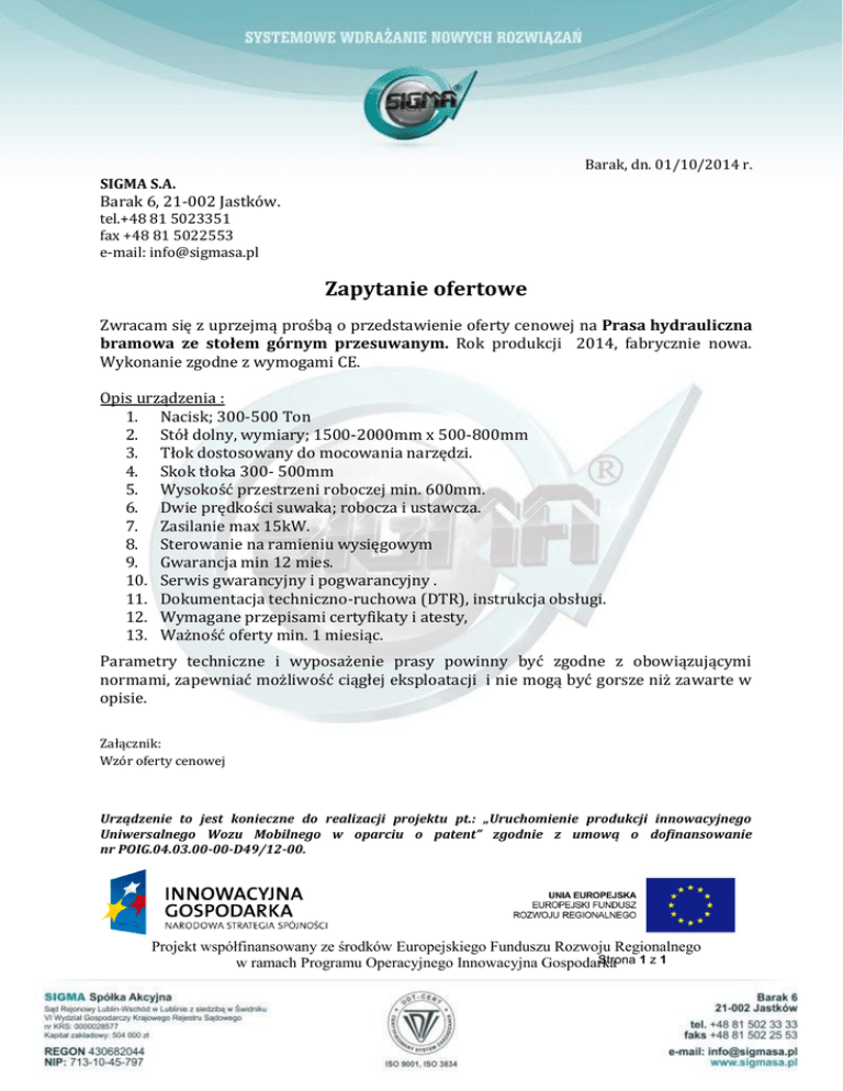 Barak, dn. 01/10/2014 r. SIGMA S.A. Barak 6, 21-002 Jastków. tel.+48 81 5023351 fax +48 81 5022553 e-mail: [email protected] Zapytanie ofertowe Zwracam się z uprzejmą prośbą o przedstawienie oferty cenowej na Prasa hydrauliczna bramowa ze stołem górnym przesuwanym. Rok produkcji 2014, fabrycznie nowa. Wykonanie zgodne z wymogami CE. Opis urządzenia : 1. Nacisk; 300-500 Ton 2. Stół dolny, wymiary; 1500-2000mm x 500-800mm 3. Tłok dostosowany do mocowania narzędzi. 4. Skok tłoka 300- 500mm 5. Wysokość przestrzeni roboczej min. 600mm. 6. Dwie prędkości suwaka; robocza i ustawcza. 7. Zasilanie max 15kW. 8. Sterowanie na ramieniu wysięgowym 9. Gwarancja min 12 mies. 10. Serwis gwarancyjny i pogwarancyjny . 11. Dokumentacja techniczno-ruchowa (DTR), instrukcja obsługi. 12. Wymagane przepisami certyfikaty i atesty, 13. Ważność oferty min. 1 miesiąc. Parametry techniczne i wyposażenie prasy powinny być zgodne z obowiązującymi normami, zapewniać możliwość ciągłej eksploatacji i nie mogą być gorsze niż zawarte w opisie. Załącznik: Wzór oferty cenowej Urządzenie to jest konieczne do realizacji projektu pt.: „Uruchomienie produkcji innowacyjnego Uniwersalnego Wozu Mobilnego w oparciu o patent” zgodnie z umową o dofinansowanie nr POIG.04.03.00-00-D49/12-00. Projekt współfinansowany ze środków Europejskiego Funduszu Rozwoju Regionalnego Strona 1 z 1 w ramach Programu Operacyjnego Innowacyjna Gospodarka
