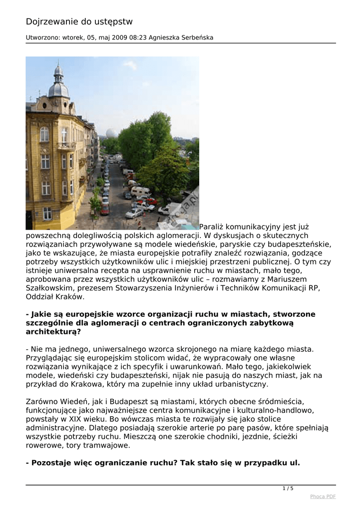 Dojrzewanie do ustępstw Utworzono: wtorek, 05, maj 2009 08:23 Agnieszka Serbeńska Paraliż komunikacyjny jest już powszechną dolegliwością polskich aglomeracji. W dyskusjach o skutecznych rozwiązaniach przywoływane są modele wiedeńskie, paryskie czy budapeszteńskie, jako te wskazujące, że miasta europejskie potrafiły znaleźć rozwiązania, godzące potrzeby wszystkich użytkowników ulic i miejskiej przestrzeni publicznej. O tym czy istnieje uniwersalna recepta na usprawnienie ruchu w miastach, mało tego, aprobowana przez wszystkich użytkowników ulic – rozmawiamy z Mariuszem Szałkowskim, prezesem Stowarzyszenia Inżynierów i Techników Komunikacji RP, Oddział Kraków. - Jakie są europejskie wzorce organizacji ruchu w miastach, stworzone szczególnie dla aglomeracji o centrach ograniczonych zabytkową architekturą? - Nie ma jednego, uniwersalnego wzorca skrojonego na miarę każdego miasta. Przyglądając się europejskim stolicom widać, że wypracowały one własne rozwiązania wynikające z ich specyfik i uwarunkowań. Mało tego, jakiekolwiek modele, wiedeński czy budapeszteński, nijak nie pasują do naszych miast, jak na przykład do Krakowa, który ma zupełnie inny układ urbanistyczny. Zarówno Wiedeń, jak i Budapeszt są miastami, których obecne śródmieścia, funkcjonujące jako najważniejsze centra komunikacyjne i kulturalno-handlowo, powstały w XIX wieku. Bo wówczas miasta te rozwijały się jako stolice administracyjne. Dlatego posiadają szerokie arterie po parę pasów, które spełniają wszystkie potrzeby ruchu. Mieszczą one szerokie chodniki, jezdnie, ścieżki rowerowe, tory tramwajowe. - Pozostaje więc ograniczanie ruchu? Tak stało się w przypadku ul. 1/5 Phoca PDF Dojrzewanie do ustępstw Utworzono: wtorek, 05, maj 2009 08:23 Agnieszka Serbeńska Karmelickiej w Krakowie, na której by usprawnić ruch tramwajowy ograniczono dostęp dla pojazdów indywidualnych. Społeczeństwo jest podzielone w opiniach o efektach takiego rozwiązania. - Układ śródmieścia Krakowa jest średniowieczny. Nawet ulica Karmelicka, choć powstała w XIX wieku, jest stworzona jako kontynuacja dawnych, średniowiecznych założeń urbanistycznych. Sposób zagospodarowania przestrzennego Krakowa jest odmienny niż w innych stolicach Europy. Rozwiązania komunikacyjne muszą więc siłą rzeczy być dopasowane do istniejących realiów. Cóż, nawet w wyobraźni nie da się przyjąć, że wyburzamy jedną pierzeję kamienic i tworzymy trakt na wzór wiedeńskiego Ringu. Przybliżę inne europejskie modele, skrajne do wcześniej przytoczonych, to jest miast włoskich. Tam prawie nic się nie robi, by ograniczyć ruch w śródmieściu. Nie wprowadza się żadnych zakazów wjazdu. Każdy kto ma ochotę wjechać i ma cierpliwość, by znaleźć miejsce do parkowania, może to uczynić. Natomiast w większości dużych włoskich miast wybudowano układy obwodnic śródmieścia o dużych przepustowościach. Nie opłaca się więc wjeżdżać w stare, wąskie ulice o ciasnej zabudowie. Samochód zostawia się na parkingach zlokalizowanych wzdłuż obwodnic i dalej po prostu przemieszcza się komunikacją publiczną: autobusem, tramwajem czy metrem. Nikt tam na siłę i bez wyraźnej potrzeby nie pcha się samochodem do centrum. W Polsce, ale też w ogóle w Europie Wschodniej, jesteśmy w fazie umiłowania samochodów. Ten stan był na zachodzie kontynentu powszechny w latach 60. A u nas stał się powszechny dopiero w latach 90. I nam jeszcze nie minęła faza motoryzacyjnego zachwytu. Obecne pokolenie aktywnych zawodowo wychowywało się w okresie, kiedy w rodzinach nie było aut, a jeśli były, to stanowiły luksus podnoszący prestiż społeczny. Trudno teraz wyobrazić sobie funkcjonowanie bez samochodu czy poruszanie się w celu załatwienia różnych spraw rowerem bądź autobusem. Wynika to z myślenia typu, że skoro mnie stać na auto, to dlaczego mam z niego nie korzystać. Dlatego pewne rozwiązania wprowadzone na zachodzie i tam akceptowalne społecznie, u nas jeszcze nie są do zastosowania. Myślę, że jako społeczeństwo mentalnie dojrzejemy do tego, by je w końcu zaaprobować. Może to nie będzie trwało tyle ile na zachodzie. Tam trzeba było trzydziestu czy czterdziestu lat. U nas na pewno ten okres się skróci o połowę. Do zmian więc brakuje nam jeszcze tych pięciu-ośmiu lat. 2/5 Phoca PDF Dojrzewanie do ustępstw Utworzono: wtorek, 05, maj 2009 08:23 Agnieszka Serbeńska Widać jednak, że nasze społeczeństwo szybko uczy się nowego podejścia do komunikacji. Krakowska „Karmelicka” jest tego najlepszym przykładem, wręcz podręcznikowym, na którym można uczyć studentów i pisać akademickie rozprawy. Otóż, kiedy problem narasta i dochodzi do takiego stadium, że staje się ogromnym kłopotem, wówczas samo społeczeństwo upomina się o jego rozwiązanie. Oczywiście nie jest ono zgodne co do tego jakie to ma być rozwiązanie, natomiast jest już pewne, że nie można zezwalać na to, że każdy i kiedy chce może wjeżdżać w ulicę i ją blokować. Segregacja ruchu staje się koniecznością. Ulica Karmelicka wskazuje zatem, że jako społeczeństwo powoli dojrzewamy do tego, by pewne obszary miast wyłączać z powszechnego ruchu samochodów osobowych. - Jaki więc będzie krakowski model organizacji ruchu? - Trudno w tej chwili przewidzieć. Wizje przyszłości kreślone dwadzieścia lat temu nijak się mają do obecnych realiów. Gdybym się teraz pokusił o odpowiedź, jakie rozwiązania będą funkcjonowały za dwadzieścia-trzydzieści lat, to też nie będą one miały wiele wspólnego z tym, co rzeczywiście się stanie. Jedno jest pewne: nie należy od razu wprowadzać drastycznych środków regulujących ruch, bo nie uzyska to powszechnej akceptacji. Dlatego z reguły najpierw stosuje się pewne ustępstwa, które nie zawsze są tożsame z istotą docelowych rozwiązań, mówiąc obrazowo – trochę dusza