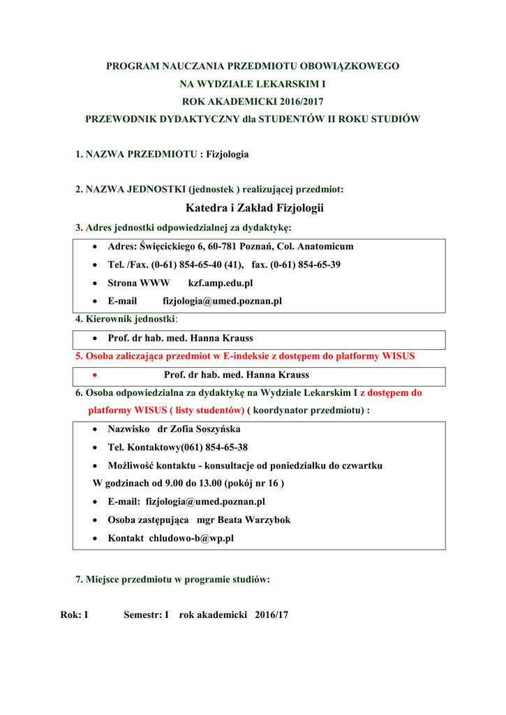 PROGRAM NAUCZANIA PRZEDMIOTU OBOWIĄZKOWEGO NA WYDZIALE LEKARSKIM I ROK AKADEMICKI 2016/2017 PRZEWODNIK DYDAKTYCZNY dla STUDENTÓW II ROKU STUDIÓW 1. NAZWA PRZEDMIOTU : Fizjologia 2. NAZWA JEDNOSTKI (jednostek ) realizującej przedmiot: Katedra i Zakład Fizjologii 3. Adres jednostki odpowiedzialnej za dydaktykę: Adres: Święcickiego 6, 60-781 Poznań, Col. Anatomicum Tel. /Fax. (0-61) 854-65-40 (41), fax. (0-61) 854-65-39 Strona WWW E-mail kzf.amp.edu.pl [email protected] 4. Kierownik jednostki: Prof. dr hab. med. Hanna Krauss 5. Osoba zaliczająca przedmiot w E-indeksie z dostępem do platformy WISUS Prof. dr hab. med. Hanna Krauss 6. Osoba odpowiedzialna za dydaktykę na Wydziale Lekarskim I z dostępem do platformy WISUS ( listy studentów) ( koordynator przedmiotu) : Nazwisko dr Zofia Soszyńska Tel. Kontaktowy(061) 854-65-38 Możliwość kontaktu - konsultacje od poniedziałku do czwartku W godzinach od 9.00 do 13.00 (pokój nr 16 ) E-mail: [email protected] Osoba zastępująca mgr Beata Warzybok Kontakt [email protected] 7. Miejsce przedmiotu w programie studiów: Rok: I Semestr: I rok akademicki 2016/17 8. Liczba godzin ogółem : 80 Jednostki uczestniczące w nauczaniu przedmiotu liczba pkt.ECTS: 8 Semestr zimowy/letni liczba godzin W Ć Ćwiczenia kategoria S Katedra i Zakład Fizjologii 20 36 A 24 Razem: 20 36 24 9. SYLABUS Nazwa przedmiotu/ modułu Fizjologia Wydział Nazwa kierunku studiów Poziom kształcenia Forma studiów Język przedmiotu Rodzaj przedmiotu Wydział Lekarski I Rok studiów/semestr II Liczba godzin zajęć dydaktycznych z podziałem na formy prowadzenia zajęć 80., w tym: Założenia i cele przedmiotu Poznanie podstawowych funkcji organizmu oraz procesów regulujących przebieg czynności życiowych u człowieka, a szczególnie zachowania homeostazy. Rozumienie znaczenia równowagi wewnętrznej oraz kontrolnej i regulacyjnej roli układu nerwowego i hormonalnego dla prawidłowego funkcjonowania organizmu. Znajomość fizjologii krwi, budowy i działania układu krążenia, układu oddechowego, mięśni poprzecznie prążkowanych i gładkich, układu pokarmowego, roli składników pokarmowych oraz witamin w żywieniu, działania układu moczowego, znaczenia nerki w utrzymywaniu homeostazy organizmu. Opanowanie umiejętności odróżniania prawidłowego przebiegu procesów życiowych od przebiegu nieprawidłowego, chorobowego. Poznanie i zdolność do Lekarski wyższy stacjonarne polski obowiązkowy 1 20 - wykłady, 24 - seminaria, 36 – ćwiczenia samodzielnej interpretacji podstawowych norm fizjologicznych. Umiejętność wykonania podstawowych badań funkcji życiowych. Rozumienie powiązań fizjologii z dyscyplinami klinicznymi. Symbol efektów kształcenia zgodnie ze standardami B. W5. B. W17. B. W21. B. W25. B. W28. B. W29. B. U7. B. U8. OPIS KIERUNKOWYCH EFEKTÓW KSZTAŁCENIA Metody weryfikacji osiągnięcia zamierzonych efektów kształcenia: Zna prawa fizyczne opisujące przepływ cieczy oraz czynniki wpływające na opór naczyniowy przepływu krwi Zna pojęcia potencjał oksydacyjny organizmu i stres oksydacyjny Test/rozmowa dydaktyczna Test/rozmowa dydaktyczna Zna funkcjonowanie podstawowych szlaków przekazywania sygnałów w komórce, a także przykłady zaburzeń w działaniu tych szlaków prowadzące do rozwoju nowotworów i innych chorób Zna czynność i mechanizmy regulacji wszystkich narządów i układów organizmu człowieka, w tym: układów krążenia, oddechowego, moczowego i pokarmowego oraz funkcje krwi Zna mechanizmy starzenia się organizmu Zna podstawowe ilościowe parametry opisujące wydolność poszczególnych układów i narządów, w tym: zakres normy i czynniki demograficzne wpływające na wartość tych parametrów Opisuje zmiany w funkcjonowaniu organizmu jako w sytuacji zaburzenia homeostazy, w szczególności określa jego zintegrowaną odpowiedź na wysiłek fizyczny, ekspozycję na wysoką i niską temperaturę, utratę krwi lub wody, nagłą pionizację, przejście od snu do stanu czuwania Wykonuje proste testy czynnościowe oceniające organizm człowieka jako układ regulacji stabilnej /testy obciążeniowe, wysiłkowe/; interpretacja danych liczbowych dotyczących podstawowych zmiennych fizjologicznych B.U11. Korzysta z baz danych, w tym internetowych, i wyszukuje potrzebną informację za pomocą dostępnych narzędzi B. U14. planowania i wykonywania prostych badań naukowych oraz interpretacji wyniki i wyciągania wniosków. KS.1. potrafi przedstawić wybrane problemy medyczne w formie ustnej w sposób adekwatny do poziomu odbiorców; Test/rozmowa dydaktyczna Test/rozmowa dydaktyczna Test/rozmowa dydaktyczna Test/rozmowa dydaktyczna Test sprawdzający Test sprawdzający Studium przypadku /dyskusja dydaktyczna Test umiejętności /dyskusja dydaktyczna dyskusja dydaktyczna KS.2. posiada świadomość własnych ograniczeń; dyskusja dydaktyczna KS.3. rozumie potrzebę stałego uzupełniania wiedzy dyskusja dydaktyczna potrafi pracować w zespole Studium przypadku/ dyskusja dydaktyczna KS.4. PUNKTY ECTS 8 TREŚCI MERYTORYCZNE PRZEDMIOTU: Tematyka Homeostaza płyny ustrojowe, zasadowa, termoregulacja Forma gospodarka kwasowo- Układ hormonalny - organizacja układu dokrewnego, mechanizmy wydzielania hormonów, działanie na komórkę docelową, receptory hormonów, transport we krwi, unieczynnianie; podwzgórze, przysadka mózgowa, szyszynka, fizjologia rozrodu, tarczyca, przytarczyce; gospodarka wapniowo-fosforanowa, nadnercza,trzustka. Wykłady, seminaria, ćwiczenia Wykłady, seminaria, ćwiczenia Układ nerwowy - komórka nerwowa, pobudliwość i pobudzenie, potencjał spoczynkowy i czynnościowy, synapsy nerwowe, przewodnictwo nerwowe, odruchy, regulacja ruchów i postawy ciała, Wykłady, czucie i percepcja, receptory czuciowe, czucie teleceptywne, seminaria, eksteroceptywne, proprioceptywne, interoceptywne, narządy zmysłów, ćwiczenia neurofizjologiczne podstawy zachowania się, czuwanie i sen, rytmy