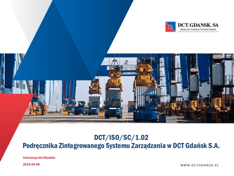 DCT/ISO/SC/1.02 Podręcznika Zintegrowanego Systemu Zarządzania w DCT Gdańsk S.A. Informacja dla Klientów 2016-04-08 ELEMENTY KSIĘGI JAKOŚCI 2 1. Terminologia 2. Informacja o Firmie 3. Podejście procesowe 4. Zakres Zintegrowanego Systemu Zarządzania 5. Odpowiedzialność, Uprawnienia i Komunikacja 6. Przegląd zarządzania 7. Realizacja wyrobu 8. Pomiary, analiza i doskonalenie 9. Nadzór nad dokumentacją i zapisami 3 1. Terminologia 4 2. Informacja o Firmie Nasza wizja DCT Gdańsk: Terminal pierwszego wyboru w sercu Bałtyku. Misja Nieustannie kreujemy wartość dodaną dla klientów i akcjonariuszy przez innowacyjny sposób zaspakajania potrzeb logistyczno - transportowych. Wartości, które wyrażają się w naszej codziennej pracy. Konkurencyjność - tworzymy unikatową ofertę zmieniając model logistyczny w regionie. Innowacyjność – nieustająco szukamy coraz lepszych sposobów zaspakajania potrzeb klientów, stawiając sobie nowe wyzwania. Solidność – dostarczamy usług na najwyższym poziomie, zawsze wywiązujemy się z podjętych zobowiązań. Odpowiedzialność społeczna – w rozumieniu DCT Gdańsk to bezkompromisowe podejście do bezpieczeństwa pracy i szacunek dla społeczności lokalnej i środowiska naturalnego. Więcej informacji o Firmie na stronie internetowej DCT Gdańsk S.A. 5 3. Podejście procesowe Zintegrowany System Zarządzania w DCT Gdańsk S.A. został zaplanowany i wdrożony zgodnie z wymaganiami norm: ISO 9001 „Systemy Zarządzania Jakością – wymagania” ISO 14001 „System Zarządzania Środowiskowego – wymagania” OHSAS 18001 „System Zarządzania Bezpieczeństwem i Higieny pracy – wymagania” Procesy realizowane w ramach systemu oraz ich wzajemne powiązania są przedstawione na Schemacie powiązań międzyprocesowych. Wejścia, wyjścia, metody nadzoru oraz kryteria skuteczności przebiegu ww. procesów są przedstawione w Matrycy procesów ZSZ. Procesy ZSZ są realizowane w sposób zaplanowany, nadzorowany i zgodny z wymaganiami norm ISO 9001 / ISO 14001 / OHSAS 18001, odpowiednich procedur i instrukcji postępowania. Zapisy powstałe w rezultacie monitorowania i nadzoru nad procesami potwierdzają skuteczność poszczególnych działań i nadzoru nad nimi. 6 4. Zakres SZJ Zintegrowany System Zarządzania DCT Gdańsk S.A. obowiązuje dla działalności w zakresie eksploatacji morskiego terminala kontenerowego. Zakres Zintegrowanego Systemu Zarządzania DCT Gdańsk S.A. obejmuje wszystkie wymagania norm ISO 14001:2005; OHSAS 18001:2007 oraz ISO 9001:2008 z wyłączeniem wymagań zawartych w: Podręcznik Zintegrowanego Systemu Zarządzania wydany został w wersji elektronicznej. Deklaracja Zrównoważonego Rozwoju, Procedury odnoszące się do Norm Systemowych oraz znaczna część dokumentacji ZSZ dostępna jest w wersji elektronicznej. 7 5. Odpowiedzialność, uprawnienia i komunikacja W DCT Gdańsk S.A. Najwyższe Kierownictwo stanowi Zarząd Firmy, którego kompetencje zostały przewidziane w Ustawie z dn. 15 września 2000 „Kodeks Spółek Handlowych” oraz w Statucie Spółki. Zarząd Firmy w szczególności: Określa politykę biznesową Firmy, Podejmuje decyzje o charakterze strategicznym dla Firmy, Jest uprawniony do uchylania decyzji pracowników niższego szczebla, w przypadkach które uzna za stosowne. Najpopularniejsze formy komunikacji wewnętrznej w DCT Gdańsk: Biuletyn firmowy Intranet Forum Spotkania kwartalne dla wszystkich pracowników Spotkania informacyjne 8 6. Przegląd Zarządzania Przegląd zarządzania odbywa się minimum raz w roku; jego celem jest zapewnienie że Zintegrowany System Zarządzania w DCT Gdańsk S.A. funkcjonuje skutecznie we wszystkich obszarach nim objętych i są podstawy do ciągłego doskonalenia (optymalizacji) jego elementów 9 7. Realizacja wyrobu 1. Planowanie realizacji wyrobów stanowi proces „planowanie placowe / planowanie statkowe” – wejścia / wyjścia, kryteria skuteczności, itp. 2. Procesy związane z klientem – stanowią procedury odnoszące się do kontroli ładunku. 3. Procesy związane z zakupami – stanowią procedury nadzoru nad podwykonawcami oraz oceny dostawców. 4. Nadzór nad realizacją procesów – stanowi matryca procesów. 5. Realizacja procesów wykonawczych – wszystkie procesy wykonawcze są realizowane w warunkach nadzorowanych. Elementy nadzoru oraz inne szczegóły dotyczące procesów są opisane w matrycy procesów oraz w kartach procesów. Jako procesy wymagające walidacji (czyli szkolenia personelu, zatwierdzenia wyposażenia, procedur postępowania, prób, testów i zatwierdzenia przed wdrożeniem do realizacji) uznano: Procesy rozładunku kontenerów ze statku, Procesy załadunku kontenerów na statek. Organizację i nadzorowanie procesów produkcyjnych określają właściwe procedury operacyjne. 6. Nadzorowanie procesu / wyrobu niezgodnego – sposób postępowania, odpowiedzialność, uprawnienia do podejmowania decyzji dotyczących procesów / wyrobów niezgodnych z wymaganiami określone są w procedurze nadzoru nad usługą niezgodną. 10 8. Pomiary, analiza i doskonalenie 8.1 Analiza i doskonalenie Do ciągłego doskonalenia ZSZ i jego procesów służą: regularnie przeprowadzane audity wewnętrzne i działania będące ich konsekwencją (dz. korygujące i zapobiegawcze), analiza danych dokonywana przez Dyrektorów pionów, przeglądy zarządzania (dokonywane przez kierownictwo), i działania będące ich następstwem (cele dot. ZSZ), działania doskonalące inicjowane przez pracowników DCT Gdańsk S.A. Rezultaty (dane wyjściowe) z procesów stanowią podstawę do bieżącej i okresowej analizy działalności Firmy, dokonywanej przez członków Najwyższego Kierownictwa. Pomocą jest tutaj analiza Matrycy procesów i wskaźników skuteczności tam ujętych. 11 8. Pomiary, analiza i doskonalenie 8.2 Satysfakcja klienta Jeden z najważniejszych wskaźników poddawanych okresowej analizie przez Kierownictwo Firmy. W 