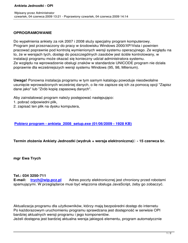 Ankieta Jednostki - OPI Wpisany przez Administrator czwartek, 04 czerwca 2009 13:21 - Poprawiony czwartek, 04 czerwca 2009 14:14 OPROGRAMOWANIE Do wypełnienia ankiety za rok 2007 i 2008 służy specjalny program komputerowy. Program jest przeznaczony do pracy w środowisku Windows 2000/XP/Vista i powinien pracować poprawnie pod kontrolą wymienionych wersji systemu operacyjnego. Ze względu na to, że w wersjach tych, dostęp do poszczególnych zasobów jest ściśle kontrolowany, w instalacji programu może okazać się konieczny udział administratora systemu. Ze względu na wprowadzenie obsługi znaków w standardzie UNICODE program nie działa poprawnie dla wcześniejszych wersji systemu Windows (95, 98, Milenium). Uwaga! Ponowna instalacja programu w tym samym katalogu powoduje nieodwołalne usunięcie wprowadzonych wcześniej danych, o ile nie zapisze się ich za pomocą opcji "Zapisz dane jako" lub "Zrób kopię zapasową danych". Aby zainstalować program należy postępować następująco: 1. pobrać odpowiedni plik, 2. zapisać ten plik na dysku komputera, Pobierz program - ankieta_2008_setup.exe (01/06/2009 - 1928 KB) Termin złożenia Ankiety Jednostki (wydruk + wersja elektroniczna) - 15 czerwca br. mgr Ewa Trych Tel.: 034 3250-711 E-mail: [email protected] Adres poczty elektronicznej jest chroniony przed robotami spamującymi. W przeglądarce musi być włączona obsługa JavaScript, żeby go zobaczyć. Aktualizacja programu dla użytkowników, którzy mają bezpośredni dostęp do internetu Po każdorazowym uruchomieniu programu sprawdzana jest dostępność w serwisie OPI bardziej aktualnych wersji programu i jego komponentów. Jeżeli dostępna jest bardziej aktualna wersja jakiegoś elementu, program automatycznie 1/2 Ankieta Jednostki - OPI Wpisany przez Administrator czwartek, 04 czerwca 2009 13:21 - Poprawiony czwartek, 04 czerwca 2009 14:14 przeprowadza aktualizację istniejącej lokalnie instalacji. Ochrona komputera (firewall) musi być tak skonfigurowana, aby umożliwiała programowi 'Ankieta jednostki" dostęp do internetu. Zamieszczony poniżej wzór Ankiety jednostki (plik pdf) służy wyłącznie do zapoznania się z jej zawartoścą merytoryczną. Wypełnienie Ankiety jednostki jest możliwe jedynie za pomocą specjalnego programu, zamieszczonego powyżej. Wzór Ankiety_jednostki_2008.pdf 2/2
