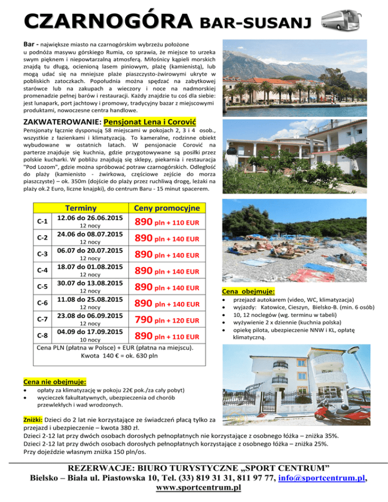 CZARNOGÓRA BAR-SUSANJ Bar - największe miasto na czarnogórskim wybrzeżu położone u podnóża masywu górskiego Rumia, co sprawia, że miejsce to urzeka swym pięknem i niepowtarzalną atmosferą. Miłośnicy kąpieli morskich znajdą tu długą, ocienioną lasem piniowym, plażę (kamienistą), lub mogą udać się na mniejsze plaże piaszczysto-żwirowymi ukryte w pobliskich zatoczkach. Popołudnia można spędzać na zabytkowej starówce lub na zakupach a wieczory i noce na nadmorskiej promenadzie pełnej barów i restauracji. Każdy znajdzie tu coś dla siebie: jest lunapark, port jachtowy i promowy, tradycyjny bazar z miejscowymi produktami, nowoczesne centra handlowe. ZAKWATEROWANIE: Pensjonat Lena i Corović Pensjonaty łącznie dysponują 58 miejscami w pokojach 2, 3 i 4 osob., wszystkie z łazienkami i klimatyzacją. To kameralne, rodzinne obiekt wybudowane w ostatnich latach. W pensjonacie Corović na parterze znajduje się kuchnia, gdzie przygotowywane są posiłki przez polskie kucharki. W pobliżu znajdują się sklepy, piekarnia i restauracja "Pod Lozom", gdzie można spróbować potraw czarnogórskich. Odległość do plaży (kamienisto - żwirkowa, częściowe zejście do morza piaszczyste) – ok. 350m (dojście do plaży przez ruchliwą drogę, leżaki na plaży ok.2 Euro, liczne knajpki), do centrum Baru - 15 minut spacerem. Terminy C-1 C-2 C-3 12.06 do 26.06.2015 12 nocy 24.06 do 08.07.2015 12 nocy 06.07 do 20.07.2015 12 nocy C-4 18.07 do 01.08.2015 C-5 30.07 do 13.08.2015 C-6 11.08 do 25.08.2015 C-7 C-8 12 nocy 12 nocy 12 nocy 23.08 do 06.09.2015 12 nocy 04.09 do 17.09.2015 10 nocy Ceny promocyjne 890 pln + 110 EUR 890 pln + 140 EUR 890 pln + 140 EUR 890 pln + 140 EUR 890 pln + 140 EUR 890 pln + 140 EUR 790 pln + 120 EUR 890 pln + 110 EUR Cena obejmuje: przejazd autokarem (video, WC, klimatyzacja) wyjazdy: Katowice, Cieszyn, Bielsko-B. (min. 6 osób) 10, 12 noclegów (wg. terminu w tabeli) wyżywienie 2 x dziennie (kuchnia polska) opiekę pilota, ubezpieczenie NNW i KL, opłatę klimatyczną. Cena PLN (płatna w Polsce) + EUR (płatna na miejscu). Kwota 140 € = ok. 630 pln Cena nie obejmuje: opłaty za klimatyzację w pokoju 22€ pok./za cały pobyt) wycieczek fakultatywnych, ubezpieczenia od chorób przewlekłych i wad wrodzonych. Zniżki: Dzieci do 2 lat nie korzystające ze świadczeń płacą tylko za przejazd i ubezpieczenie – kwota 380 zł. Dzieci 2-12 lat przy dwóch osobach dorosłych pełnopłatnych nie korzystające z osobnego łóżka – zniżka 35%. Dzieci 2-12 lat przy dwóch osobach dorosłych pełnopłatnych korzystające z osobnego łóżka – zniżka 25%. Przy dojeździe własnym zniżka 150 pln/os. REZERWACJE: BIURO TURYSTYCZNE „SPORT CENTRUM” Bielsko – Biała ul. Piastowska 10, Tel. (33) 819 31 31, 811 97 77, [email protected], www.sportcentrum.pl
