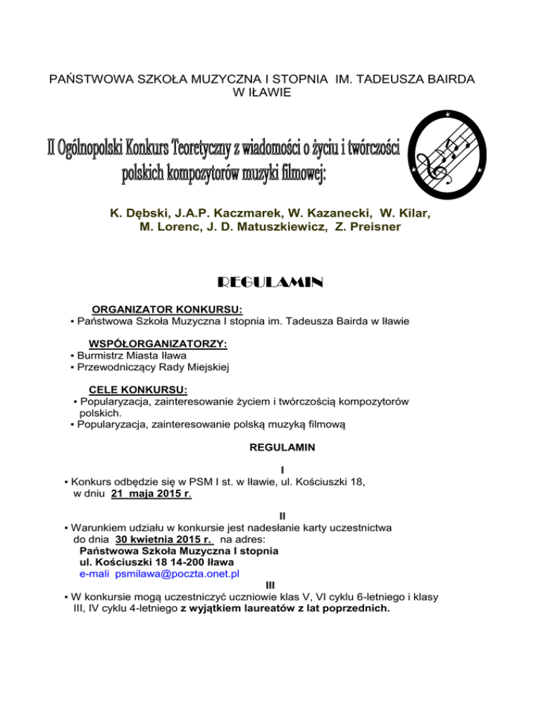 PAŃSTWOWA SZKOŁA MUZYCZNA I STOPNIA IM. TADEUSZA BAIRDA W IŁAWIE K. Dębski, J.A.P. Kaczmarek, W. Kazanecki, W. Kilar, M. Lorenc, J. D. Matuszkiewicz, Z. Preisner REGULAMIN ORGANIZATOR KONKURSU: ▪ Państwowa Szkoła Muzyczna I stopnia im. Tadeusza Bairda w Iławie WSPÓŁORGANIZATORZY: ▪ Burmistrz Miasta Iława ▪ Przewodniczący Rady Miejskiej CELE KONKURSU: ▪ Popularyzacja, zainteresowanie życiem i twórczością kompozytorów polskich. ▪ Popularyzacja, zainteresowanie polską muzyką filmową REGULAMIN I ▪ Konkurs odbędzie się w PSM I st. w Iławie, ul. Kościuszki 18, w dniu 21 maja 2015 r. II ▪ Warunkiem udziału w konkursie jest nadesłanie karty uczestnictwa do dnia 30 kwietnia 2015 r. na adres: Państwowa Szkoła Muzyczna I stopnia ul. Kościuszki 18 14-200 Iława e-mali [email protected] III ▪ W konkursie mogą uczestniczyć uczniowie klas V, VI cyklu 6-letniego i klasy III, IV cyklu 4-letniego z wyjątkiem laureatów z lat poprzednich. IV ▪ Wyniki konkursu ogłoszone zostaną po 4 godz. od zakończenia. V ▪ Konkurs będzie przebiegać w dwóch etapach: część słuchowa – 20 minut część teoretyczna – 45 minut ▪ Wyniki pierwszego etapu ogłoszone zostaną po 3 godz. od zakończenia tego etapu. VI ٭W wypadku jednakowej ilości punktów uczestnicy losują po 3 dodatkowe pytania (teoretyczne lub słuchowe). VII ٭Laureaci konkursu otrzymają nagrody i wyróżnienia. Wszyscy uczestnicy konkursu oraz ich opiekunowie otrzymają dyplomy uczestnictwa. VII ٭Nad całością konkursu będzie czuwało Jury powołane przez organizatorów. IX ٭Decyzja Jury jest ostateczna i niepodważalna. X ٭Informacji dotyczących konkursu udziela sekretariat szkoły, tel. 89-648-40-29. XI ▪ Zgłoszenia dokonane po wyznaczonym terminie nie będą przyjmowane ▪ W wyżej wymienionym terminie należy uiścić wpisowe w wysokości 40,(słownie: Czterdzieści złotych) od każdego uczestnika, na konto: Rada Rodziców Przy PSM w Iławie BS w Iławie nr 95 8831 0002 5001 0111 7623 0001 ٭W przypadku rezygnacji wpisowe nie ulega zwrotowi. ٭Koszty przejazdu, wyżywienia uczestników i osób towarzyszących pokrywają szkoły zgłaszające. ٭W zgłoszeniu należy określić ilość osób pragnących wykupić obiady. Można zamówić potrzebne materiału pisemnego do części teoretycznej do konkursu – meil-em lub faxem Materiały słuchowe we własnym zakresie. Literatura: 1. „Encyklopedia Muzyczna” część biograficzna. 2. Materiały o kompozytorach do części teoretycznej . 3. Literatura muzyczna (do przesłuchania we własnym zakresie) Literatura muzyczna: Jan A. P. Kaczmarek – „Marzyciel” (Finding Neverland (2004 r.) * Where is Barrie? *Dancing with the Bear *Neverland – Piano Variation in Blue - „Aimee and Jaguar” (1999 r.) *First Memories *Aimēe and Jaguar - „Całkowite zaćmienie” (1995 r.) *The Sea Quartet *Two Trains 2009 r. – „ Hachiko : A Dog’s Story” – To Train Together „Goodbye” Krzesimir Dębski – „Ogniem i mieczem” (1999 r.) *Pieśń Heleny *Gniew Bohuna *Szarża jazdy polskiej *Atak Kozaków - 1920: „Bitwa Warszawska (2011) * Romanza - Syberiada polska (2013) *Nim kartka spłonie - „W pustyni i w puszczy” (2000 r.) *Rzeka marzeń *Mama i Afryka *Arabska Rewolucja - Stara Baśń (2003) * Pieśń Wojciech Kilar – „Przygody Pana Michała” (1969 r.) „Smuga cienia” (1976 r.) „Trędowata” (1976 r.) „Bilans Kwartalny” (1975 r.) „Pan Tadeusz” Polonez (1999 r.) „Pianista” (2002 r.) „Zemsta” (2002 r.)” Mazur” „Ziemia Obiecana” (1975) Walc „Pan Tadeusz” (1999) „Mrówki” „Rodzina Połanieckich (1978) Zbigniew Preisner – „W matni” (1999 r.) (Eminent Domain) *Perte „Podwójne życie Weroniki” (1991 r.) *Marionnettes „Tajemniczy ogród” The Secret Garden (1993 r.) „Trzy kolory: Biały” (1993 r.) *Tango „Trzy kolory: Niebieski” (1993 r.) *Song for the unification of Europe Waldemar Kazanecki – „Do przerwy 0 : 1” 1969 r. „Noce i Dnie” reż J. Antczak 1975 r. * „Walc” * „Walc z epizodu nr 9” * „Motyw Agnieszki” * „Walc Celiny” „Czarne chmury” „Hrabina Cosel” „Brunet wieczorową porą” „Szaleństwa panny Ewy” 1984 r. (Ewo szalej dalej) Jerzy „Duduś” Matuszkiewicz - „Janosik” „Podróż za jeden uśmiech” „Wierna rzeka” „Stawka większa niż życie” „Czterdziestolatek” „Syzyfowe prace” (wersja kinowa) „Kolumbowie” „Wojna domowa” „Jak rozpętałem II Wojnę Światową” „ Panna z mokrą głową” 1994 (Uśmiechnij się) Michał Lorenc - „Bandyta” 1997 r. – Taniec Eleny „Oficer” 2005 r. „Przedwiośnie” 2000 r. „Taniec ognia” „Wspomnienie” „300 mil do nieba” 1989 r. – Droga (Ucieczka) „Daleko od okna” 2000 r. – Sztetl ze snów” „Psy” 2 – „Wieczory” KARTA ZGŁOSZENIA II Ogólnopolski Konkurs Teoretyczny z wiadomości o życiu i twórczości polskich kompozytorów muzyki filmowej 21 maja 2015 r. 1. Imię i nazwisko uczestnika: ......................................................................... 2. Szkoła: .......................................................................................................... ....................................................................................................................... 3. Klasa: ............................................................................................................ 4. Przygotowany przez nauczyciela: ................................................................ ...................................................................................................................... ...................................................................... (pieczątka i podpis dyrektora)