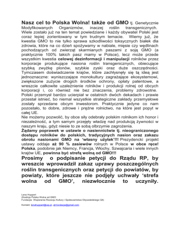 Nasz cel to Polska Wolna! także od GMO tj. Genetycznie Modyfikowanych Organizmów, inaczej roślin transgenicznych. Wiele zostało już na ten temat powiedziane i każdy obywatel Polski jest coraz lepiej zorientowany w tym trudnym temacie. Wiemy już, że kwestia GMO to nie tylko sprawa szkodliwości toksycznych białek dla zdrowia, które na co dzień spożywamy w nabiale, mięsie czy wędlinach pochodzących od zwierząt skarmianych paszami z soją GMO (a praktycznie 100% takich pasz mamy w Polsce), lecz może przede wszystkim kwestia celowej dezinformacji i manipulacji rolników przez korporacje produkujące nasiona roślin transgenicznych, obiecujące szybką zwyżkę plonów, szybkie zyski oraz duże oszczędności. Tymczasem doświadczenie krajów, które zachłysnęły się tą ideą jest jednoznaczne: wyniszczające monokultury zagrażające ekosystemowi, zwiększone zużycie drogich środków ochrony, opłaty patentowe, a wreszcie całkowite uzależnienie rolników i produkcji rolnej od obcych korporacji i, co również nie bez znaczenia, problemy zdrowotne. Polski przemysł bardzo ucierpiał w ostatnich dwóch dekadach i prawie przestał istnieć, bo niemal wszystkie strategiczne zakłady przemysłowe zostały sprzedane obcym inwestorom. Praktycznie jedyne co nam pozostało, to dobre, zdrowe i prężne rolnictwo, na które jest popyt w całej UE. Nie możemy pozwolić, by obce siły odebrały polskim rolnikom ich honor i niezależność, a tym samym przejęły władzę nad produkcją żywności w naszym kraju, gdyż niesie to ze sobą olbrzymie zagrożenia. Żądamy poprawek w ustawie o nasiennictwie tj. nieograniczonego dostępu rolników do polskich, tradycyjnych nasion oraz zakazu obrotu nasionami GMO na ‘własny użytek’!!! Prezydencki projekt ustawy oddaje aż 90 % zasiewów rolnych w Polsce w obce ręce! Polska, podobnie jak Niemcy, Francja, Włochy, Szwajcaria i wiele innych krajów UE, powinna być strefą wolną od GMO!!! Prosimy o podpisanie petycji do Rządu RP, by wreszcie wprowadził zakaz uprawy poszczególnych roślin transgenicznych oraz petycji do powiatów, by powiaty, które jeszcze nie podjęły uchwały ‘strefa wolna od GMO’, niezwłocznie to uczyniły. Lena Huppert (Koalicja Polska Wolna od GMO Fundacjia Wspierania Rozwoju Kultury i Społeczeństwa Obywatelskiego Qlt) Kontakt: [email protected], [email protected]