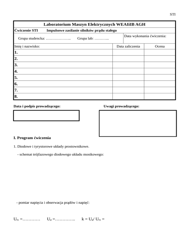 STI Laboratorium Maszyn Elektrycznych WEAIiIB AGH Ćwiczenie STI Impulsowe zasilanie silników prądu stałego Grupa studencka: ……………….. Grupa lab: ………... Imię i nazwisko: Data wykonania ćwiczenia: Data zaliczenia 1. 2. 3. 4. 5. 6. 7. 8. Data i podpis prowadzącego: Uwagi prowadzącego: I. Program ćwiczenia 1. Diodowe i tyrystorowe układy prostownikowe. - schemat trójfazowego diodowego układu mostkowego: - pomiar napięcia i obserwacja prądów i napięć: Uf1 =………… Ud =………….. k = Ud/ Uf1 = Ocena STI - schemat trójfazowego układu jednodrogowego - pomiar napięcia i obserwacja prądów i napięć: Uf1 =………… Ud =………….. k = Ud/ Uf1 = - tyrystorowe układy prostownikowe a) mostkowy trójfazowy b) jednodrogowy trójfazowy c) mostkowy jednofazowy - formowanie impulsów bramkowych tyrystorów STI 2. Sterowanie prędkością silnika obcowzbudnego za pomocą prostownika tyrystorowego. - schemat układu jednofazowego prostownika tyrystorowego w układzie nawrotnym - obserwacja prądów i napięć - porównanie charakterystyk n(I) układu napędowego ze sprzężeniem zwrotnym napięciowym oraz z kompensacją spadku napięcia na rezystancji twornika i układu ze sprzężeniem od prędkości obrotowej prąd silnika I [A] n prędkość obrotowa i napięcie w układzie ze sprzężeniem napięciowym [rpm] U [V] n prędkość obrotowa i napięcie [rpm] w układzie ze sprzężeniem U od prędkości obr. [V] STI 3. Sterowanie prędkością silnika szeregowego prądu stałego za pomocą przerywacza tranzystorowego (choppera ). - omówienie układu regulatora prędkości - schemat blokowy układu regulatora - wyznaczenie charakterystyki zewnętrznej napędu ( n = n(I)) i rejestracja przebiegów czasowych prądu silnika I [A] n [rpm] II. Sprawozdanie Narysować schematy i zamieścić zarejestrowane przebiegi czasowe prądów i napięć dla badanych układów prostownikowych. Objaśnić uzyskane przebiegi czasowe napięć i prądów. Wykreślić charakterystyki zewnętrzne n(I) silnika zasilonego z tyrystorowego prostownika sterowanego ze sprzężeniem zwrotnym napięciowym i ze sprzężeniem zwrotnym od prędkości obrotowej. Zamieścić zarejestrowane przebiegi czasowe prądów i napięć w tym układzie zasilania oraz schematy z punktu 2 ćwiczenia. Objaśnić uzyskane przebiegi czasowe napięć i prądów i przebiegi charakterystyk. Wykreślić charakterystykę zewnętrzną n(I) silnika zasilonego z przerywacza tranzystorowego. Zamieścić przebiegi czasowe prądu i napięcia silnika w tym układzie zasilania oraz schematy z punktu 3 ćwiczenia. Objaśnić uzyskane przebiegi czasowe napięć i prądów i przebiegi charakterystyk.