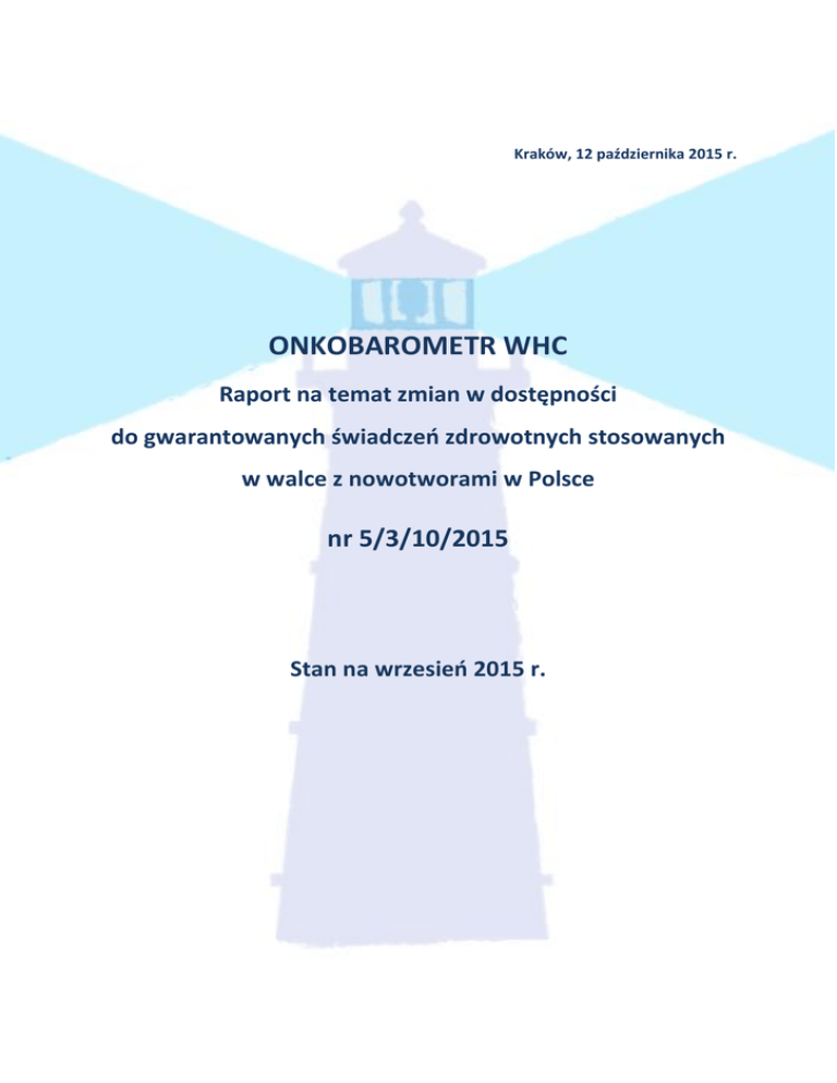 Kraków, 12 października 2015 r. ONKOBAROMETR WHC Raport na temat zmian w dostępności do gwarantowanych świadczeń zdrowotnych stosowanych w walce z nowotworami w Polsce nr 5/3/10/2015 Stan na wrzesień 2015 r. 1 Wszelkie prawa zastrzeżone – cytowanie fragmentów dozwolone ze wskazaniem źródła: „OnkoBarometr Fundacji Watch Health Care nr 5/3/10/2015”, www.korektorzdrowia.pl. Spis treści Najważniejsze wyniki .................................................................................................................. 3 Wstęp ..................................................................................................................................... 8 1. Fundacja Watch Health Care...................................................................................... 10 2. Pakiet onkologiczny.................................................................................................... 11 3. Metodyka ................................................................................................................... 15 4. OnkoBarometr WHC – wyniki .................................................................................... 18 4.1.1. Porównanie czasu oczekiwania w specjalistycznych centrach onkologicznych i pozostałych placówkach ......................................................................................................... 20 4.2. Dostępność ................................................................................................................. 21 4.2.1. Specjaliści ................................................................................................................... 21 4.2.2. Diagnostyka ................................................................................................................ 23 4.2.3. Zabiegi ........................................................................................................................ 27 4.2.4. Leczenie niezabiegowe .............................................................................................. 29 4.3. Etapowość leczenia .................................................................................................... 31 4.3.1. Etapowość postępowania w raku płuca .................................................................... 31 4.3.2. Etapowość postępowania w raku piersi .................................................................... 34 4.3.3. Etapowość postępowania w raku stercza .................................................................. 38 4.3.4. Etapowość postępowania w niedokrwistości i białaczce .......................................... 42 5. Wnioski ....................................................................................................................... 45 Spis rysunków ........................................................................................................................... 46 Załącznik ................................................................................................................................... 48 Bibliografia: .............................................................................................................................. 59 2 Wszelkie prawa zastrzeżone – cytowanie fragmentów dozwolone ze wskazaniem źródła: „OnkoBarometr Fundacji Watch Health Care nr 5/3/10/2015”, www.korektorzdrowia.pl. Najważniejsze wyniki Zmiana średniego czasu oczekiwania na „gwarantowane” onkologiczne świadczenia zdrowotne w Polsce, pacjenci BEZ karty DiLO. Średni czas oczekiwania na gwarantowane świadczenia zdrowotne w poszczególnych dziedzinach onkologicznych, pacjenci BEZ karty DiLO, wrzesień 2015. 3 Wszelkie prawa zastrzeżone – cytowanie fragmentów dozwolone ze wskazaniem źródła: „OnkoBarometr Fundacji Watch Health Care nr 5/3/10/2015”, www.korektorzdrowia.pl. Średni czas oczekiwania na gwarantowane świadczenia zdrowotne w poszczególnych dziedzinach onkologicznych, pacjenci z kartą DiLO, wrzesień 2015. Porównanie średniego czasu oczekiwania na gwarantowane świadczenia zdrowotne w poszczególnych dziedzinach onkologicznych, pacjenci BEZ karty DiLO vs. pacjenci z kartą DiLO, wrzesień 2015. 4 Wszelkie prawa zastrzeżone – cytowanie fragmentów dozwolone ze wskazaniem źródła: „OnkoBarometr Fundacji Watch Health Care nr 5/3/10/2015”, www.korektorzdrowia.pl. Czas oczekiwania na „gwarantowane” świadczenia onkologiczne we wrześniu 2015 r. (w tyg.), pacjenci z kartą DiLO. 5 Wszelkie prawa zastrzeżone – cytowanie fragmentów dozwolone ze wskazaniem źródła: „OnkoBarometr Fundacji Watch Health Care nr 5/3/10/2015”, www.korektorzdrowia.pl. Zmiany w czasie oczekiwania na gwarantowane świadczenia zdrowotne (w tyg.), wrzesień 2015 vs. maj 2015, pacjenci z kartą DiLO. Każdy słupek reprezentuje jedno świadczenie onkologiczne. Słupki w kolorze czerwonym przedstawiają, o ile wydłużył się czas w stosunku do poprzedniej weryfikacji, w kolorze zielonym oznaczają poprawę dostępu, natomiast słupki niebieskie oznaczają brak zmian - różnica +/- 1,1 tyg. 6 Wszelkie prawa zastrzeżone – cytowanie fragmentów dozwolone ze wskazaniem źródła: „OnkoBarometr Fundacji Watch Health Care nr 5/3/10/2015”, www.korektorzdrowia.pl. Skumulowany czas oczekiwania (w tyg.) na rozpoczęcie leczenia wybranych jednostek chorobowych BEZ karty DiLO. Skumulowany czas oczekiwania (w tyg.) na rozpoczęcie leczenia wybranych jednostek chorobowych z kartą DiLO. 7 Wszelkie prawa zastrzeżone – cytowanie fragmentów dozwolone ze wskazaniem źródła: „OnkoBarometr Fundacji Watch Health Care nr 5/3/10/2015”, www.korektorzdrowia.pl. Wstęp OnkoBarometr to raport Fundacji Watch Health Care dotyczący zmian dostępności do gwarantowanych świadczeń zdrowotnych w ramach onkologii, hematoonkologii, ginekologii onkologicznej, chirurgii onkologicznej i radioterapii onkologicznej w Polsce. W odróżnieniu od Barometru