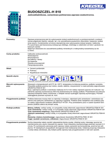 BUDOSZCZEL-H 810 Jednoskładnikowa, cementowo-polimerowa zaprawa wodochronna. Parametry: Zaprawa przeznaczona jest do wykonywania izolacji wodochronnych w pomieszczeniach o podwyższonej wilgotności (łaźnie, natryski, itp.), do uszczelniania powierzchni zbiorników i basenów, izolacji ścian piwnic i fundamentów od strony zewnętrznej oraz wykonywania izolacji tarasów i balkonów. Po wyschnięciu jest bezszwową izolacją typu lekkiego, średniego w zależności od ilości i grubości nałożonych warstw. Może być stosowana do uszczelniania podłoży mineralnych z maksymalną rozwartością rys do 0,75mm. Cechy produktu: Całkowita wodoszczelność Wodoodporna Mrozoodporna Na balkony i tarasy Do basenów Wysoka przyczepność Paroprzepuszczalna Skład: ● Cement portlandzki ● Polimery ● Wypełniacze mineralne Sposób użycia: Warunki wykonywania prac: Stosować w temperaturach od+5°C do +25°C, temperatury te dotyczą powietrza, podłoża i produktu. Wszystkie podłoża powinny być nośne, zwarte, stabilne, oczyszczone i w razie potrzeby zagruntowane GRUNTOLITEM-W 301 Rysy i pęknięcia podłoża o szerokości większej niż 0,4 mm należy naprawić poprzez ich rozkucie i wypełnienie zaprawą wyrównawczą 428 inną dostosowaną do rodzaju podłoża. Przewidziane do pokrycia zaprawą krawędzie należy zukosować, a wklęsłe naroża wyokrąglić zaprawą wyrównującą. Promień zaokrąglenia powinien wynosić ok. 4cm. Przygotowanie podłoża: Podłoża betonowe muszą mieć co najmniej 3 miesiące, natomiast tynki cementowe i cementowo-wapienne oraz jastrychy cementowe co najmniej 4 tygodnie. Podłoża silnie nasiąkliwe oraz podłoża pylące należy zagruntować środkiem GRUNTOLIT-W 301. Przy prowadzeniu prac w czasie wysokich temperatur podłoża zaleca się skropić wodą. Rodzaje podłoża: Betony, żelbety: zwilżyć wodą, a w przypadku dużej chłonność zagruntować GRUNTOLITEM-W 301 Tynk cementowy: zwilżyć wodą, a w przypadku dużej chłonność zagruntować GRUNTOLITEM-W 301 Tynk cementowo-wapienny: Zagruntować GRUNTOLITEM-W 301 Jastrych cementowy: zwilżyć wodą, a w przypadku dużej chłonność zagruntować GRUNTOLITEM-W 301 Elementy z betonu komórkowego: zagruntować dwukrotnie GRUNTOLITEM -W 301 Cegły i pustaki ceramiczne, silikatowe: Zagruntować GRUNTOLITEM-W 301 Przygotowanie produktu: Suchą mieszankę należy zarobić odpowiednią ilością czystej, chłodnej wody, mieszając ręcznie lub mechanicznie przy użyciu mieszarki do zapraw. Czas mieszania mechanicznego powinien wynosić 2-3 minuty. Po wymieszaniu pierwszej partii zaprawy należy sprawdzić jej konsystencję, powinna być półpłynna. W niezbędnych przypadkach skorygować ilość dodawanej wody. Ustaloną proporcję mieszania z wodą należy odnotować, aby kolejne partie zaprawy były przygotowywane w taki sam sposób. Karta techniczna 07.10.2014 strona 1/3 BUDOSZCZEL-H 810 Jednoskładnikowa, cementowo-polimerowa zaprawa wodochronna. W przypadku potrzeby wykorzystania części opakowania, całą suchą mieszankę należy starannie wymieszać, gdyż w czasie transportu mogło nastąpić rozdzielenie składników. Stwardniałej zaprawy nie mieszać z woda, ani ze świeżym materiałem. Sposób użycia: Przygotowaną zaprawę należy nakładać na uszczelnianą powierzchnię pędzlem, wałkiem lub pacą stalową warstwami o grubości uzależnionej od rodzaju wykonywanej izolacji wodochronnej. W przypadku zabezpieczania przed wilgocią całkowita grubość powłoki izolacyjnej powinna wynosić 2-2,5mm, w przypadku zabezpieczania przed wodą przesączającą 3-3,5mm, natomiast przy działaniu słupa wody o wysokości do 5 m – 4-4,5mm. Pierwszą cienką kontaktową warstwę nakłada się w celu zamknięcia porów w podłożu. Warstwę tą najlepiej wykonać twardą szczotką, przy górnej granicy wody zarobowej na opakowanie. Po jej naniesieniu należy odczekać ok.3 godziny, aby warstwa stwardniała i można było wykonywać następne. Kolejną warstwę nakłada się, gdy poprzednia jest jeszcze wilgotna. Pomiędzy wykonaniem każdej następnej warstwy należy także zachować przerwę technologiczną 3-4 godziny. Zaleca się drugą warstwę nakładać pacą. W przypadku dwukrotnego nakładania masy pędzlem należy zachować zasadę krzyżowania pociągnięć. Grubość pojedynczej warstwy izolacji powinna wynosić minimalnie 2mm, natomiast łączna maksymalna grubość ułożonej powłoki nie może przekroczyć 5mm. W przypadku tarasów i balkonów, w trakcie wykonywania izolacji należy w niej zatopić siatkę zbrojącą z włókna szklanego, a w miejscach połączeń z elementami pionowymi (np. ścianami) i w miejscach dylatacji - taśmę uszczelniającą. Uwagi wykonawcze: W czasie prac i wysychania chronić przed mrozem, opadami, zbyt szybkim wysychaniem. Należy unikać kontaktu ze skórą oraz chronić oczy. Szczegółowe wskazówki znajdują się w karcie charakterystyki. Przechowywanie: Maksymalnie 9 miesięcy w miejscach suchych i w nieuszkodzonych opakowaniach fabrycznych. Produkt zgodny z: EN 14891 Ilość w opakowaniu ● 25 kg/opak., 48 szt./paleta Parametry techniczne Zużycie Czas przydatności do użycia po zarobieniu wodą Czas wstępnego twardnienia Czas schnięcia Grubość warstwy Minimalna liczba nakładanych warstw masy Proporcje mieszania z wodą Karta techniczna 07.10.2014 1.5 - 1.7 kg/m²/mm 2 godziny (w temperaturze +20°C) Do 60 minut ok. 3 godziny (w temperaturze +20°C) 2-5mm 2 ok. 5-6 litrów wody na 25 kg suchej mieszanki strona 2/3 BUDOSZCZEL-H 810 Jednoskładnikowa, cementowo-polimerowa zaprawa wodochronna. Parametry techniczne Możliwość wykonywania dalszych prac Zawartość rozpuszczalnego chromu VI Wskazówki ogólne: Karta techniczna 07.10.2014 W zależności od grubości powłoki zakładając czas schnięcia 0,8 mm na dobę (przy temperaturze +20ºC ≤ 0,0002% Ta karta zastępuje wszystkie poprzednie wersje. Informacje zawarte w niniejsze