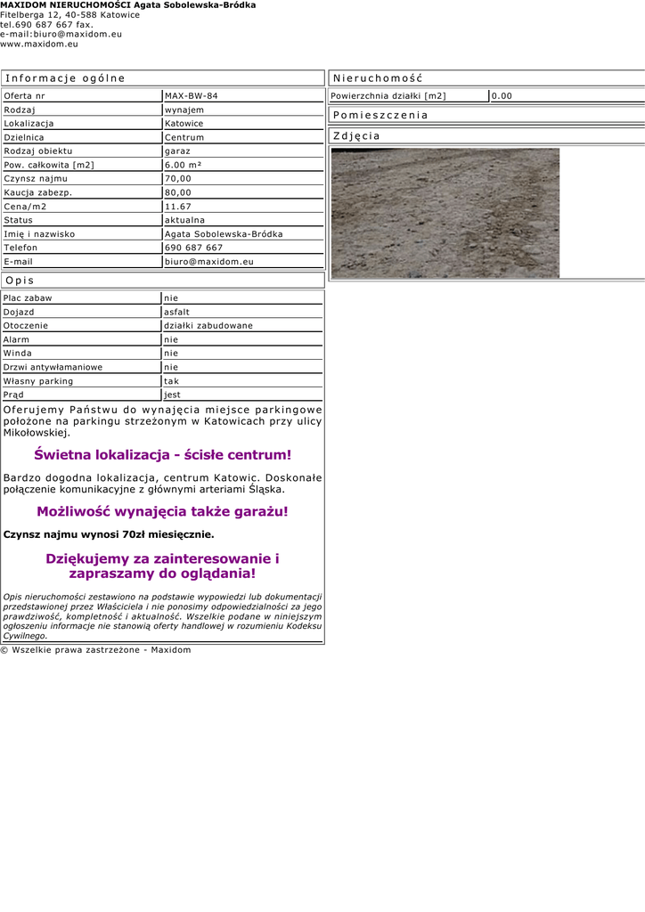 MAXIDOM NIERUCHOMOŚCI Agata Sobolewska-Bródka Fitelberga 12, 40-588 Katowice tel.690 687 667 fax. e-mail:[email protected] www.maxidom.eu Informacje ogólne Nieruchomość Oferta nr MAX-BW-84 Rodzaj wynajem Lokalizacja Katowice Dzielnica Centrum Rodzaj obiektu garaz Pow. całkowita [m2] 6.00 m² Czynsz najmu 70,00 Kaucja zabezp. 80,00 Cena/m2 11.67 Status aktualna Imię i nazwisko Agata Sobolewska-Bródka Telefon 690 687 667 E-mail [email protected] Opis Plac zabaw nie Dojazd asfalt Otoczenie działki zabudowane Alarm nie Winda nie Drzwi antywłamaniowe nie Własny parking tak Prąd jest Oferujemy Państwu do wynajęcia miejsce parkingowe położone na parkingu strzeżonym w Katowicach przy ulicy Mikołowskiej. Świetna lokalizacja - ścisłe centrum! Bardzo dogodna lokalizacja, centrum Katowic. Doskonałe połączenie komunikacyjne z głównymi arteriami Śląska. Możliwość wynajęcia także garażu! Czynsz najmu wynosi 70zł miesięcznie. Dziękujemy za zainteresowanie i zapraszamy do oglądania! Opis nieruchomości zestawiono na podstawie wypowiedzi lub dokumentacji przedstawionej przez Właściciela i nie ponosimy odpowiedzialności za jego prawdziwość, kompletność i aktualność. Wszelkie podane w niniejszym ogłoszeniu informacje nie stanowią oferty handlowej w rozumieniu Kodeksu Cywilnego. © Wszelkie prawa zastrzeżone - Maxidom Powierzchnia działki [m2] Pomieszczenia Zdjęcia 0.00