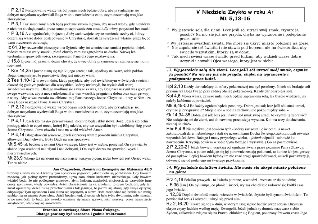 1 P 2,12 Postępowanie wasze wśród pogan niech będzie dobre, aby przyglądając się dobrym uczynkom wychwalali Boga w dniu nawiedzenia za to, czym oczerniają was jako złoczyńców. 1 P 3,1 Tak samo Ŝony niech będą poddane swoim męŜom, aby nawet wtedy, gdy niektórzy z nich nie słuchają nauki, przez samo postępowanie Ŝon zostali dla wiary pozyskani bez nauki, 1 P 3,16 A z łagodnością i bojaźnią BoŜą zachowujcie czyste sumienie, aŜeby ci, którzy oczerniają wasze dobre postępowanie w Chrystusie, doznali zawstydzenia właśnie przez to, co wam oszczerczo zarzucają. Iz 61,3 by rozweselić płaczących na Syjonie, aby im wieniec dać zamiast popiołu, olejek radości zamiast szaty smutku, pieśń chwały zamiast zgnębienia na duchu. Nazwą ich terebintami sprawiedliwości, szczepieniem Pana dla Jego rozsławienia. J 15,8 Ojciec mój przez to dozna chwały, Ŝe owoc obfity przyniesiecie i staniecie się moimi uczniami. 1 Kor 14,25 i jawne staną się tajniki jego serca; a tak, upadłszy na twarz, odda pokłon Bogu, oznajmiając, Ŝe prawdziwie Bóg jest między wami. 2 Tes 1,10-12 w owym dniu, kiedy przyjdzie, aby być uwielbionym w świętych swoich i okazać się godnym podziwu dla wszystkich, którzy uwierzyli, bo wyście dali wiarę świadectwu naszemu. Dlatego modlimy się zawsze za was, aby Bóg nasz uczynił was godnymi swego wezwania, aby z mocą udoskonalił w was wszelkie pragnienie dobra oraz czyn płynący z wiary. Aby w was zostało uwielbione imię Pana naszego Jezusa Chrystusa - a wy w Nim - za łaską Boga naszego i Pana Jezusa Chrystusa. 1 P 2,12 Postępowanie wasze wśród pogan niech będzie dobre, aby przyglądając się dobrym uczynkom wychwalali Boga w dniu nawiedzenia za to, czym oczerniają was jako złoczyńców. 1 P 4,11 JeŜeli kto ma dar przemawiania, niech to będą jakby słowa BoŜe. JeŜeli kto pełni posługę, niech to czyni mocą, której Bóg udziela, aby we wszystkim był uwielbiony Bóg przez Jezusa Chrystusa. Jemu chwała i moc na wieki wieków! Amen. 1 P 4,14 Błogosławieni jesteście, jeŜeli złorzeczą wam z powodu imienia Chrystusa, albowiem Duch chwały, BoŜy Duch na was spoczywa. Mt 5,45 tak będziecie synami Ojca waszego, który jest w niebie; poniewaŜ On sprawia, Ŝe słońce Jego wschodzi nad złymi i nad dobrymi, i On zsyła deszcz na sprawiedliwych i niesprawiedliwych. Mt 23,9 Nikogo teŜ na ziemi nie nazywajcie waszym ojcem; jeden bowiem jest Ojciec wasz, Ten w niebie. Jan Chryzostom, Homilie na Ewangelię św. Mateusza 43,5 Zróbmy z ziemi niebo. OkaŜmy tym sposobem poganom, jakich dóbr są pozbawieni. Gdy bowiem zobaczą, jak piękny Ŝywot prowadzimy, ujrzą sam obraz królestwa niebieskiego. Gdy bowiem widzieć będą, Ŝe nie podlegamy gniewowi, złym Ŝądzom, zazdrości, chciwości, Ŝe wszystkie inne cnoty spełniamy, wtedy powiedzą: JeŜeli chrześcijanie tu są aniołami, to czym będą oni, gdy ten świat opuszczą? JeŜeli tu są przechodniami i tak jaśnieją, to jakimi się staną, gdy swoją ojczyznę odzyskają? Tym sposobem i oni staną się lepszymi, a słowo BoŜe rozchodzić się będzie nie mniej szybko niŜ za czasów Apostołów. JeŜeli bowiem oni, chociaŜ ich było tylko dwunastu, całe miasta i kraje nawrócili, to bacz, jak wysoko wzniesie się nasza sprawa, jeśli wszyscy, przez nasze Ŝycie świątobliwe, staniemy się świadkami. Stronice te zawierają Słowa Pisma Świętego. Dlatego powinny być uczczone i godnie traktowane! V Niedziela Zwykła w roku A: Mt 5,13-16 13 14 15 16 Wy jesteście solą dla ziemi. Lecz jeśli sól utraci swój smak, czymŜe ją posolić? Na nic się juŜ nie przyda, chyba na wyrzucenie i podeptanie przez ludzi. Wy jesteście światłem świata. Nie moŜe się ukryć miasto połoŜone na górze. Nie zapala się teŜ światła i nie stawia pod korcem, ale na świeczniku, aby świeciło wszystkim, którzy są w domu. Tak niech świeci wasze światło przed ludźmi, aby widzieli wasze dobre uczynki i chwalili Ojca waszego, który jest w niebie. 13. Wy jesteście solą dla ziemi. Lecz jeśli sól utraci swój smak, czymŜe ją posolić? Na nic się juŜ nie przyda, chyba na wyrzucenie i podeptanie przez ludzi. Kpł 2,13 KaŜdy dar naleŜący do ofiary pokarmowej ma być posolony. Niech nie brakuje soli przymierza Boga twego przy Ŝadnej ofierze pokarmowej. KaŜdy dar posypiesz solą. Kol 4,6 Mowa wasza, zawsze miła, niech będzie zaprawiona solą, tak byście wiedzieli, jak naleŜy kaŜdemu odpowiadać. Mk 9,49-50 Bo kaŜdy ogniem będzie posolony. Dobra jest sól; lecz jeśli sól smak utraci, czymŜe ją przyprawicie? Miejcie sól w sobie i zachowujcie pokój między sobą!». £k 14,34-35 Dobra jest sól; lecz jeśli nawet sól smak swój utraci, to czymŜe ją zaprawić? Nie nadaje się ani do ziemi, ani do nawozu; precz się ją wyrzuca. Kto ma uszy do słuchania, niechaj słucha!» Hbr 6,4-6 NiemoŜliwe jest bowiem tych - którzy raz zostali oświeceni, a nawet zakosztowali daru niebieskiego i stali się uczestnikami Ducha Świętego, zakosztowali równieŜ wspaniałości słowa BoŜego i mocy przyszłego wieku, a jednak odpadli - odnowić ku nawróceniu. KrzyŜują bowiem w sobie Syna BoŜego i wystawiają Go na pośmiewisko. 2 P 2,20-21 JeŜeli bowiem uciekają od zgnilizny świata przez poznanie Pana i Zbawcy, Jezusa Chrystusa, a potem oddając się jej ponownie zostają pokonani, to koniec ich jest gorszy od początków. Lepiej bowiem byłoby im nie znać drogi sprawiedliwości, aniŜeli poznawszy ją odwrócić się od podanego im świętego przykazania. 14. Wy jesteście światłem świata. Nie moŜe się ukryć miasto połoŜone na górze. Prz 4,18 ŚcieŜka prawych - to światło poranne, wschodzi - wzrasta aŜ do południa; J 5,35 [Jan ] On był lampą, co płonie i świeci, wy zaś chcieliście radować się krótki czas jego światłem. J 12,36 Dopóki światłość macie, wierzcie w światłość, abyście byli synami światłości». To