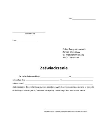 Data________________________ __________________________________ Pieczęć Koła L. dz. _____________________ Polski Związek Łowiecki Zarząd Okręgowy ul. Wodzisławska 10B 52-017 Wrocław Zaświadczenie Zarząd Koła Łowieckiego ___________________________ w _____________________ uchwałą z dnia ________________________________ nr _____________________________ zalicza Panu/i _________________________________________________________________ staż niezbędny do uzyskania uprawnień podstawowych do wykonywania polowania w zakresie określonym Uchwałą Nr 41/2007 Naczelnej Rady Łowieckiej z dnia 4 września 2007 r. ________________________________________ /Podpis osoby upoważnionej lub dwóch członków Zarządu/