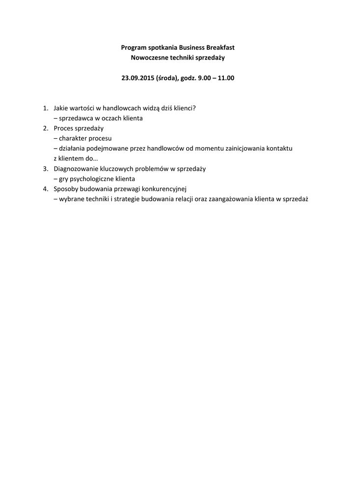 Program spotkania Business Breakfast Nowoczesne techniki sprzedaży 23.09.2015 (środa), godz. 9.00 – 11.00 1. Jakie wartości w handlowcach widzą dziś klienci? – sprzedawca w oczach klienta 2. Proces sprzedaży – charakter procesu – działania podejmowane przez handlowców od momentu zainicjowania kontaktu z klientem do… 3. Diagnozowanie kluczowych problemów w sprzedaży – gry psychologiczne klienta 4. Sposoby budowania przewagi konkurencyjnej – wybrane techniki i strategie budowania relacji oraz zaangażowania klienta w sprzedaż