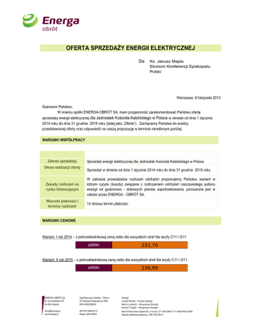OFERTA SPRZEDAŻY ENERGII ELEKTRYCZNEJ Dla Ks. Janusz Majda Ekonom Konferencji Episkopatu Polski Warszawa, 8 listopada 2013 Szanowni Państwo, W imieniu spółki ENERGA-OBRÓT SA, mam przyjemność zarekomendować Państwu ofertę sprzedaży energii elektrycznej dla Jednostek Kościoła Katolickiego w Polsce w okresie od dnia 1 stycznia 2014 roku do dnia 31 grudnia 2015 roku (dalej jako „Oferta”). Zachęcamy Państwa do analizy przedstawionej oferty oraz odpowiedź na naszą propozycję w terminie określonym poniżej. WARUNKI WSPÓŁPRACY Zakres sprzedaży Sprzedaż energii elektrycznej dla Jednostek Kościoła Katolickiego w Polsce Okres realizacji oferty Sprzedaż w okresie od dnia 1 stycznia 2014 roku do dnia 31 grudnia 2015 roku Zasady rozliczeń na rynku bilansującym W zakresie prowadzenia rozliczeń odchyleń proponujemy Państwu wariant w którym ryzyko (koszty) związane z rozliczaniem odchyleń rzeczywistego poboru energii od godzinowo - dobowych planów zapotrzebowania, ponoszone jest w całości przez ENERGA - OBRÓT SA. Warunki płatności i terminy rozliczeń 14 dniowy termin płatności WARUNKI CENOWE Wariant I rok 2014 – z jednoskładnikową ceną netto dla wszystkich stref dla taryfy C11 i G11 zł/MWh 231,76 Wariant II rok 2015 – z jednoskładnikową ceną netto dla wszystkich stref dla taryfy C11 i G11 zł/MWh 238,99 ENERGA-OBRÓT SA Al. Grunwaldzka 472 80-309 Gdańsk Sąd Rejonowy Gdańsk - Północ VII Wydział Gospodarczy KRS KRS 0000280916 Zarząd: Leszek Nowak – Prezes Zarządu Marcin Ludwicki – Wiceprezes Zarządu Konrad Tyrajski – Wiceprezes Zarządu [email protected] www.energa.pl NIP 957-096-83-70 Regon 220418835 Bank Polska Kasa Opieki SA, nr konta: 37 1240 5400 1111 0000 4918 5834 Kapitał zakładowy/wpłacony: 368 160 239 zł 1. Opłaty handlowe: a) za prowadzoną przez sprzedawcę obsługę handlową związaną z wystawianiem faktur i ich dostarczeniem stosowana będzie opłata w wysokości. Taryfa C11, G11: 5 zł. b) opłata handlowa będzie naliczana miesięcznie, w pełnej wysokości dla każdego z punktu poboru energii elektrycznej (licznika) Nie będą Państwo ponosili kosztów związanych z obsługą transakcji w tym odczytów i rozliczeń. 2. Do oferowanej ceny zostanie naliczony podatek VAT zgodnie z obowiązującymi przepisami prawa. Proponowane ceny energii elektrycznej dla odbiorcy końcowego uwzględniają podatek akcyzowy w wysokości obowiązującej na dzień zawarcia umowy sprzedaży energii elektrycznej/umowy kompleksowej oraz przewidywane na rok 2014 oraz 2015 koszty nabycia i umorzenia praw majątkowych wynikających ze świadectw pochodzenia energii elektrycznej (tzw. certyfikatów). Oznacza to gwarancję, że ofertowana cena nie ulegnie podwyższeniu nawet w przypadku zmian w obowiązujących na dzień składania niniejszej oferty przepisach prawa, mających wpływ na szacowany koszt nabycia i umorzenia certyfikatów, o których mowa powyżej. 4. Akceptacja Oferty jest równoznaczna z akceptacją regulaminu i umowy sprzedaży energii elektrycznej. 5. Niniejszy dokument został sporządzony zgodnie z art. 66 Kodeksu cywilnego. Termin ważności oferty 31.12.2013 roku do godziny 14.00 właściwego formularza Umowy/Porozumienia/Aneksu potwierdzającego formalnie związanie Stron niniejszą Umowę kompleksową/ Sprzedaży energii elektrycznej i dokona zmiany Sprzedawcy z ENERGA – OBRÓT SA 2/3