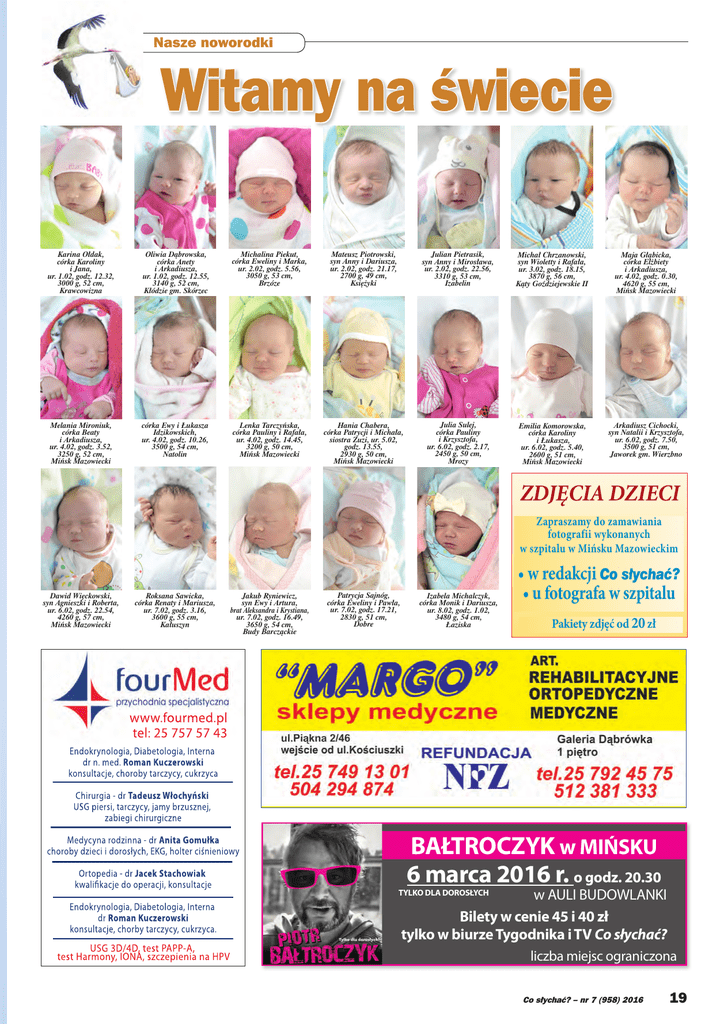 Nasze noworodki Witamy na świecie Karina Ołdak, córka Karoliny i Jana, ur. 1.02, godz. 12.32, 3000 g, 52 cm, Krawcowizna Oliwia Dąbrowska, córka Anety i Arkadiusza, ur. 1.02, godz. 12.55, 3140 g, 52 cm, Kłódzie gm. Skórzec Michalina Piekut, córka Eweliny i Marka, ur. 2.02, godz. 5.56, 3050 g, 53 cm, Brzóze Mateusz Piotrowski, syn Anny i Dariusza, ur. 2.02, godz. 21.17, 2700 g, 49 cm, Księżyki Julian Pietrasik, syn Anny i Mirosława, ur. 2.02, godz. 22.56, 3310 g, 53 cm, Izabelin Michał Chrzanowski, syn Wioletty i Rafała, ur. 3.02, godz. 18.15, 3870 g, 56 cm, Kąty Goździejewskie II Maja Głąbicka, córka Elżbiety i Arkadiusza, ur. 4.02, godz. 0.30, 4620 g, 55 cm, Mińsk Mazowiecki Melania Mironiuk, córka Beaty i Arkadiusza, ur. 4.02, godz. 3.52, 3250 g, 52 cm, Mińsk Mazowiecki córka Ewy i Łukasza Idzikowskich, ur. 4.02, godz. 10.26, 3500 g, 54 cm, Natolin Lenka Tarczyńska, córka Pauliny i Rafała, ur. 4.02, godz. 14.45, 3200 g, 50 cm, Mińsk Mazowiecki Hania Chabera, córka Patrycji i Michała, siostra Zuzi, ur. 5.02, godz. 13.55, 2930 g, 50 cm, Mińsk Mazowiecki Julia Sulej, córka Pauliny i Krzysztofa, ur. 6.02, godz. 2.17, 2450 g, 50 cm, Mrozy Emilia Komorowska, córka Karoliny i Łukasza, ur. 6.02, godz. 5.40, 2600 g, 51 cm, Mińsk Mazowiecki Arkadiusz Cichocki, syn Natalii i Krzysztofa, ur. 6.02, godz. 7.50, 3500 g, 51 cm, Jaworek gm. Wierzbno ZDJĘCIA DZIECI Zapraszamy do zamawiania fotografii wykonanych w szpitalu w Mińsku Mazowieckim Dawid Więckowski, syn Agnieszki i Roberta, ur. 6.02, godz. 22.54, 4260 g, 57 cm, Mińsk Mazowiecki Roksana Sawicka, córka Renaty i Mariusza, ur. 7.02, godz. 3.16, 3600 g, 55 cm, Kałuszyn Jakub Ryniewicz, syn Ewy i Artura, brat Aleksandra i Krystiana, ur. 7.02, godz. 16.49, 3650 g, 54 cm, Budy Barcząckie Patrycja Sajnóg, córka Eweliny i Pawła, ur. 7.02, godz. 17.21, 2830 g, 51 cm, Dobre Izabela Michalczyk, córka Monik i Dariusza, ur. 8.02, godz. 1.02, 3480 g, 54 cm, Łaziska • w redakcji Co słychać? • u fotografa w szpitalu Pakiety zdjęć od 20 zł www.fourmed.pl tel: 25 757 57 43 Endokrynologia, Diabetologia, Interna dr n. med. Roman Kuczerowski konsultacje, choroby tarczycy, cukrzyca Chirurgia - dr Tadeusz Włochyński USG piersi, tarczycy, jamy brzusznej, zabiegi chirurgiczne M edycyna rodzinna - dr Anita Gomułka choroby dzieci i dorosłych, EKG, holter ciśnieniowy Ortopedia - dr Jacek Stachowiak kwalifikacje do operacji, konsultacje Endokrynologia, Diabetologia, Interna dr Roman Kuczerowski konsultacje, chorby tarczycy, cukrzyca. USG 3D/4D, test PAPP-A, test Harmony, IONA, szczepienia na HPV BAŁTROCZYK w MIŃSKU 6 marca 2016 r. o godz. 20.30 w AULI BUDOWLANKI Bilety w cenie 45 i 40 zł tylko w biurze Tygodnika i TV Co słychać? TYLKO DLA DOROSŁYCH liczba miejsc ograniczona Co słychać? – nr 7 (958) 2016 19