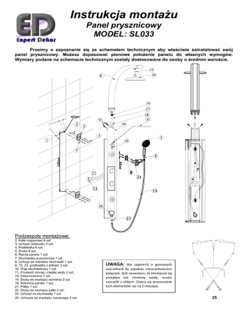 Instrukcja montażu Panel prysznicowy MODEL: SL033 Prosimy o zapoznanie się ze schematem technicznym aby właściwie zainstalować swój panel prysznicowy. Możesz dopasować pionowe położenie panelu do własnych wymogów. Wymiary podane na schemacie technicznym zostały dostosowane do osoby o średnim wzroście. Podzespoły montażowe: 2. Kołki rozporowe 6 szt. 3. Uchwyt (wieszak) 2 szt. 4. Podkładka 6 szt. 5. Śruba 6 szt. 6. Ramię panelu 1 szt. 7. Słuchawka prysznicowa 1 szt. 8. Uchwyt do montażu słuchawki 1 szt. 9, 13, 23. podkładka z sitkiem 3 szt. 10. Wąż słuchawkowy 1 szt. 11. Przewód zimnej i ciepłej wody 2 szt. 14. Deszczownica 1 szt. 15. Śruby do montażu ramienia 2 szt. 19. Kolumna panelu 1 szt. 21. Półka 1 szt. 22. Śruby do montażu półki 2 szt. 24. Uchwyt na słuchawkę 1 szt. 25. Uchwyty do montażu narożnego 2 szt. UWAGA: Nie zapomnij o gumowych uszczelkach by zapobiec nieszczelnościom połączeń. Jeśli zauważysz, że zmniejszył się przepływ lub ciśnienie wody, oczyść uszczelki z sitkiem. Zaleca się oczyszczanie tych elementów raz na 2 miesiące. 25 Montaż ścienny 1. 2. 3. 4. 5. Ramię prysznica (6) z wężem (16) przykręć śrubami (15) do kolumny. Umieść gumową podkładkę (17) w nakrętce węża (18) i połącz węże (16) i (18). Umieść gumową podkładkę (13) w głowicy prysznicowej (deszczownicy)(14). Połącz głowicę prysznicową (deszczownicę) (14) z ramieniem prysznica (6). Wybierz właściwe umiejscowienie dla kolumny i zaznacz miejsca nawierceń otworów Ø7 mm (1). Wywierć otwory w odległości 35mm (górne) i 20mm (dolne) od siebie. Wywierć otwory tak, aby odległość pomiędzy górnymi i dolnymi otworami wynosiła 600mm. 6. Umieść kołki rozporowe (2) w wywierconych otworach. 7. Dokręć do ściany śruby (5) z podkładkami ze stali nierdzewnej (4). Pozostaw główki śrub 5mm od ściany. 8. Umieść uszczelki z sitkiem (12) w elastycznych wężach dopływu wody gorącej (11) i zimnej (11). 9. Połącz elastyczne węże dopływu wody gorącej (11) i zimnej (11) z odpowiednimi odpływami gorącej (12) i zimnej (12) wody. 10. Umieść gumową uszczelkę (9) w nakrętce i przyłącz wąż (10) do prysznica ręcznego (słuchawki) (7). 11. Umieść prysznic ręczny (słuchawkę) (7) w uchwycie (24). Montaż narożny W przypadku instalacji narożnej należy zamontować wsporniki do montażu narożnego 5. Wybierz właściwe umiejscowienie dla kolumny i zaznacz miejsca nawierceń otworów Ø7mm. Wywierć otwory w odległości 55mm od narożnika. Wywierć otwory tak, aby odległość pomiędzy górnymi i dolnymi otworami wynosiła 600mm. 6. Umieść kołki rozporowe w wywierconych otworach. Przykręć do ściany wspornik do montażu narożnego (25). Użyj śrub (5) z podkładkami ze stali nierdzewnej (4). 10. Zawieś wsporniki montażowe na wspornikach do montażu narożnego. Pozostałe etapy montażu są takie same jak w przypadku montażu ściennego. --------------------------------------------------------------------------------------------------------------------------------------------Proszę upewnić się, że żaden z wężyków nie jest zagięty ani skręcony przed zakończeniem montażu. Należy również skontrolować szczelność oraz sprawdzić czy przepływ wody jest prawidłowy. --------------------------------------------------------------------------------------------------------------------------------------------- Expert Dekor s.c. A. Surowiec M. Więckowski Zawada 164 33-112 Tarnowiec [email protected] www.domitp.pl