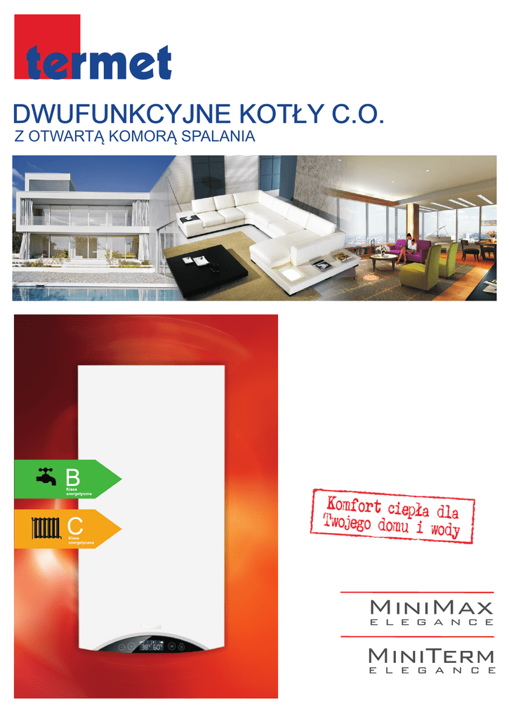 Z OTWART¥ KOMOR¥ SPALANIA A A MiniMax e l e g a n c e MiniMax e l e g a n c e Urz¹dzenia MiniMax Elegance i MiniTerm Elegance nale¿¹ do grupy najmniejszych kot³ów w swojej klasie, w Europie. S¹ bardzo nowoczesnymi, ³atwymi w obs³udze i monta¿u dwufunkcyjnymi urz¹dzeniami typu B1, zapewniaj¹cymi ciep³o na potrzeby centralnego ogrzewania oraz ciep³ej wody u¿ytkowej. Zastosowane rozwi¹zania techniczne zapewniaj¹ wysoki komfort u¿ytkowania, d³ugotrwa³¹ i bezawaryjn¹ pracê oraz optymalne koszty eksploatacji. Kot³y MiniMax i MiniTerm nale¿y instalowaæ zgodnie z obowi¹zuj¹cymi w tym zakresie przepisami a w szczególnoœci Rozporz¹dzeniami UE wydanymi na podstawie Dyrektyw ErP oraz ELD. ZALETY U¯YTKOWO-TECHNICZNE: ? MiniMax Elegance ? MiniMax Elegance ? MiniTerm Elegance 7-13 kW c.o., 7-24 kW c.w.u. 7-24 kW c.o., 7-24 kW c.w.u. 7-24 kW c.o., 7-24 kW c.w.u. (typ GCO-DP-13-10 (13/24)) (typ GCO-DP-13-10 (24/24)) (typ GCO-DP-21-23) - wbudowana pompa energooszczêdna z elektroniczn¹ regulacj¹ obrotów. - bardzo ma³e gabaryty urz¹dzenia zaledwie 700 mm wysokoœci, 360 mm szerokoœci i 300 mm g³êbokoœci. - nowoczesny panel sterowania wyposa¿ony w display wyœwietlaj¹cy wszystkie funkcje kot³a jak: temperatura w uk³adzie c.o. i c.w.u., ciœnienie w instalacji c.o., aktualny stan pracy kot³a, kody b³êdów, nastawy parametrów pracy itd. - funkcja ³agodnego zap³onu. - funkcja sta³ej temperatury wody u¿ytkowej. - p³ytowy wymiennik ciep³a wykonany ze stali szlachetnej (MiniMax). - nowej generacji bitermiczny wymiennik ciep³a wykonany z miedzi, montowany na szybkoz³¹czach (MiniTerm). - bardzo ³atwy dostêp do wszystkich podzespo³ów. - funkcja przeciw blokowaniu siê pompy. - funkcja antyzamarzaniowa. - funkcja przeciw odk³adaniu siê kamienia na wymienniku g³ównym. - funkcja regulacji pogodowej (w przypadku pod³¹czenia zewnêtrznego czujnika temperatury). - kompletny system zabezpieczeñ. - dostosowane do ka¿dego rodzaju gazu. MiniMax PARAMETRY GCO-DP-13-10 13/24 GCO-DP-13-10 24/24 AKCESORIA DODATKOWE: GCO-DP-21-23 OBIEG C.O. Klasa sezonowej efektywnoœci energetycznej ogrzewania pomieszczeñ Znamionowa moc cieplna Prated kW 13 Sezonowa efektywnoœæ energetyczna ogrzewania pomieszczeñ Sprawnoœæ u¿yteczna kot³a (NCV) Max ciœnienie wody w obiegu c.o. Max temperatura pracy Temperatura nastawiana Poj. naczynia wzbiorczego OBIEG C.W.U. 91,4 MP a (bar) 77 93,1 0,3 (3) 95 40 - 85 24 93,5 DOBOWY termet 1210 B L Deklarowany profil obci¹¿enia (wartoœæ obliczeniowa) 24 6 Klasa sezonowej efektywnoœci energetycznej ogrzewania wody Efektywnoœæ energetyczna podgrzewania wody Przep³yw wody u¿ytkowej przy ? t=30°C Mo¿liwoœæ sterowania prac¹ kot³ów za pomoc¹ regulatorów temperatury pomieszczeñ: C 70 /min termet ST-292 V3 11,4 Temperatura wody nastawiana 30-60 MP a (bar) 0,01 (0,1) - 0,6 (6) Ciœnienie wody przep³ywowy Rodzaj wymiennika c.w.u. p³ytowy bitermiczny PARAMETRY HYDRAULICZNE I ELEKTRYCZNE, OCHRONA ŒRODOWISKA, WYMIARY 34800 QHE kWh 62000 Roczne zu¿ycie energii 62000 0 Roczne zu¿ycie energii elektrycznej AEC kWh Roczne zu¿ycie paliwa Poziom mocy akustycznej Wymiary gabarytowe Masa kot³a AFC GJ Lwa dB kg Pod³¹czenie do przewodu kominowego Przy³¹cze wody grzewczej i gazu Przy³¹cze wody u¿ytkowej cale cale 14 57 700 x 360 x 300 26 Ø 130 G 3/4 G 1/2 TYGODNIOWY, PROGRAMOWALNY termet ST-292 V2 BEZPRZEWODOWY, TYGODNIOWY, PROGRAMOWALNY 58-160 Œwiebodzice, ul.D³uga 13 Dzia³ Sprzeda¿y tel. 74 854 15 05, fax 74 854 07 03 Dzia³ Serwisu tel. 74 854 04 46, Dzia³ Marketingu tel. 74 854 25 49 www.termet.com.pl