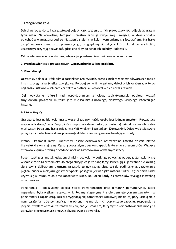 1. Fotograficzne koło Dzieci wchodzą do sali warsztatowej pojedynczo, każdemu z nich prowadzący robi zdjęcie aparatem typu instax. Na wywołanej fotografii uczestnik zapisuje swoje imię i miejsce, w które chciałby pojechać w wymarzoną podróż. Następnie stajemy w kole i wymieniamy się fotografiami. Na hasło „stop” wypowiedziane przez prowadzącego, przyglądamy się zdjęciu, które akurat do nas trafiło, uczestnicy zaczynają opowiadać, gdzie chcieliby pojechać ich koledzy i koleżanki. Cel: zaintrygowanie uczestników, integracja, przełamanie anonimowości w muzeum. 2. Przedstawienie się prowadzących, wprowadzenie w ideę projektu. 3. Film i dźwięk Uczestnicy oglądają krótki film o Łazienkach Królewskich, części z nich rozdajemy odtwarzacze mp4 z inną niż oryginalna ścieżką dźwiękową. Po obejrzeniu filmu pytamy dzieci o ich wrażenia, o to co najbardziej utkwiło w ich pamięci, także o nastrój jaki wywołał w nich obraz i dźwięk. Cel: wywołanie refleksji nad współdziałaniem zmysłów, subiektywnością odbioru wrażeń zmysłowych, pokazanie muzeum jako miejsca nietuzinkowego, ciekawego, kryjącego interesujące historie. 4. Gra w zmysły Gra oparta jest na idei osiemnastowiecznej zabawy. Każda osoba jest jednym zmysłem. Prowadzący wypowiada słowa/hasła. Zmysł, który rozpoznaje dane hasło (np. perfumy), jako dostępne dla siebie musi wstać. Podajemy hasła związane z XVIII wiekiem i Łazienkami Królewskimi. Dzieci wplatają swoje pomysły na hasła. Nasze słowa prowokują działania animacyjne uruchamiające zmysły. Płótno i fragment ramy - uczestnicy (osoby odgrywające poszczególne zmysły) dostają płótno i kawałek drewnianej ramy. Opisują pozostałym dzieciom zapach, fakturę tych przedmiotów. Wszyscy członkowie grupy próbują odgadnąć możliwe zastosowania wskazanych rzeczy. Puder, sypki gips, motek jedwabnych nici - pozwalamy dotknąć, powąchać puder, zastanawiamy się wspólnie co to za przedmioty, do czego służyły, co je ze sobą łączy. Puder, gips i jedwabna nić kojarzą się z czymś delikatnym, ulotnym, wszystkie te trzy rzeczy służą też do podkreślenia, zatrzymania piękna: puder w makijażu, gips w przypadku posągów, jedwab jako materiał sukni. Części z nich nadal używa się w muzeum do prac konserwatorskich. Na końcu każdy z uczestników wyciąga jedwabną nitkę z motka. Pomarańcza - pokazujemy zdjęcia Starej Pomarańczarni oraz fontanny perfumeryjnej, która napełniana była olejkami eterycznymi. Robimy eksperyment z olejkiem eterycznym zawartym w pomarańczy i zapalniczką. Dzieci przyglądają się pomarańczy wnikliwiej niż do tej pory, dzielą się z nami wrażeniami, że pomarańcza nie obrana nie ma dla nich oczywistego zapachu, rozpoznają ją jedynie zmysłem wzroku, zastanawiamy się nad jej smakiem, łączymy z osiemnastowieczną modą na uprawianie egzotycznych drzew, z obyczajowością dworską. Przyprawy – dzieci siadają z zamkniętymi oczami. Z biblioteczki wyjmujemy szufladę wypełnioną przyprawami typowymi dla XVIII wieku. Uczestnicy odgadują zawarte tam składniki. Mówią o swoich skojarzeniach z tym zapachem. Dźwięki –uczestnicy wsłuchują się w dźwięki zarejestrowane w Ogrodzie Łazienkowskim i próbują zgadnąć co wydaje dany dźwięk, z jaka sytuacją się wiąże. Cel: przekazanie wiedzy połączone z uruchomieniem wszystkich zmysłów, budowanie historii na podstawie dźwięków. 5. Królewska malarnia Uczestnicy słuchają opisu obrazu – jednego z dzieł z królewskiej kolekcji. Starają się wykonać szkic według wskazówek prowadzącego, który wciela się w króla zamawiającego konkretny obraz. Uczestnicy porównują swój szkic z oryginałem wyświetlonym na ścianie. Cel: efekt zaskoczenia, postawienie uczestników w roli królewskich malarzy, dyskusja o subiektywności odbioru dzieła sztuki, przekazanie wiedzy na temat pasji kolekcjonerskich króla i trudnej pracy królewskich malarzy 7. Relacja z podróży Dzielimy dzieci na kilka grup. Każda z nich uda się za chwilę w podróż po muzeum w celu znalezienia eksponatów, o których będzie chciała opowiedzieć reszcie dzieci. Relacja z podróży musi przebiegać w niekonwencjonalny sposób. Dzieci mogą „opowiedzieć” o przedmiotach za pomocą działań ruchowych, dźwięku (bez użycia słów), podczas gdy reszta grupy odgaduje, które to eksponaty. Cel: aktywizacja uczestników, pokazanie im nowego niż standardowy sposób opowiadania o swoich przeżyciach, emocjach. 6. Mój wybór Dzieci na koniec wybierają jeden z eksponatów muzeum, który wydał się im najciekawszy, którego historię chcieliby poznać i kładą przy nim swoje zdjęcie. Cel: podkreślenie roli każdego, kto odwiedza muzeum, nawiązanie relacji pomiędzy uczestnikiem a eksponatem Opracowały: Agata Pietrzyk, Agnieszka Doniec