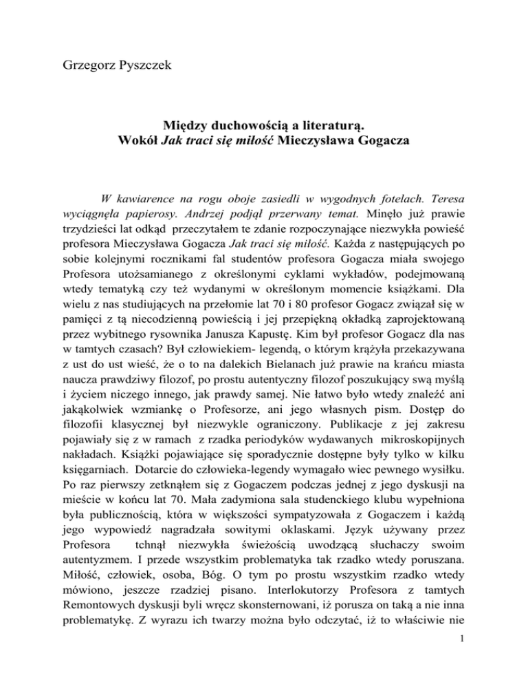 Grzegorz Pyszczek Między duchowością a literaturą. Wokół Jak traci się miłość Mieczysława Gogacza W kawiarence na rogu oboje zasiedli w wygodnych fotelach. Teresa wyciągnęła papierosy. Andrzej podjął przerwany temat. Minęło już prawie trzydzieści lat odkąd przeczytałem te zdanie rozpoczynające niezwykła powieść profesora Mieczysława Gogacza Jak traci się miłość. Każda z następujących po sobie kolejnymi rocznikami fal studentów profesora Gogacza miała swojego Profesora utożsamianego z określonymi cyklami wykładów, podejmowaną wtedy tematyką czy też wydanymi w określonym momencie książkami. Dla wielu z nas studiujących na przełomie lat 70 i 80 profesor Gogacz związał się w pamięci z tą niecodzienną powieścią i jej przepiękną okładką zaprojektowaną przez wybitnego rysownika Janusza Kapustę. Kim był profesor Gogacz dla nas w tamtych czasach? Był człowiekiem- legendą, o którym krążyła przekazywana z ust do ust wieść, że o to na dalekich Bielanach już prawie na krańcu miasta naucza prawdziwy filozof, po prostu autentyczny filozof poszukujący swą myślą i życiem niczego innego, jak prawdy samej. Nie łatwo było wtedy znaleźć ani jakąkolwiek wzmiankę o Profesorze, ani jego własnych pism. Dostęp do filozofii klasycznej był niezwykle ograniczony. Publikacje z jej zakresu pojawiały się z w ramach z rzadka periodyków wydawanych mikroskopijnych nakładach. Książki pojawiające się sporadycznie dostępne były tylko w kilku księgarniach. Dotarcie do człowieka-legendy wymagało wiec pewnego wysiłku. Po raz pierwszy zetknąłem się z Gogaczem podczas jednej z jego dyskusji na mieście w końcu lat 70. Mała zadymiona sala studenckiego klubu wypełniona była publicznością, która w większości sympatyzowała z Gogaczem i każdą jego wypowiedź nagradzała sowitymi oklaskami. Język używany przez Profesora tchnął niezwykła świeżością uwodzącą słuchaczy swoim autentyzmem. I przede wszystkim problematyka tak rzadko wtedy poruszana. Miłość, człowiek, osoba, Bóg. O tym po prostu wszystkim rzadko wtedy mówiono, jeszcze rzadziej pisano. Interlokutorzy Profesora z tamtych Remontowych dyskusji byli wręcz skonsternowani, iż porusza on taką a nie inna problematykę. Z wyrazu ich twarzy można było odczytać, iż to właściwie nie 1 wypada mówić o takich sprawach, iż to niepoważne. Jednak zgromadzona publiczność miała na to zgoła przeciwne zdanie. Ceniła Gogacza za podjecie właśnie tych żywo interesujących ją zagadnień. O powieści Jak traci się miłość jest pozycja ważną w bogatym i cennym dorobku Profesora z co najmniej dwóch względów. Po pierwsze jest klamrą spełniającą dwie najistotniejsze sfery jego aktywności, naukowa i pedagogiczną. W Jak traci się miłość Znajdziemy z jednej strony większość podstawowych myśli charakterystycznych dla oryginalnych koncepcji Gogacza, z drugiej zaś strony możemy spacerując po stronicach tej powieści wręcz dosłownie odetchnąć atmosferą spotkań z Profesorem. Specjalnie i z premedytacją napisałem spotkań, a nie seminariów i wykładów. Profesor Gogacz starał się zawsze, ażeby jego zajęcia akademickie były nie tylko typowymi akademickimi seminariami i wykładami, lecz były także spotkaniami osób. Z działalnością pedagogiczną Profesora ściśle był związany wymóg personalizmu. Działalność intelektualna w tej perspektywie polegała na tym, iż konkretna osoba myśli, pisze, wykłada dla innych konkretnych osób. Spotkania z profesorem Gogaczem nie ograniczały się zresztą tylko do sali wykładowej. Niezwykle istotne były także dysputy, które prowadził Profesor poza terenem uczelni, jak te, o których wspominałem mające miejsce w w latach 70 w warszawskim klubie Remont. Do tego dodajmy cały szereg półprywatnych i prywatnych spotkań z Profesorem np., w nieistniejącym już Empiku na Wolskiej lub w prywatnym mieszkaniu na Synów Pułku, w czasie których, w niepowtarzalny sposób, przeprowadzana z pozycji czystego intelektu metafizyczna analiza pierwszych zasad przeplatała się z pełnymi humoru biograficznymi opowieściami Profesora. Dla Gogacza działalność pedagogiczna nigdy nie była nieznośna pańszczyzną, której odrobienie ma umożliwić wspięcie się na szczyty akademickiej hierarchii, lecz samym sednem, jądrem jego filozofowania i wspólnego poszukiwania prawdy. Refleks tej niepowtarzalnej, niesamowitej aury filozofowania Gogacza przemyka przez zdania Jak traci się miłość? Jeżeli chodzi o treść tej powieści to możemy tu napotkać wszystkie podstawowe wątki koncepcji etycznej Gogacza, którą budował i rozwijał przez lata. Chodzi mi oczywiście o jego fascynująca teorię relacji osobowych, w 2 której to integralnie i ściśle związane z sobą były relacje osobowe wiążące nas z Bogiem i z innymi ludźmi. Konsekwentnie rozwijając relacje osobowe z innymi ludźmi muszę napotkać Boga, konsekwentnie rozwijając relacje osobowe z Bogeim muszę napotkać innych ludzi. Tak odczytuję przesłanie tej teorii, której ilustracją jest Jak traci się miłość. Warto jednak wspomnieć nieco dłużej o formie powieści profesora Mieczysława Gogacza. Większość filozofów o ile w ogóle wchodzą na teren literatury, raczej zdecydowanie ignoruje problem formy, kształtu powieści. Przypadek Jak traci się miłość jest zgoła odmiennej natury, Od samego początku lektury tej powieści czuć dbałość autora nie tylko o treść własnego przekazu, ale także o jego formę. Autor jest po prostu w pełni przekonany o tym, iż w przypadku literatury w przeciwieństwie do dyskursu czysto racjonalnego, intelektualnego, filozoficznego forma nie jest tylko techniką przekazu treści, lecz sama w pewnym zakresie stanowi o znaczeniu i sensie danego utworu. Powieść Gogacza odwołując się do podziałów i typologii stosowanych w literaturoznawstwie można by zaklasyfi