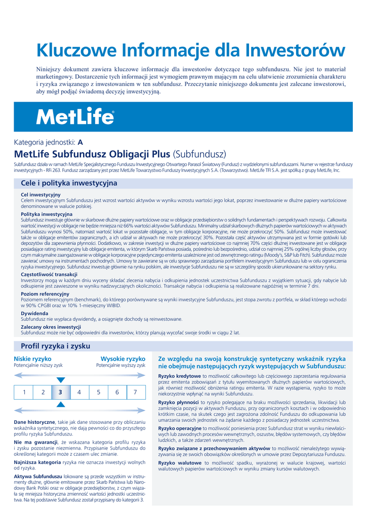 Kluczowe Informacje dla Inwestorów Niniejszy dokument zawiera kluczowe informacje dla inwestorów dotyczące tego subfunduszu. Nie jest to materiał marketingowy. Dostarczenie tych informacji jest wymogiem prawnym mającym na celu ułatwienie zrozumienia charakteru i ryzyka związanego z inwestowaniem w ten subfundusz. Przeczytanie niniejszego dokumentu jest zalecane inwestorowi, aby mógł podjąć świadomą decyzję inwestycyjną. Kategoria jednostki: A MetLife Subfundusz Obligacji Plus (Subfundusz) Subfundusz działa w ramach MetLife Specjalistycznego Funduszu Inwestycyjnego Otwartego Parasol Światowy (Fundusz) z wydzielonymi subfunduszami. Numer w rejestrze funduszy inwestycyjnych - RFi 263. Fundusz zarządzany jest przez MetLife Towarzystwo Funduszy Inwestycyjnych S.A. (Towarzystwo). MetLife TFI S.A. jest spółką z grupy MetLife, Inc. Cele i polityka inwestycyjna Cel inwestycyjny Celem inwestycyjnym Subfunduszu jest wzrost wartości aktywów w wyniku wzrostu wartości jego lokat, poprzez inwestowanie w dłużne papiery wartościowe denominowane w walucie polskiej. Polityka inwestycyjna Subfundusz inwestuje głównie w skarbowe dłużne papiery wartościowe oraz w obligacje przedsiębiorstw o solidnych fundamentach i perspektywach rozwoju. Całkowita wartość inwestycji w obligacje nie będzie mniejsza niż 66% wartości aktywów Subfunduszu. Minimalny udział skarbowych dłużnych papierów wartościowych w aktywach Subfunduszu wynosi 50%, natomiast wartość lokat w pozostałe obligacje, w tym obligacje korporacyjne, nie może przekroczyć 50%. Subfundusz może inwestować także w obligacje emitentów zagranicznych, a ich udział w aktywach nie może przekroczyć 30%. Pozostała część aktywów utrzymywana jest w formie gotówki lub depozytów dla zapewnienia płynności. Dodatkowo, w zakresie inwestycji w dłużne papiery wartościowe co najmniej 70% części dłużnej inwestowane jest w obligacje posiadające rating inwestycyjny lub obligacje emitenta, w którym Skarb Państwa posiada, pośrednio lub bezpośrednio, udział co najmniej 25% ogólnej liczby głosów, przy czym maksymalne zaangażowanie w obligacje korporacyjne pojedynczego emitenta uzależnione jest od zewnętrznego ratingu (Moody’s, S&P lub Fitch). Subfundusz może zawierać umowy na instrumentach pochodnych. Umowy te zawierane są w celu sprawnego zarządzania portfelem inwestycyjnym Subfunduszu lub w celu ograniczenia ryzyka inwestycyjnego. Subfundusz inwestuje głównie na rynku polskim, ale inwestycje Subfunduszu nie są w szczególny sposób ukierunkowane na sektory rynku. Częstotliwość transakcji Inwestorzy mogą w każdym dniu wyceny składać zlecenia nabycia i odkupienia jednostek uczestnictwa Subfunduszu z wyjątkiem sytuacji, gdy nabycie lub odkupienie jest zawieszone w wyniku nadzwyczajnych okoliczności. Transakcje nabycia i odkupienia są realizowane najpóźniej w terminie 7 dni. Poziom referencyjny Poziomem referencyjnym (benchmark), do którego porównywane są wyniki inwestycyjne Subfunduszu, jest stopa zwrotu z portfela, w skład którego wchodzi w 90% CPGBI oraz w 10% 1-miesięczny WIBID. Dywidenda Subfundusz nie wypłaca dywidendy, a osiągnięte dochody są reinwestowane. Zalecany okres inwestycji Subfundusz może nie być odpowiedni dla inwestorów, którzy planują wycofać swoje środki w ciągu 2 lat. Profil ryzyka i zysku Niskie ryzyko Wysokie ryzyko Potencjalnie niższy zysk 1 2 3 4 Potencjalnie wyższy zysk Ze względu na swoją konstrukcję syntetyczny wskaźnik ryzyka nie obejmuje następujących ryzyk występujących w Subfunduszu: 5 Ryzyko kredytowe to możliwość całkowitego lub częściowego zaprzestania regulowania przez emitenta zobowiązań z tytułu wyemitowanych dłużnych papierów wartościowych, jak również możliwość obniżenia ratingu emitenta. W razie wystąpienia, ryzyko to może niekorzystnie wpłynąć na wyniki Subfunduszu. 6 7 Dane historyczne, takie jak dane stosowane przy obliczaniu wskaźnika syntetycznego, nie dają pewności co do przyszłego profilu ryzyka Subfunduszu. Nie ma gwarancji, że wskazana kategoria profilu ryzyka i zysku pozostanie niezmienna. Przypisanie Subfunduszu do określonej kategorii może z czasem ulec zmianie. Najniższa kategoria ryzyka nie oznacza inwestycji wolnych od ryzyka. Aktywa Subfunduszu lokowane są przede wszystkim w instrumenty dłużne, głównie emitowane przez Skarb Państwa lub Narodowy Bank Polski oraz w obligacje przedsiębiorstw, z czym wiązała się mniejsza historyczna zmienność wartości jednostki uczestnictwa. Na tej podstawie Subfundusz został przypisany do kategorii 3. Ryzyko płynności to ryzyko polegające na braku możliwości sprzedania, likwidacji lub zamknięcia pozycji w aktywach Funduszu, przy ograniczonych kosztach i w odpowiednio krótkim czasie, na skutek czego jest zagrożona zdolność Funduszu do odkupowania lub umarzania swoich jednostek na żądanie każdego z posiadaczy jednostek uczestnictwa. Ryzyko operacyjne to możliwość poniesienia przez Subfundusz strat w wyniku niewłaściwych lub zawodnych procesów wewnętrznych, oszustw, błędów systemowych, czy błędów ludzkich, a także zdarzeń wewnętrznych. Ryzyko związane z przechowywaniem aktywów to możliwość nienależytego wywiązywania się ze swoich obowiązków określonych w umowie przez Depozytariusza Funduszu. Ryzyko walutowe to możliwość spadku, wyrażonej w walucie krajowej, wartości walutowych papierów wartościowych w wyniku zmiany kursów walutowych. Opłaty Opłaty jednorazowe pobierane przed lub po dokonaniu inwestycji Opłata dystrybucyjna Opłata umorzeniowa 0,50% brak Jest to maksymalna kwota, jaka może zostać pobrana z Państwa środków przed ich zainwestowaniem Opłaty pobierane z Subfunduszu w ciągu roku Opłaty i koszty bieżące 1,74% Opłaty pobierane z Subfunduszu w określonych warunkach szczególnych Opłata za wyniki brak Opłaty ponoszone przez inwestorów służą pokryciu 