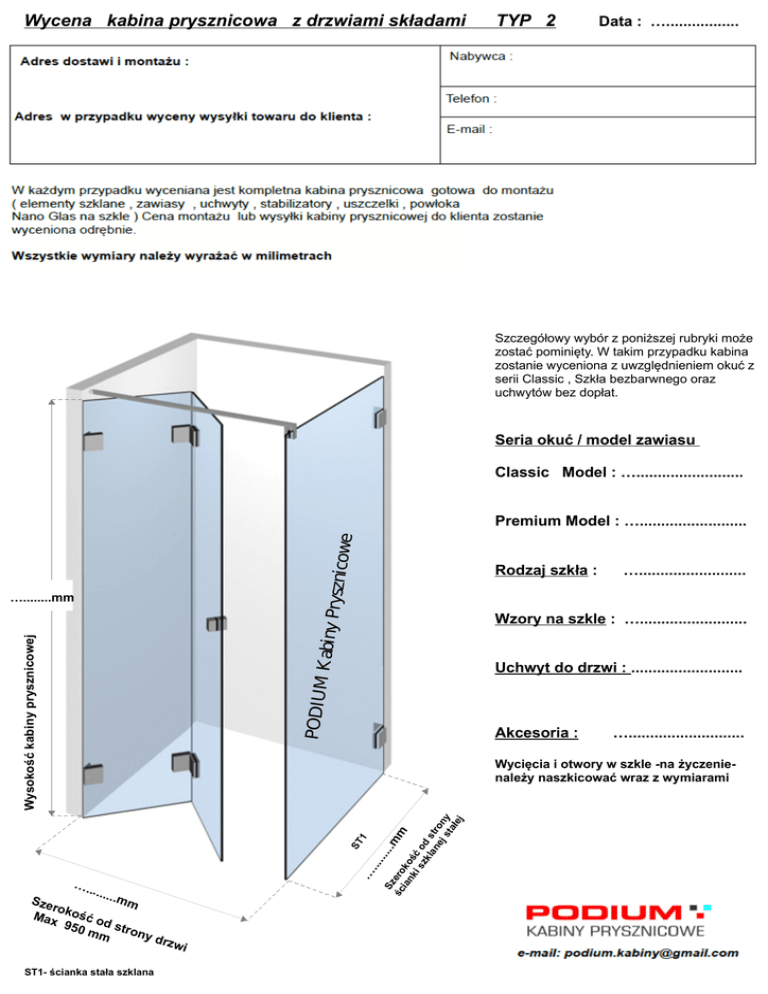 Wycena kabina prysznicowa z drzwiami składami TYP 2 Data : …................. Szczegółowy wybór z poniższej rubryki może zostać pominięty. W takim przypadku kabina zostanie wyceniona z uwzględnieniem okuć z serii Classic , Szkła bezbarwnego oraz uchwytów bez dopłat. Seria okuć / model zawiasu Classic Model : …......................... PODI UM K abiny P rysznico we Premium Model : …......................... Wysokość kabiny prysznicowej …........mm Rodzaj szkła : Wzory na szkle : …......................... Uchwyt do drzwi : .......................... Akcesoria : an o ki ść sz od kl an str ej on st y ał ej .... .... Sz .m śc ero m i k ST 1 ST1- ścianka stała szklana …........................... Wycięcia i otwory w szkle -na życzenienależy naszkicować wraz z wymiarami … ….. ..... ..m Sze m rok Max ość o 950 d str ony mm …......................... drzw i