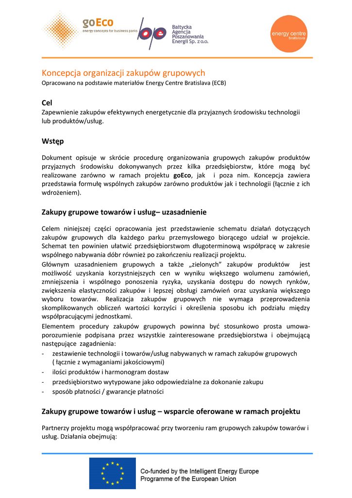 Koncepcja organizacji zakupów grupowych Opracowano na podstawie materiałów Energy Centre Bratislava (ECB) Cel Zapewnienie zakupów efektywnych energetycznie dla przyjaznych środowisku technologii lub produktów/usług. Wstęp Dokument opisuje w skrócie procedurę organizowania grupowych zakupów produktów przyjaznych środowisku dokonywanych przez kilka przedsiębiorstw, które mogą być realizowane zarówno w ramach projektu goEco, jak i poza nim. Koncepcja zawiera przedstawia formułę wspólnych zakupów zarówno produktów jak i technologii (łącznie z ich wdrożeniem). Zakupy grupowe towarów i usług– uzasadnienie Celem niniejszej części opracowania jest przedstawienie schematu działań dotyczących zakupów grupowych dla każdego parku przemysłowego biorącego udział w projekcie. Schemat ten powinien ułatwić przedsiębiorstwom długoterminową współpracę w zakresie wspólnego nabywania dóbr również po zakończeniu realizacji projektu. Głównym uzasadnieniem grupowych a także „zielonych” zakupów produktów jest możliwość uzyskania korzystniejszych cen w wyniku większego wolumenu zamówień, zmniejszenia i wspólnego ponoszenia ryzyka, uzyskania dostępu do nowych rynków, zwiększenia elastyczności zakupów i lepszej obsługi zamówień oraz uzyskania większego wyboru towarów. Realizacja zakupów grupowych nie wymaga przeprowadzenia skomplikowanych obliczeń wartości korzyści i określenia sposobu ich podziału między współpracującymi jednostkami. Elementem procedury zakupów grupowych powinna być stosunkowo prosta umowaporozumienie podpisana przez wszystkie zainteresowane przedsiębiorstwa i obejmującą następujące zagadnienia: - zestawienie technologii i towarów/usług nabywanych w ramach zakupów grupowych ( łącznie z wymaganiami jakościowymi) - ilości produktów i harmonogram dostaw - przedsiębiorstwo wytypowane jako odpowiedzialne za dokonanie zakupu - sposób płatności / gwarancje płatności Zakupy grupowe towarów i usług – wsparcie oferowane w ramach projektu Partnerzy projektu mogą współpracować przy tworzeniu ram grupowych zakupów towarów i usług. Działania obejmują: - przedstawienie koncepcji zakupów grupowych przedsiębiorstwom z parku przemysłowego identyfikacja (przez poszczególne przedsiębiorstwa i partnerów biznesowych) potencjalnych kluczowych technologii do objęcia zakupami grupowymi opracowanie wspólnej procedury zakupów grupowych wsparcie w negocjacjach dotyczących podpisania przez przedsiębiorstwa wspólnej umowy w sprawie zakupów grupowych podpisanie umowy dotyczącej zakupów grupowych Możliwe są różne formy działania w celu realizacji zakupów grupowych: 1. współpraca wszystkich przedsiębiorstw 2. organizacja przetargu na zakupy grupowe przez jedno z przedsiębiorstw 3. organizacja przetargu na zakupy grupowe przez zewnętrzną instytucję. Zielone Zamówienia – Wprowadzenie Wybór najlepszych ofert w procedurze zielonych zamówień dokonywany jest w oparciu o ocenę kosztów towarów/usług w całym cyklu życia (koszty zakupu, eksploatacji i utylizacji), a nie tylko w oparciu o najniższą cenę zakupu. Chociaż cena towarów nabywanych w sposób zrównoważony może być wyższa w momencie zakupu, ich ostateczny koszt (biorący pod uwagę wytworzenie, eksploatację i utylizację) jest niższy. Bardzo istotne jest, iż analiza cyklu życia uwzględnia różne czynniki składające się na całkowity koszt danego towaru, takie jak koszty wytworzenia, np. energii elektrycznej lub surowców, oraz koszty eksploatacji. Zielone Zamówienia sprzyjają ochronie środowiska, gdyż powodują zmniejszenie wielkości emisji gazów toksycznych i cieplarnianych. Dzięki nabywaniu przyjaznych środowisku/ „zielonych” towarów i usług do środowiska dostaje się mniej szkodliwych substancji, co zmniejsza zagrożenia zdrowotne, jak również chronione są zasoby naturalne. Procedura grupowych zakupów „zielonych” towarów i usług może stać się ważnym narzędziem wykorzystywanym przez jednostki administracji państwowej, instytucje publiczne i przedsiębiorstwa komercyjne w celu zmniejszenia emisji CO2 oraz realizacji celów prośrodowiskowych. Szczegóły proponowanej procedury zakupów grupowych przedstawiono poniżej. Zielone zamówienia Więcej praktycznych informacji dostępnych jest na stronach: http://gpp-proca.eu/ http://www.buy-smart.info/ Procedura zakupów inwestycyjnych (technologii, instalacji i towarów/usług) – Uzasadnienie 1. Określenie technologii i towarów/usług do objęcia procedurą zakupów grupowych o Przeprowadzone wstępne audyty energetyczne mogą stanowić podstawę do opracowania koncepcji modernizacji podstawowych technologii i instalacji [działanie realizowane w ramach projektu goECO]. o Zagregowanie w grupy tych samych artykułów, które mają zostać zakupione przez różne przedsiębiorstwa z parku przemysłowego może pozwolić na zoptymalizowanie zakupów dzięki możliwości uzyskania zniżek od dostawców. o Przedstawienie przedsiębiorstwom oszczędności ekonomicznych, energetycznych środowiskowych wynikających z grupowych zakupów towarów. 2. Powołanie grupy roboczej składającej się z przedstawicieli przedsiębiorstw uczestniczących w zamówieniu grupowym. o Działanie grupy roboczej ma umożliwić sprawny przepływ informacji, komunikowanie się z dostawcami i uzyskanie wiedzy na temat specyficznych technicznych uwarunkowań każdego z przedsiębiorstw. o Partner projektu z danego kraju powinien zostać koordynatorem tej grupy i zapewnić jej stałe wsparcie [działanie realizowane w ramach projektu goECO]. 3. Ramy prawne współpracy między przedsiębiorstwami powinny zostać określone w podpisanej umowie ramowej. o Każde z przedsiębiorstw powinno ponosić wydatki (koszty finansowe, wkład pracy) proporcjonalnie do oczekiwanych korzyści. Wszystkie szczegóły powinny być określone w bardzo dokładny sposób, b