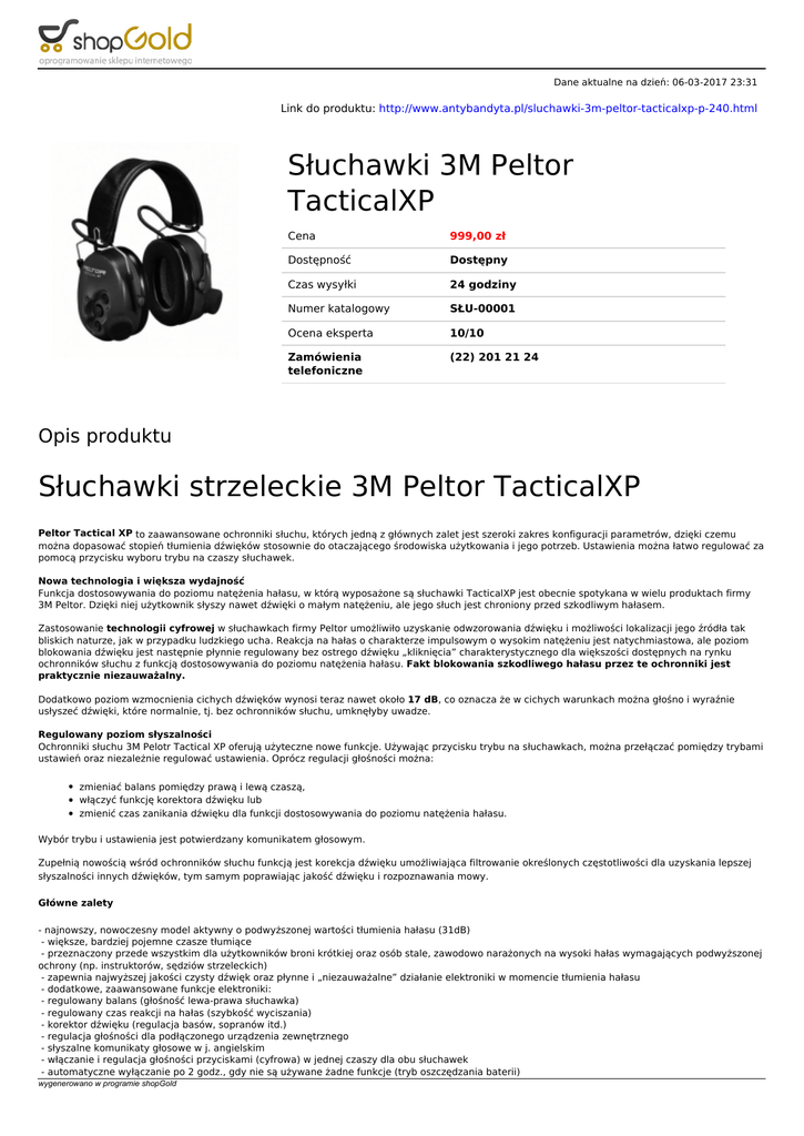 Dane aktualne na dzień: 06-03-2017 23:31 Link do produktu: http://www.antybandyta.pl/sluchawki-3m-peltor-tacticalxp-p-240.html Słuchawki 3M Peltor TacticalXP Cena 999,00 zł Dostępność Dostępny Czas wysyłki 24 godziny Numer katalogowy SŁU-00001 Ocena eksperta 10/10 Zamówienia telefoniczne (22) 201 21 24 Opis produktu Słuchawki strzeleckie 3M Peltor TacticalXP Peltor Tactical XP to zaawansowane ochronniki słuchu, których jedną z głównych zalet jest szeroki zakres konfiguracji parametrów, dzięki czemu można dopasować stopień tłumienia dźwięków stosownie do otaczającego środowiska użytkowania i jego potrzeb. Ustawienia można łatwo regulować za pomocą przycisku wyboru trybu na czaszy słuchawek. Nowa technologia i większa wydajność Funkcja dostosowywania do poziomu natężenia hałasu, w którą wyposażone są słuchawki TacticalXP jest obecnie spotykana w wielu produktach firmy 3M Peltor. Dzięki niej użytkownik słyszy nawet dźwięki o małym natężeniu, ale jego słuch jest chroniony przed szkodliwym hałasem. Zastosowanie technologii cyfrowej w słuchawkach firmy Peltor umożliwiło uzyskanie odwzorowania dźwięku i możliwości lokalizacji jego źródła tak bliskich naturze, jak w przypadku ludzkiego ucha. Reakcja na hałas o charakterze impulsowym o wysokim natężeniu jest natychmiastowa, ale poziom blokowania dźwięku jest następnie płynnie regulowany bez ostrego dźwięku „kliknięcia” charakterystycznego dla większości dostępnych na rynku ochronników słuchu z funkcją dostosowywania do poziomu natężenia hałasu. Fakt blokowania szkodliwego hałasu przez te ochronniki jest praktycznie niezauważalny. Dodatkowo poziom wzmocnienia cichych dźwięków wynosi teraz nawet około 17 dB, co oznacza że w cichych warunkach można głośno i wyraźnie usłyszeć dźwięki, które normalnie, tj. bez ochronników słuchu, umknęłyby uwadze. Regulowany poziom słyszalności Ochronniki słuchu 3M Pelotr Tactical XP oferują użyteczne nowe funkcje. Używając przycisku trybu na słuchawkach, można przełączać pomiędzy trybami ustawień oraz niezależnie regulować ustawienia. Oprócz regulacji głośności można: zmieniać balans pomiędzy prawą i lewą czaszą, włączyć funkcję korektora dźwięku lub zmienić czas zanikania dźwięku dla funkcji dostosowywania do poziomu natężenia hałasu. Wybór trybu i ustawienia jest potwierdzany komunikatem głosowym. Zupełnią nowością wśród ochronników słuchu funkcją jest korekcja dźwięku umożliwiająca filtrowanie określonych częstotliwości dla uzyskania lepszej słyszalności innych dźwięków, tym samym poprawiając jakość dźwięku i rozpoznawania mowy. Główne zalety - najnowszy, nowoczesny model aktywny o podwyższonej wartości tłumienia hałasu (31dB) - większe, bardziej pojemne czasze tłumiące - przeznaczony przede wszystkim dla użytkowników broni krótkiej oraz osób stale, zawodowo narażonych na wysoki hałas wymagających podwyższonej ochrony (np. instruktorów, sędziów strzeleckich) - zapewnia najwyższej jakości czysty dźwięk oraz płynne i „niezauważalne” działanie elektroniki w momencie tłumienia hałasu - dodatkowe, zaawansowane funkcje elektroniki: - regulowany balans (głośność lewa-prawa słuchawka) - regulowany czas reakcji na hałas (szybkość wyciszania) - korektor dźwięku (regulacja basów, sopranów itd.) - regulacja głośności dla podłączonego urządzenia zewnętrznego - słyszalne komunikaty głosowe w j. angielskim - włączanie i regulacja głośności przyciskami (cyfrowa) w jednej czaszy dla obu słuchawek - automatyczne wyłączanie po 2 godz., gdy nie są używane żadne funkcje (tryb oszczędzania baterii) wygenerowano w programie shopGold - sygnał informujący o słabym stanie baterii zapamiętywanie ostatnich ustawień po wyłączeniu możliwość podłączenia urządzenia audio: radiotelefonu (krótkofalówki), radiostacji, tel. komórkowego, odtwarzacza muzyki nowy, komfortowy, regulowany na wysokość, składany pałąk charakterystyczna stalowa sprężyna pałąka gwarantuje stały nacisk i tłumienieznak CE, norma EN352 2 baterie typu R6 (AA) montowane tylko w jednej czaszy, z zewnątrz czas pracy aż 1000 godz. waga 400 g. tłumienie średnie SNR 31dB dostępny kolor: czarny Zestaw zawiera: - Słuchawki bez mikrofonu - Baterie - Instrukcję wygenerowano w programie shopGold Powered by TCPDF (www.tcpdf.org)