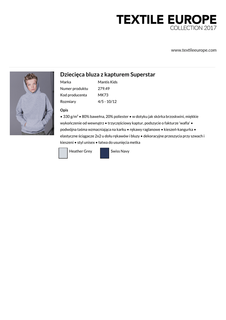 Dziecięca bluza z kapturem Superstar Marka Mantis Kids Numer produktu 279.49 Kod producenta MK73 Rozmiary 4/5 - 10/12 Opis • 330 g/m² • 80% bawełna, 20% poliester • w dotyku jak skórka brzoskwini, miękkie wykończenie od wewnątrz • trzyczęściowy kaptur, podszycie o fakturze 'wafla' • podwójna taśma wzmacniająca na karku • rękawy raglanowe • kieszeń-kangurka • elastyczne ściągacze 2x2 u dołu rękawów i bluzy • dekoracyjne przeszycia przy szwach i kieszeni • styl unisex • łatwa do usunięcia metka Heather Grey Swiss Navy