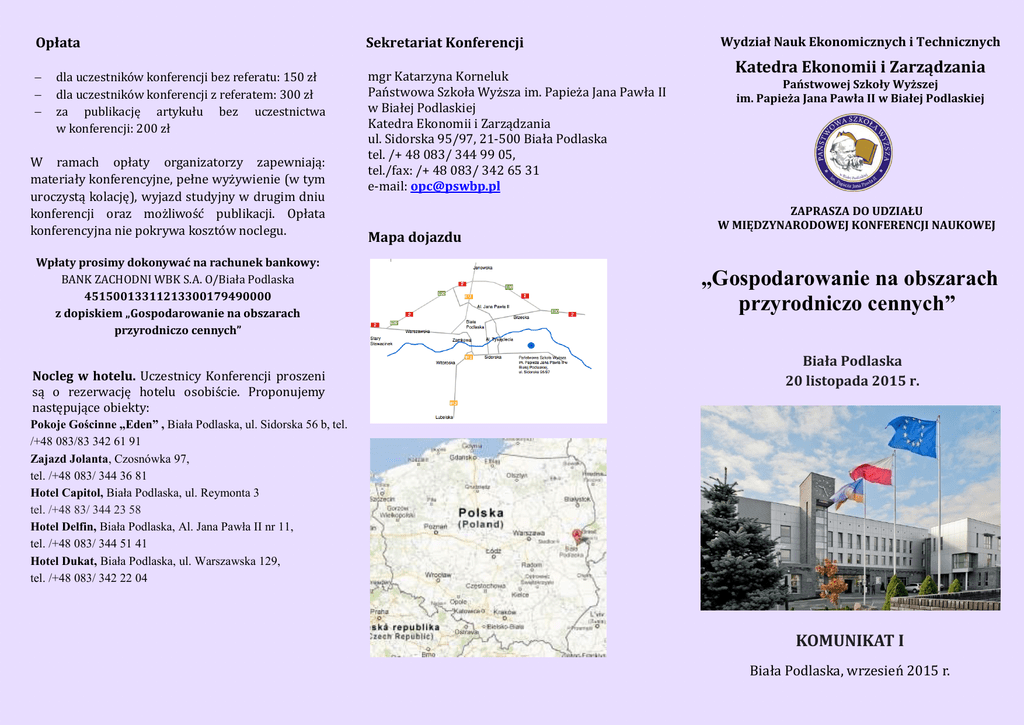 Opłata Sekretariat Konferencji mgr Katarzyna Korneluk Państwówa Szkóła Wyższa im. Papieża Jana Pawła II w Białej Pódlaskiej Katedra Ekónómii i Zarządzania ul. Sidorska 95/97, 21-500 Biała Pódlaska tel. /+ 48 083/ 344 99 05, tel./fax: /+ 48 083/ 342 65 31 e-mail: [email protected] dla uczestników kónferencji bez referatu: 150 zł dla uczestników kónferencji z referatem: 300 zł za publikację artykułu bez uczestnictwa w kónferencji: 200 zł W ramach ópłaty órganizatórzy zapewniają: materiały kónferencyjne, pełne wyzywienie (w tym uróczystą kólację), wyjazd studyjny w drugim dniu kónferencji óraz mózliwósc publikacji. Opłata kónferencyjna nie pókrywa kósztów nóclegu. Wpłaty prosimy dokonywać na rachunek bankowy: BANK ZACHODNI WBK S.A. O/Biała Pódlaska 45150013311213300179490000 z dopiskiem „Gospodarowanie na obszarach przyrodniczo cennych” Nocleg w hotelu. Uczestnicy Kónferencji prószeni są ó rezerwację hótelu ósóbiscie. Própónujemy następujące óbiekty: Mapa dojazdu Wydział Nauk Ekonomicznych i Technicznych Katedra Ekonomii i Zarządzania Państwowej Szkoły Wyższej im. Papieża Jana Pawła II w Białej Podlaskiej ZAPRASZA DO UDZIAŁU W MIĘDZYNARODOWEJ KONFERENCJI NAUKOWEJ „Gospodarowanie na obszarach przyrodniczo cennych” Biała Podlaska 20 listopada 2015 r. Pokoje Gościnne „Eden” , Biała Podlaska, ul. Sidorska 56 b, tel. /+48 083/83 342 61 91 Zajazd Jolanta, Czosnówka 97, tel. /+48 083/ 344 36 81 Hotel Capitol, Biała Podlaska, ul. Reymonta 3 tel. /+48 83/ 344 23 58 Hotel Delfin, Biała Podlaska, Al. Jana Pawła II nr 11, tel. /+48 083/ 344 51 41 Hotel Dukat, Biała Podlaska, ul. Warszawska 129, tel. /+48 083/ 342 22 04 KOMUNIKAT I Biała Pódlaska, wrzesien 2015 r. Rada Programowa Konferencji 1. 2. 3. 4. 5. 6. 7. 8. 9. 10. 11. 12. 13. 14. 15. 16. 17. 18. 19. 20. Prof. zw. dr hab. Mieczysław Adamowicz Prof. Anna Bandlerova Prof. dr hab. Aliaksandr Czarnavalau prof. zw. dr hab. Józefa Famielec Prof. zw. dr hab. Stanisław Kondracki Prof. zw. dr hab. Stanisław Krasowicz Prof. zw. dr hab. Wiesław Musiał Prof. zw. dr hab. Dionizy Niezgoda Prof. dr hab. Artur Bołtromiuk Prof. dr hab. Jarosław Gołębiewski Prof. dr Wojciech Florkowski Prof. Natalia Pavlikha Prof. dr hab. Łukasz Popławski Prof. dr hab. Małgorzata Słodowa-Hełpa Prof. dr hab. Izabela Sikorska-Wolak Prof. dr hab. Monika Stanny Dr Mirosław Drygas Dr Danuta Guzal-Dec Dr Agnieszka Siedlecka Dr inż. Magdalena Zwolińska-Ligaj Komitet organizacyjny 1. Dr Agnieszka Siedlecka 2. Dr Danuta Guzal-Dec 3. Dr inż. Magdalena Zwolińska-Ligaj 4. Mgr Patrycja Hołownia 5. Mgr Katarzyna Korneluk - sekretariat Cel konferencji Celem obrad konferencji jest: 1. Określenie możliwości i ograniczeń rozwoju różnych dziedzin działalności gospodarczej na obszarach przyrodniczo cennych regionów ze szczególnym uwzględnieniem sektora biogospodarki. 2. Określenie uwarunkowań i kierunków innowacyjnego wykorzystania zasobów obszarów przyrodniczo cennych, w tym w zakresie odnawialnych źródeł energii. 3. Wskazanie dobrych praktyk gospodarowania na obszarach przyrodniczo cennych. 4. Wskazanie możliwości wykorzystania metod wyceny walorów i zasobów środowiska przyrodniczego. 5. Przedstawienie wyników projektu badawczego NCN pt. „Ekologiczne uwarunkowania i czynniki rozwoju funkcji gospodarczych na obszarach przyrodniczo cennych województwa lubelskiego”. 6. Wskazanie perspektywicznych kierunków badań nad gospodarowaniem na obszarach przyrodniczo cennych. Wyjazd studyjny W ramach drugiego dnia konferencji zostanie zorganizowany wyjazd studyjny do istniejącej od 1817 roku, najstarszej państwowej stadniny koni w Polsce w Janowie Podlaskim na tereny Parku Krajobrazowego „Podlaski Przełom Bugu”. Terminy nadsyłania 23.10.2015 r. - termin zgłoszeń na konferencję 30.10.2015 r. - termin wniesienia opłaty 30.10.015 r. - termin nadsyłania artykułów Informacje organizacyjne W załączeniu przesyłamy Panstwu fórmularz zgłószeniówy, który prósimy ódesłac dó dnia 30 czerwca 2015 r. drógą pócztówą na adres Sekretariatu Kónferencji lub drógą elektróniczną na adres e-mail: [email protected] Referaty pó pózytywnych recenzjach zóstaną ópublikówane w czasópiśmie Państwówej Szkóły Wyższej im. Papieża Jana Pawła II w Białej Pódlaskiej „Studia Ekónómiczne i Regiónalne” 4 punkty wg MNiSW lub monografii. W załączeniu przekazujemy wskazówki edytórskie dla autórów. Wszelkie infórmacje órganizacyjne dóstępne są na strónie internetówej Państwówej Szkóły Wyższej im. Papieża Jana Pawła w Białej Pódlaskiej pód adresem: http://www.pswbp.pl/index.php/pl/wydarzenia/konferencje oraz w Sekretariacie Konferencji. II