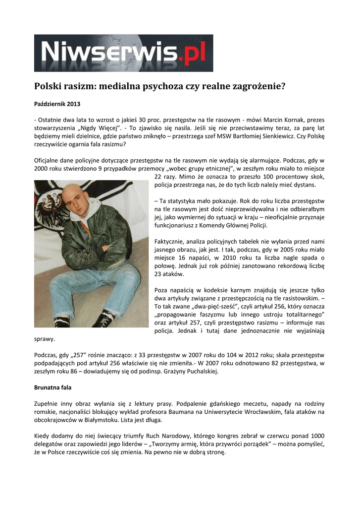 Polski rasizm: medialna psychoza czy realne zagrożenie? Październik 2013 - Ostatnie dwa lata to wzrost o jakieś 30 proc. przestępstw na tle rasowym - mówi Marcin Kornak, prezes stowarzyszenia „Nigdy Więcej”. - To zjawisko się nasila. Jeśli się nie przeciwstawimy teraz, za parę lat będziemy mieli dzielnice, gdzie państwo zniknęło – przestrzega szef MSW Bartłomiej Sienkiewicz. Czy Polskę rzeczywiście ogarnia fala rasizmu? Oficjalne dane policyjne dotyczące przestępstw na tle rasowym nie wydają się alarmujące. Podczas, gdy w 2000 roku stwierdzono 9 przypadków przemocy „wobec grupy etnicznej”, w zeszłym roku miało to miejsce 22 razy. Mimo że oznacza to przeszło 100 procentowy skok, policja przestrzega nas, że do tych liczb należy mieć dystans. – Ta statystyka mało pokazuje. Rok do roku liczba przestępstw na tle rasowym jest dość nieprzewidywalna i nie odbierałbym jej, jako wymiernej do sytuacji w kraju – nieoficjalnie przyznaje funkcjonariusz z Komendy Głównej Policji. Faktycznie, analiza policyjnych tabelek nie wyłania przed nami jasnego obrazu, jak jest. I tak, podczas, gdy w 2005 roku miało miejsce 16 napaści, w 2010 roku ta liczba nagle spada o połowę. Jednak już rok później zanotowano rekordową liczbę 23 ataków. Poza napaścią w kodeksie karnym znajdują się jeszcze tylko dwa artykuły związane z przestępczością na tle rasistowskim. – To tak zwane „dwa-pięć-sześć”, czyli artykuł 256, który oznacza „propagowanie faszyzmu lub innego ustroju totalitarnego” oraz artykuł 257, czyli przestępstwo rasizmu – informuje nas policja. Jednak i tutaj dane jednoznacznie nie wyjaśniają sprawy. Podczas, gdy „257” rośnie znacząco: z 33 przestępstw w 2007 roku do 104 w 2012 roku; skala przestępstw podpadających pod artykuł 256 właściwie się nie zmieniła.- W 2007 roku odnotowano 82 przestępstwa, w zeszłym roku 86 – dowiadujemy się od podinsp. Grażyny Puchalskiej. Brunatna fala Zupełnie inny obraz wyłania się z lektury prasy. Podpalenie gdańskiego meczetu, napady na rodziny romskie, nacjonaliści blokujący wykład profesora Baumana na Uniwersytecie Wrocławskim, fala ataków na obcokrajowców w Białymstoku. Lista jest długa. Kiedy dodamy do niej świecący triumfy Ruch Narodowy, którego kongres zebrał w czerwcu ponad 1000 delegatów oraz zapowiedzi jego liderów – „Tworzymy armię, która przywróci porządek” – można pomyśleć, że w Polsce rzeczywiście coś się zmienia. Na pewno nie w dobrą stronę. Skoro jednak te rewelacje nie znajdują odzwierciedlenia w dokumentach policyjnych, czy nie mamy po prostu do czynienia ze zbiorową psychozą? Może media rozdmuchują problem na własne potrzeby? Z takim postawieniem sprawy całkowicie nie zgadza się Marcin Kornak, prezes stowarzyszenia Nigdy Więcej, które od 1996 roku monitoruje zjawisko rasizmu w kraju. – Przestępstwa na tle rasowym to teraz prawdziwa plaga – twierdzi Kornak. I jak dodaje: „Ta konstatacja jest oparta o dane od lat zbierane przez naszą organizację do raportu Brunatna Księga, w którym odnotowujemy wszystkie krajowe incydenty o charakterze rasistowskim.” Zdaniem Kornaka ostatnie dwa lata przyniosły 30 proc. wzrost przestępstw na tle rasowym. Podczas, gdy edycja Brunatnej Księgi z lat 2009-2010 raportuje 400 incydentów, w okresie od 2011 do 2012 roku zanotowano przeszło 600 tego typu przypadków. Najbardziej negatywnym wnioskiem nasuwającym się z lektury raportu Nigdy Więcej, jest wzrost napaści fizycznych. – Sprawy dotyczą pobić, a nawet zabójstw, którego to problemu nie mieliśmy w kraju od kilku lat – wylicza Kornak. Zaniepokojone mniejszości Podobnie na kwestię patrzy Krzysztof Izdebski, członek zarządu Gminy Wyznaniowej Żydowskiej w Warszawie: „Nastąpił wzrost agresji, zwłaszcza agresji słownej, która przybiera zatrważające rozmiary.” Przykładem mogą być dziesiątki listów kierowanych do GWŻ i setki, jeśli nie tysiące obraźliwych komentarzy w internecie formułowanych przy okazji debaty na temat zakazu uboju rytualnego – tłumaczy. O ile GWŻ podkreśla, że agresja fizyczna dotyka jej członków rzadko, dla polskich Romów jest ona realnym zagrożeniem. – Z roku na rok ataki są coraz śmielsze i bardziej bezpośrednie – wyjaśnia Roman Chojnacki, prezes Związku Romów Polskich. Jego zdaniem środowiska, które dokonują aktów agresji stają się nie tylko bardziej aktywne, ale i znacznie lepiej zorganizowane. – Te grupy działają w sposób przemyślany, a swoje ataki dokładnie planują – twierdzi. Również Kornak zauważa lepsze zorganizowanie polskich grup rasistowskich. - Dzisiaj za tego typu czyny jest odpowiedzialne jedno, dobrze zorganizowane środowisko. O ile kiedyś różnicowanie na pseudokibiców, skinów czy neofaszystów miało większy sens, to dzisiaj już nie za bardzo, gdyż te grupy działają wspólnie – opowiada. Puste kartoteki Skoro, jednak polskie mniejszości etniczne oraz organizacje pozarządowe postrzegają rasizm, jako niebezpieczne, nasilające się w szybkim tempie zjawisko; dlaczego nie widzimy tego w statystykach policji? Zdaniem Izdebskiego wynika to z braku zaufania do policji. Identyczne zdanie ma Chojnacki, który podkreśla, że tylko cząstka napadów na społeczność Romską jest zgłaszana mundurowym. – Dzieje się tak ze względu na bardzo niski poziom zaufania Romów do tej instytucji – tłumaczy. Drugą przyczyną, na którą wskazują nasi rozmówcy jest złe klasyfikowanie przestępstw. - Interwencje funkcjonariuszy, które zostały podjęte z urzędu dość często są procedowane, jako „wybryki chuligańskie”, a nie akty z nienawiści” – mówi Izdebski. - Praktyka przez wiele lat była taka, że gdy np., mundurowi mieli do czynienia z atakiem na grupę studentów o ciemnym kolorze skóry było to kwalifikowane, jako czyn chuligański – wtóruje Kornak. Zdaniem prezesa Nigdy 